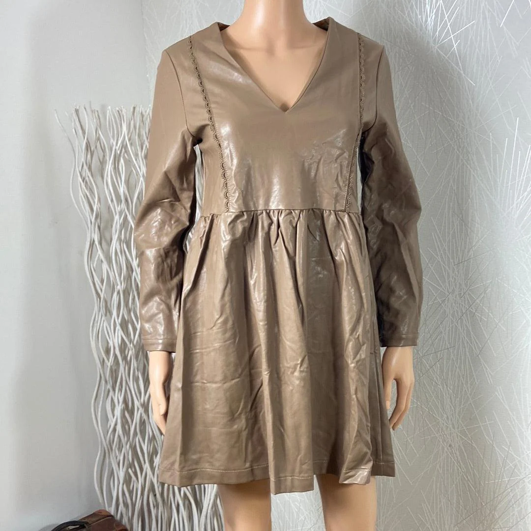 Robe courte brune en cuir synthétique de la marque Love & Co. Manches longues avec bouton, encolure en V, boutons décoratifs dans le dos et de style patineuse. Matière : 60% polyuréthane – 40% coton Couleur : Brun clair Marque : Love & Co Taille S / 36 – Réf : 36NR3351 Dimensions : Largeur […]