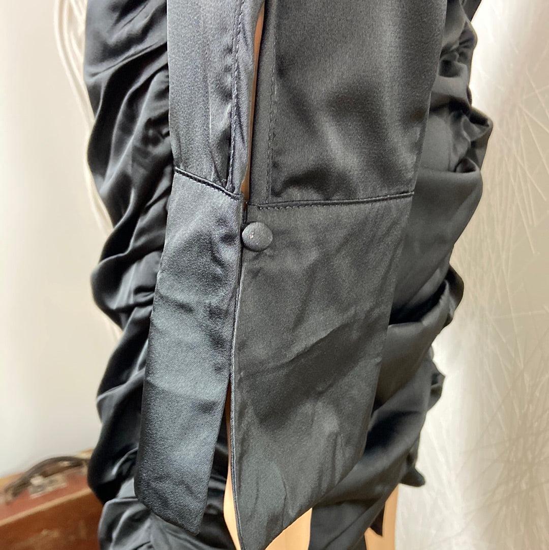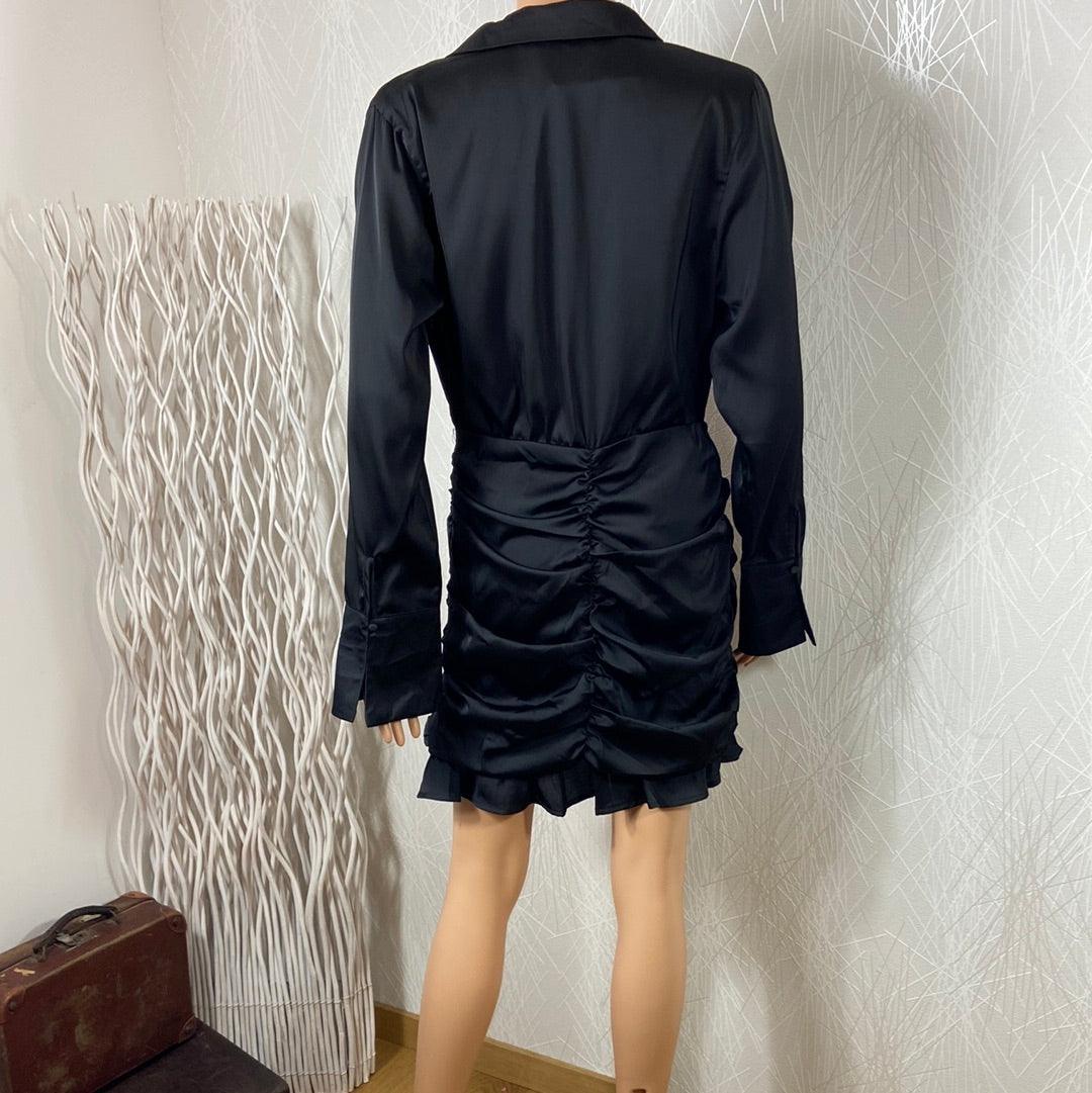 Robe courte noire satinée drapée manches longues Elenza