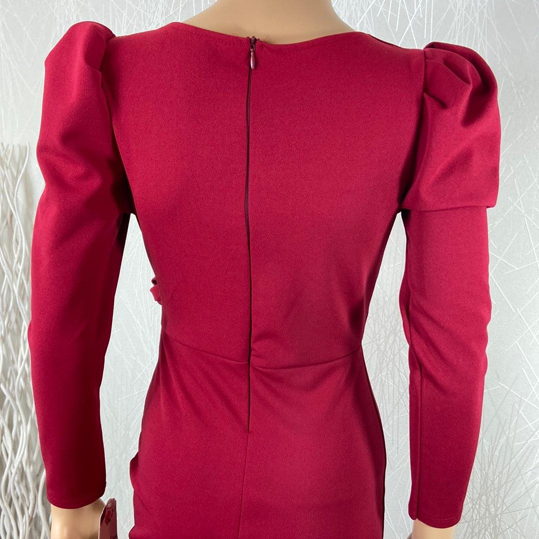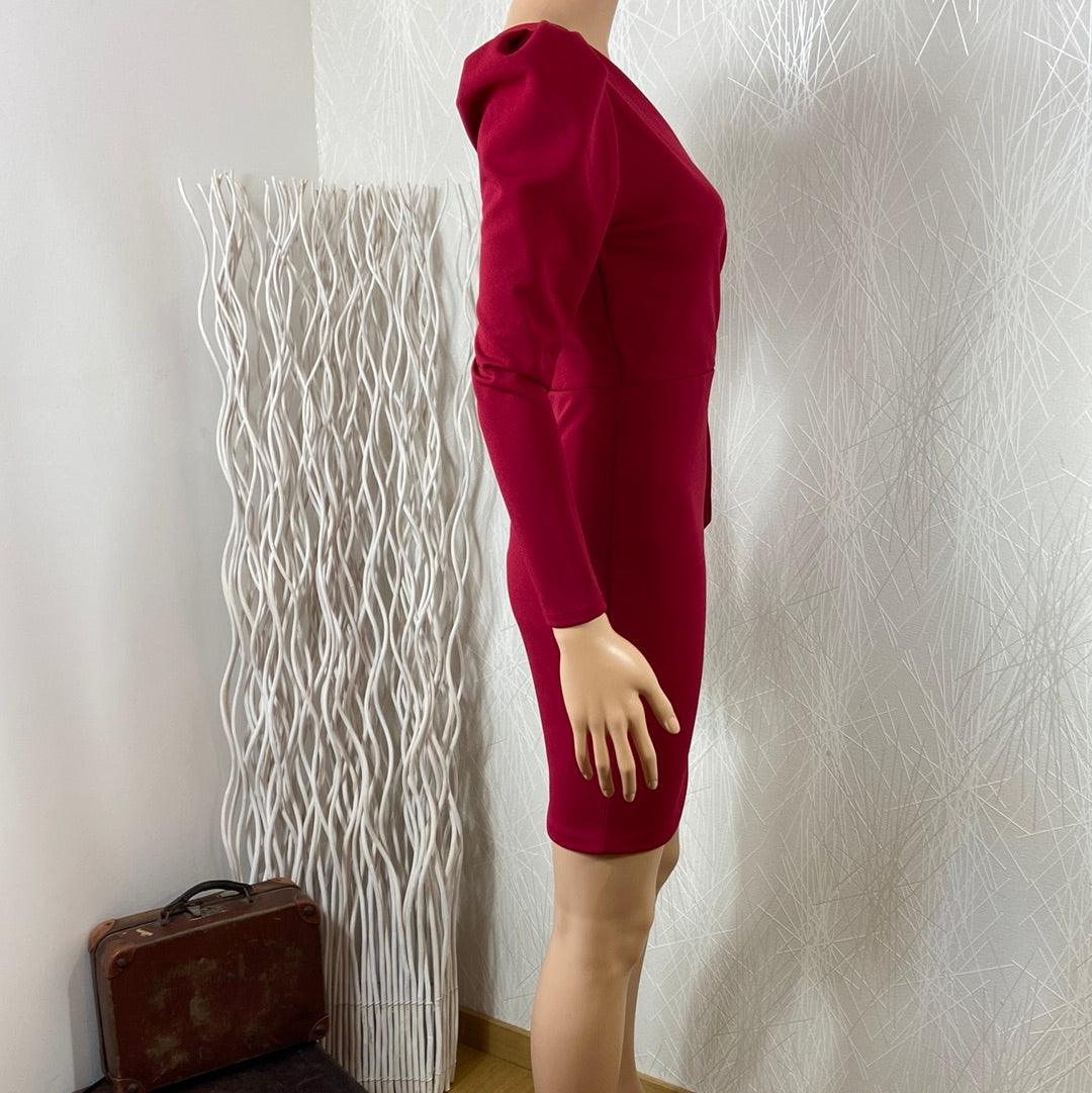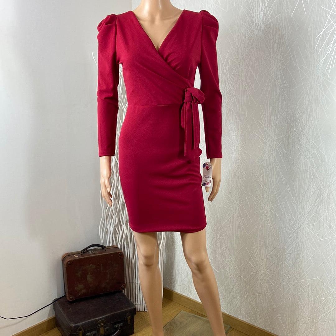 Belle robe courte près du corps de la marque Fashion. Manches longues, encolure en V de style cache coeur, flot décoratif à la taille, forme moulante et fermeture zip dans le dos. Matière : 90% polyester – 10% élasthanne Couleur : Ruge fuchsia Marque : Fashion Taille S / 36 – Réf : 36NR3327 Dimensions […]