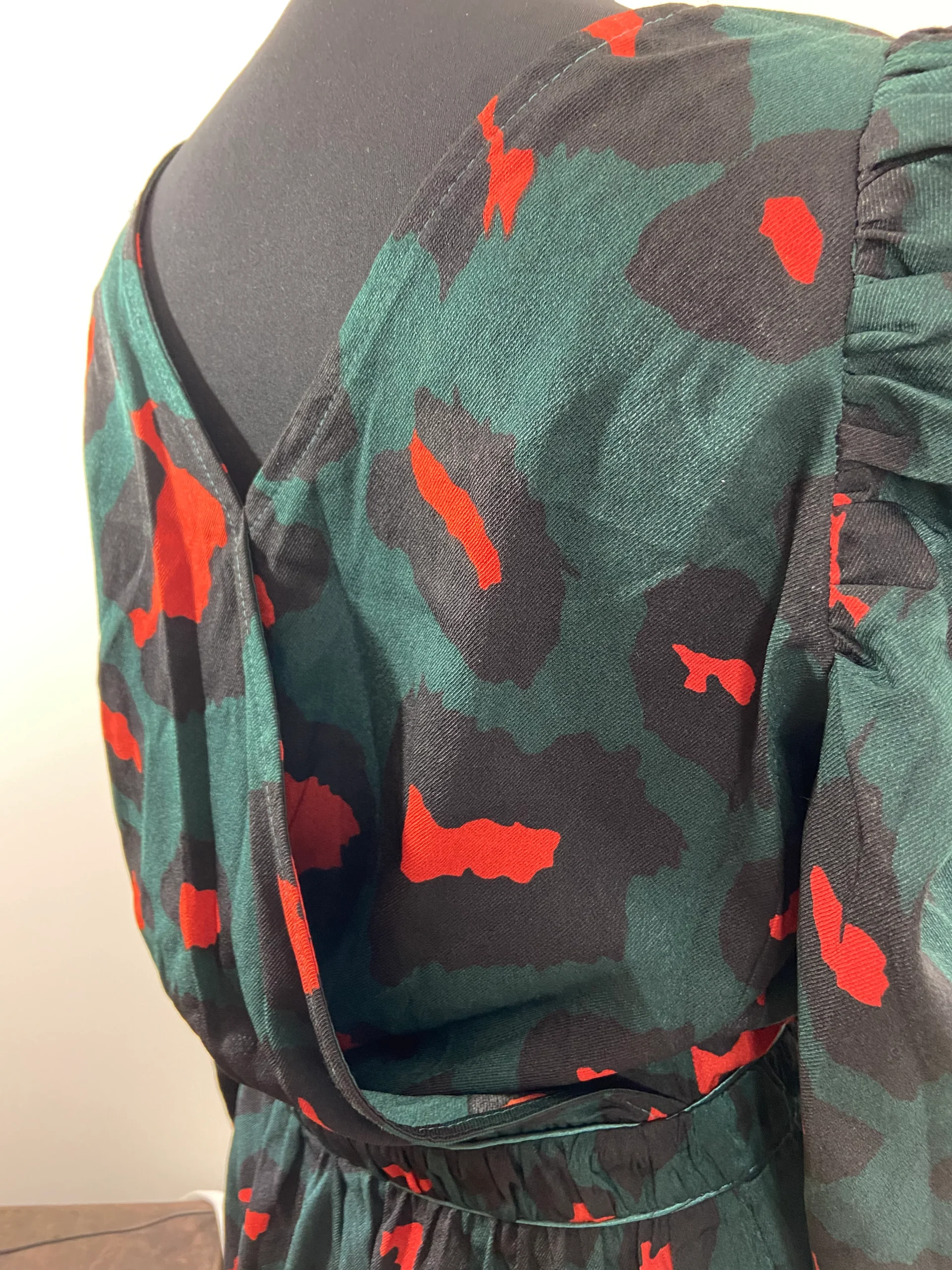 Jolie robe courte de couleur vert bouteille à motifs rouge de la marque Opullence Paris.