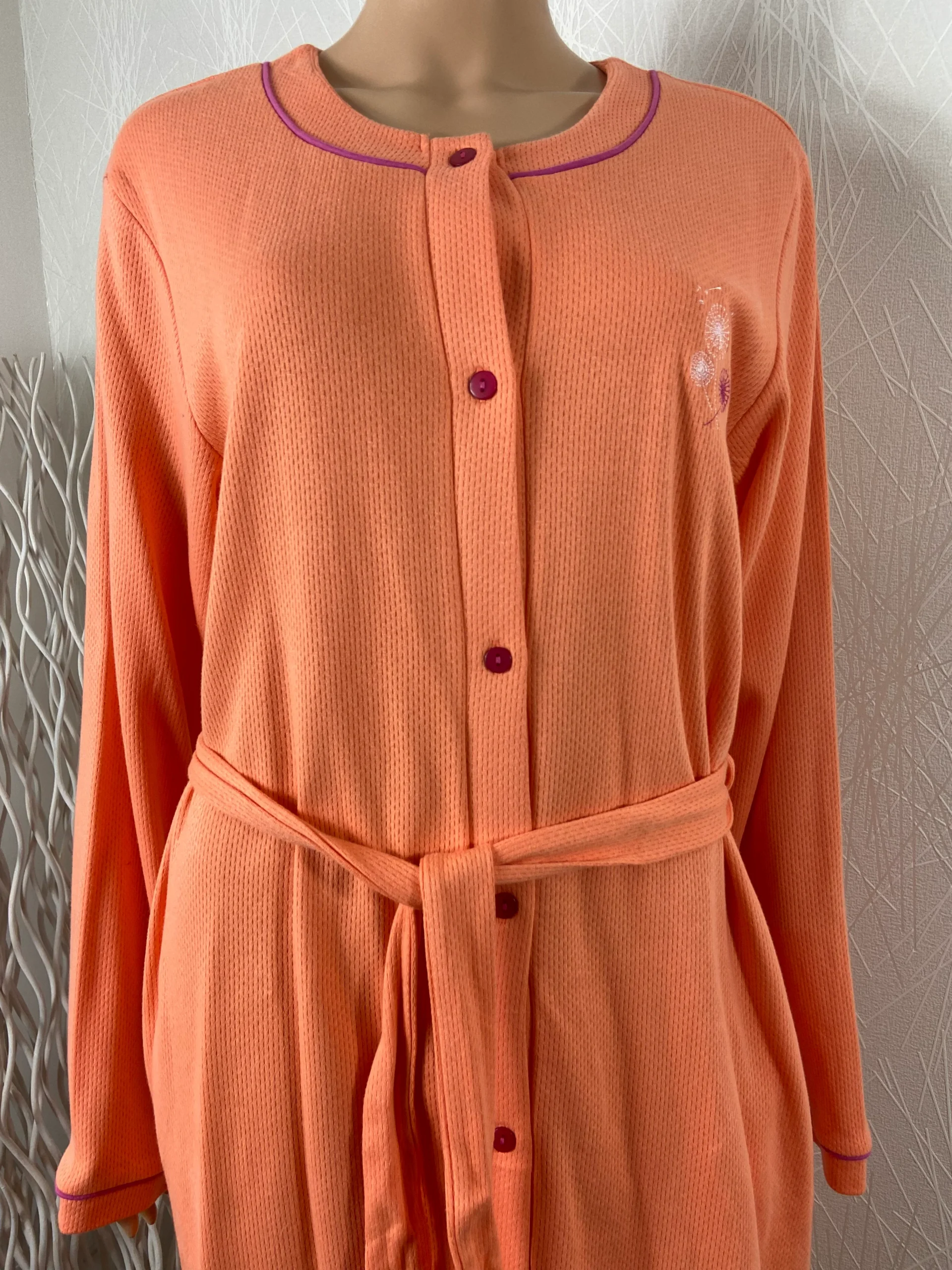 Manches longues, encolure ronde, 2 poches à l’avant, broderie de fleurs sur la poitrine, entièrement boutonnée et ceinture à nouer.