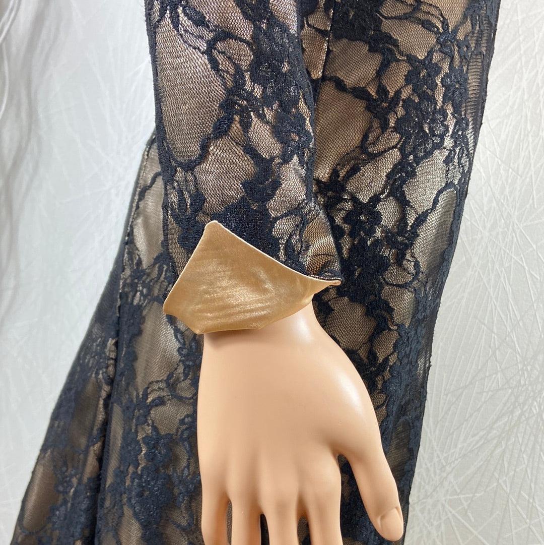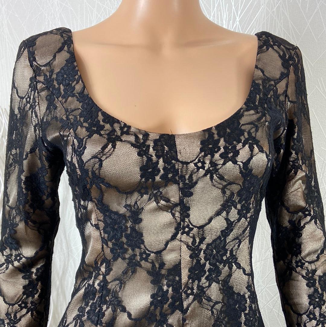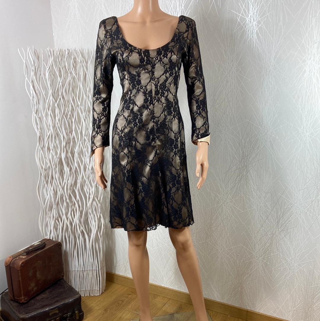 Manches longues, encolure carrée, tissu doré avec dentelle noire, coupe près du corps, tissu doublé et fermeture zip dans le dos.
