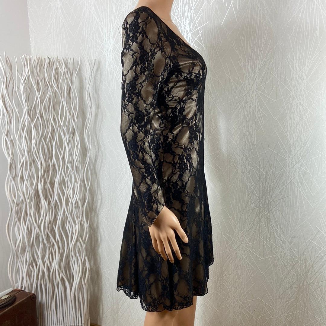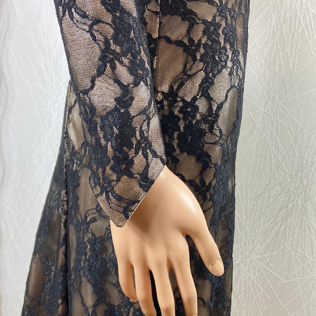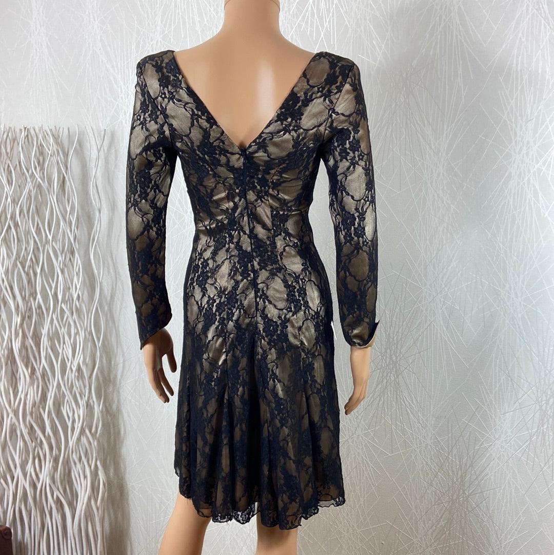 Manches longues, encolure carrée, tissu doré avec dentelle noire, coupe près du corps, tissu doublé et fermeture zip dans le dos.