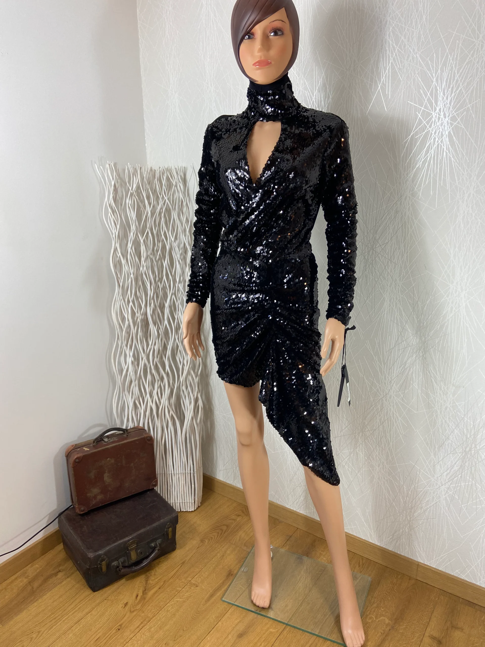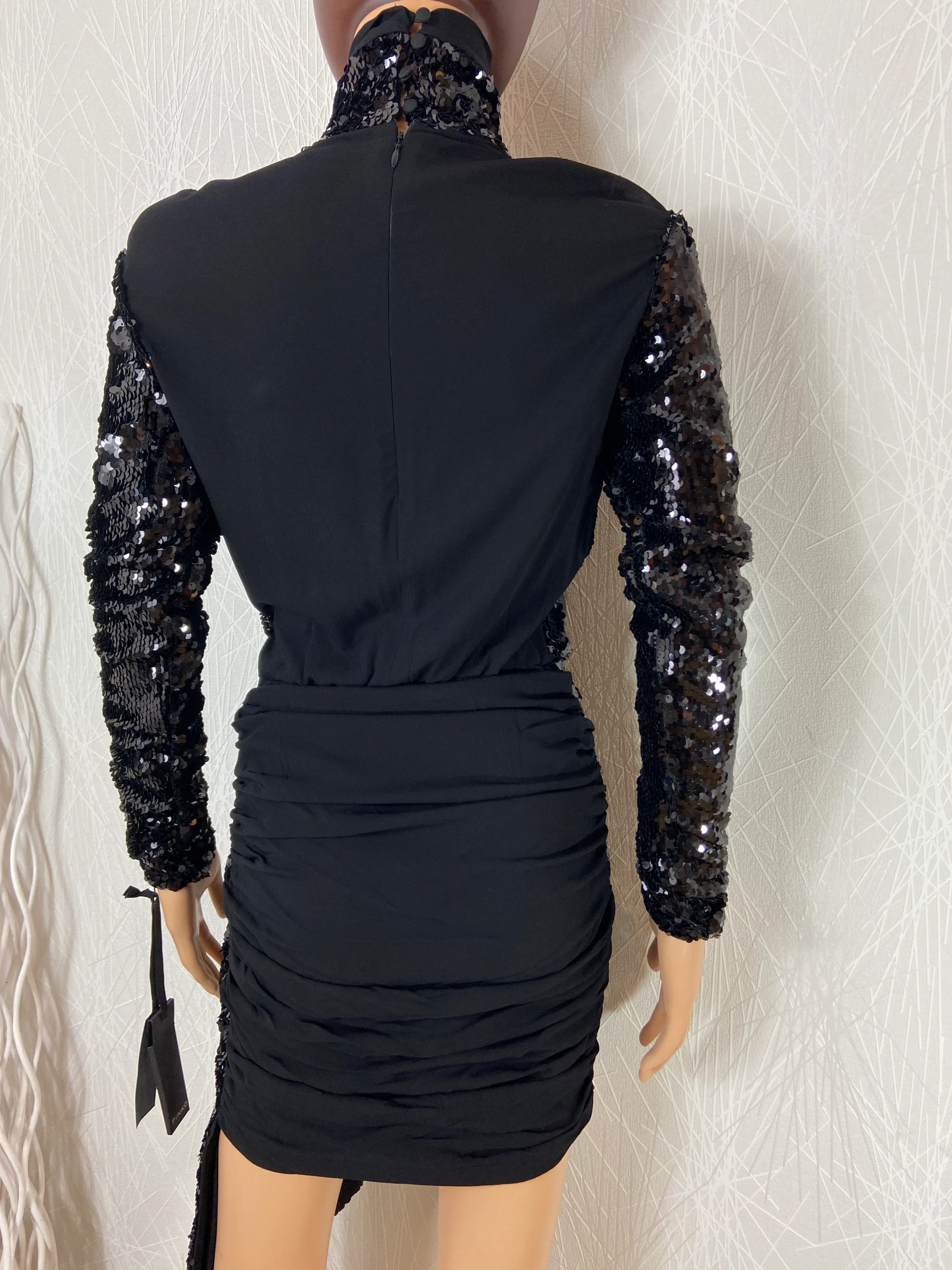 Jolie robe courte de soirée ou cocktail de la marque italienne haut de gamme Pinko. Cette robe noire à sequins a un col roulé et des manches longues. Près du corps, cette jolie robe est entièrement doublée et elle se ferme dans le dos avec une fermeture zippée. Avec sa silhouette cintrée, avec drapé, cette […]