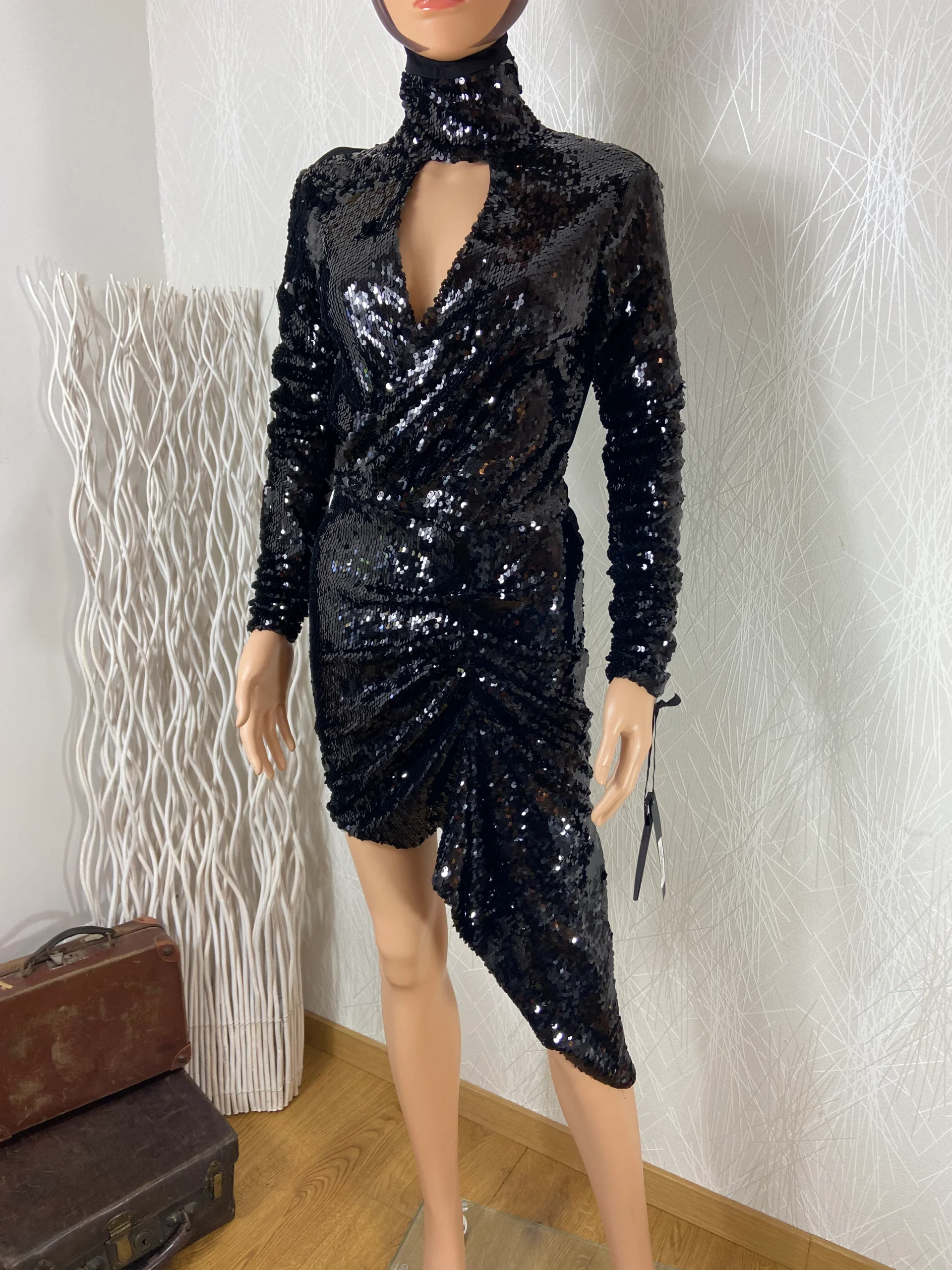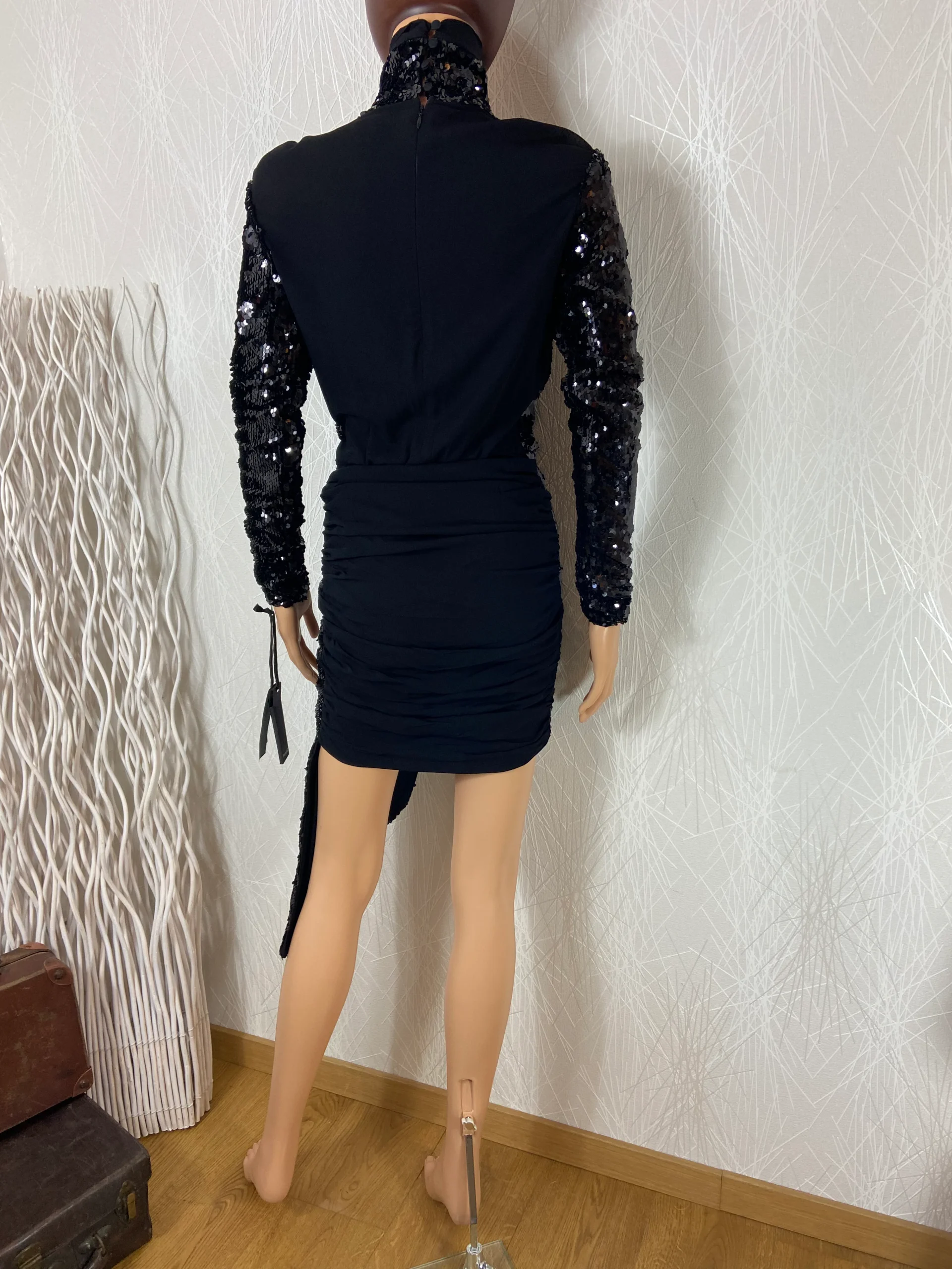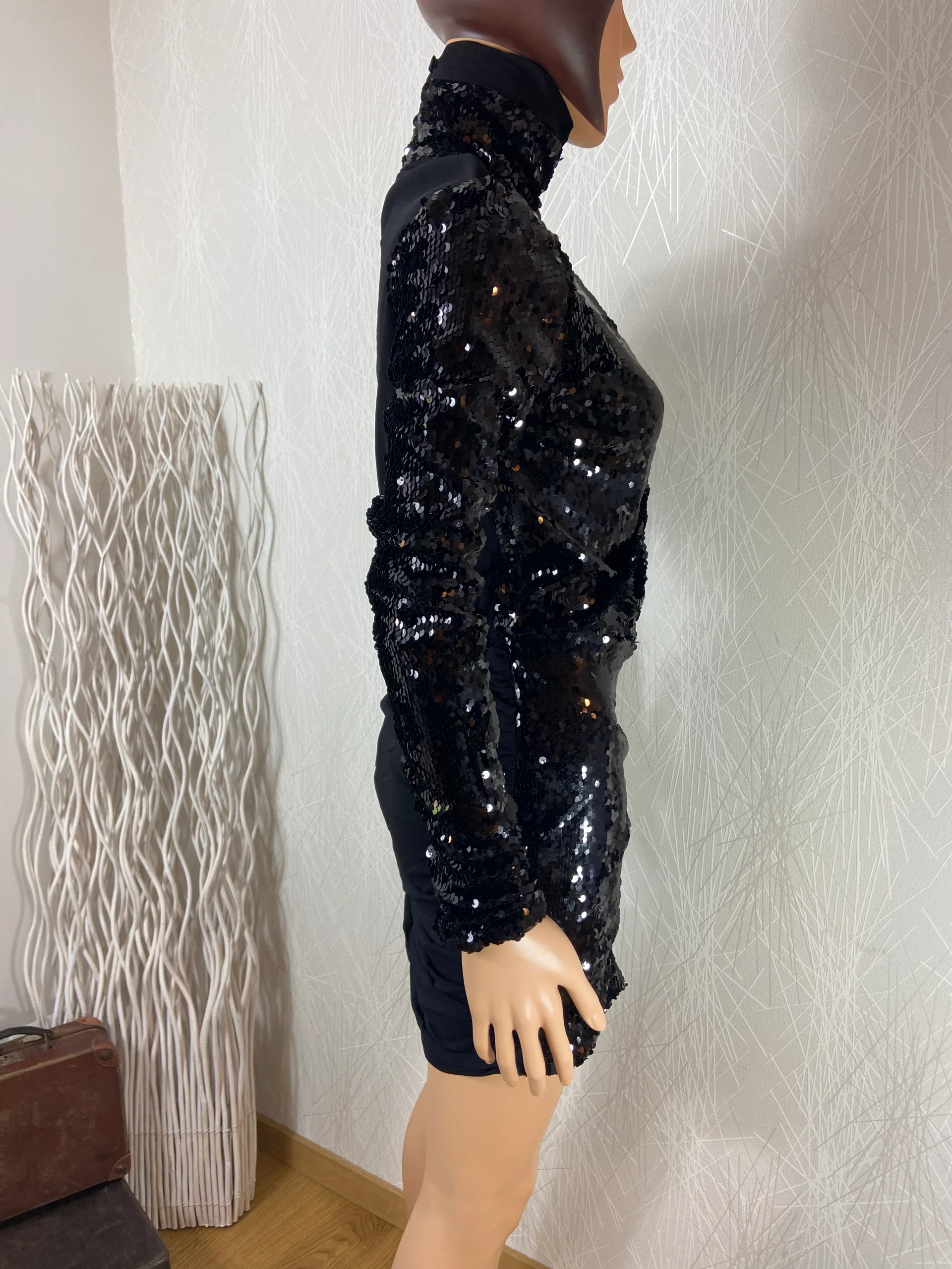 Cette robe noire à sequins a un col roulé et des manches longues.