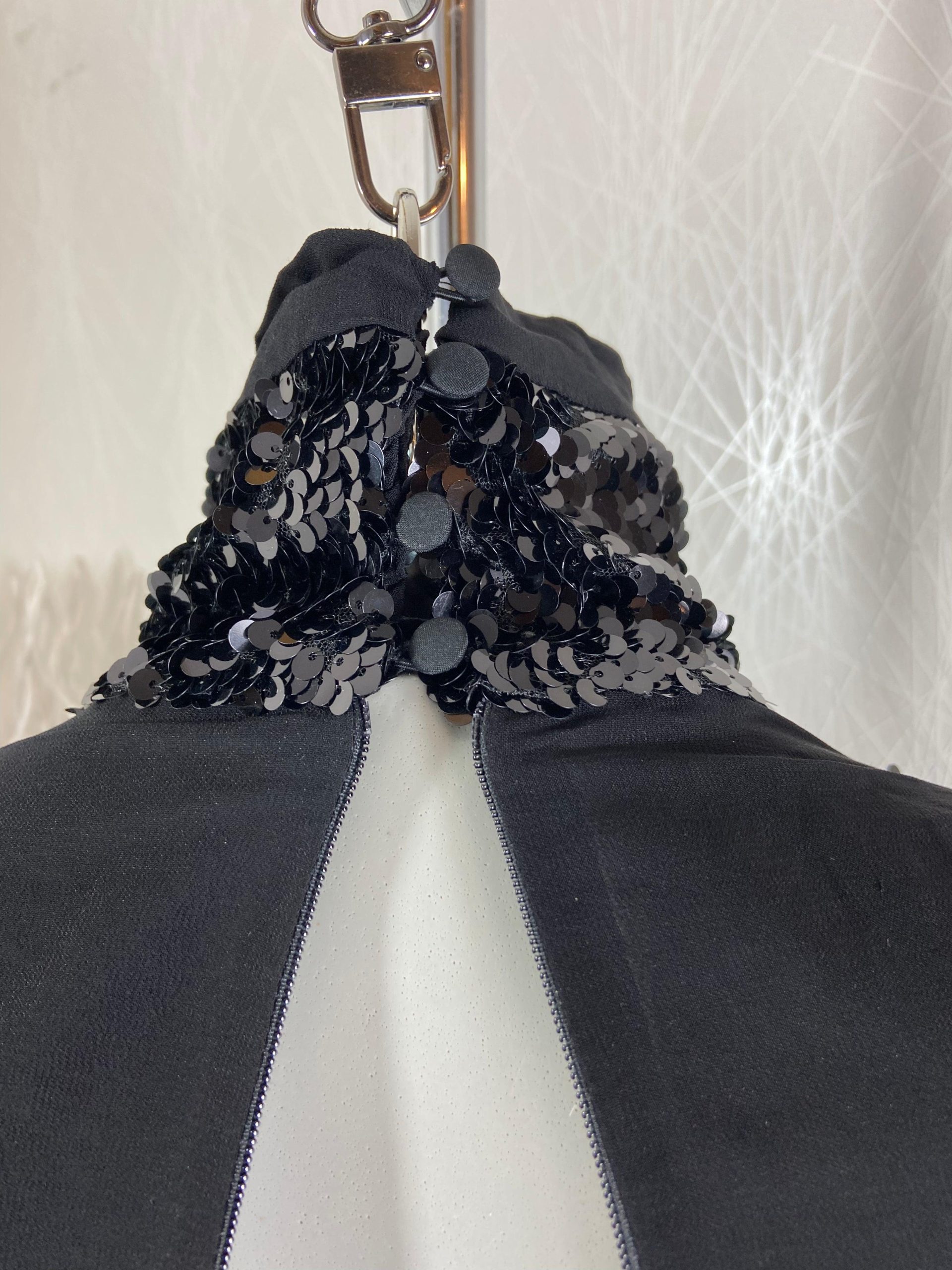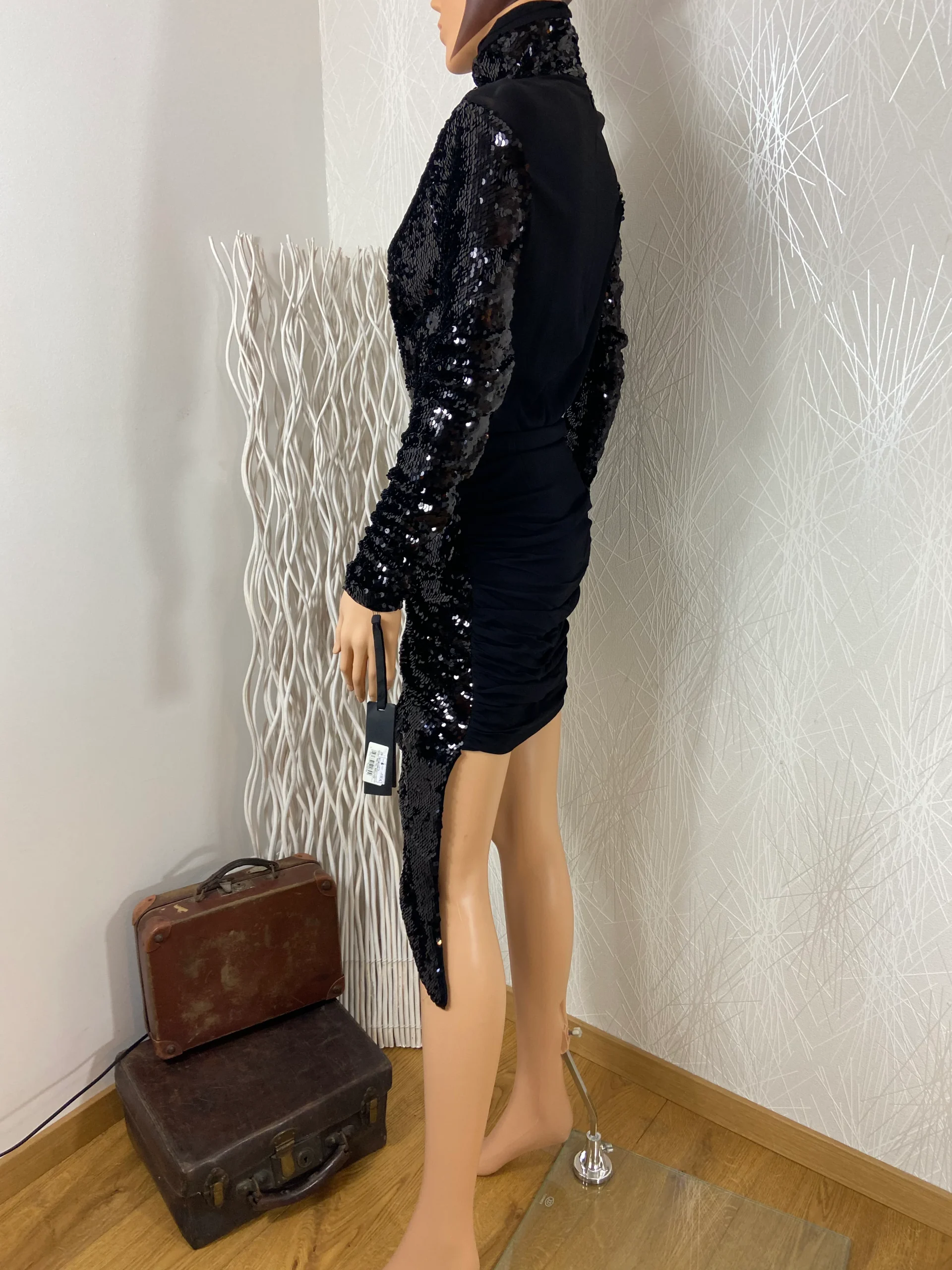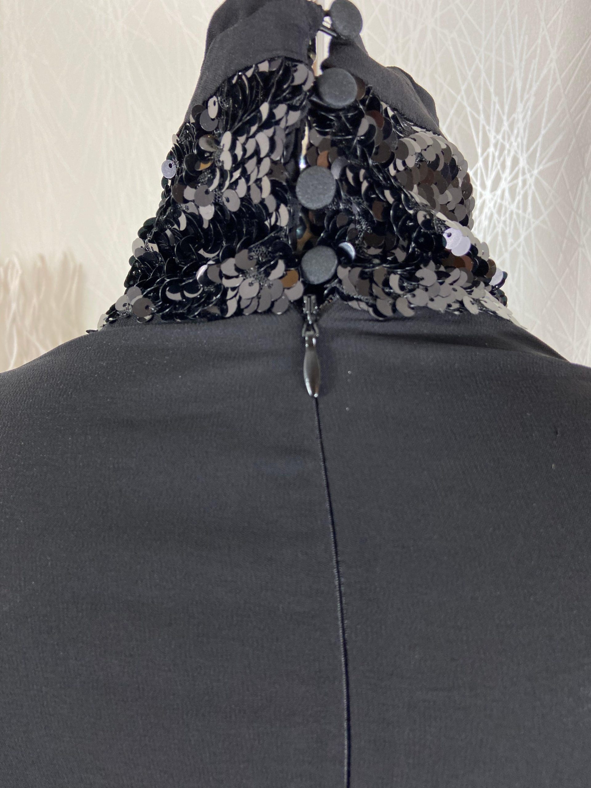 Cette robe noire à sequins a un col roulé et des manches longues.