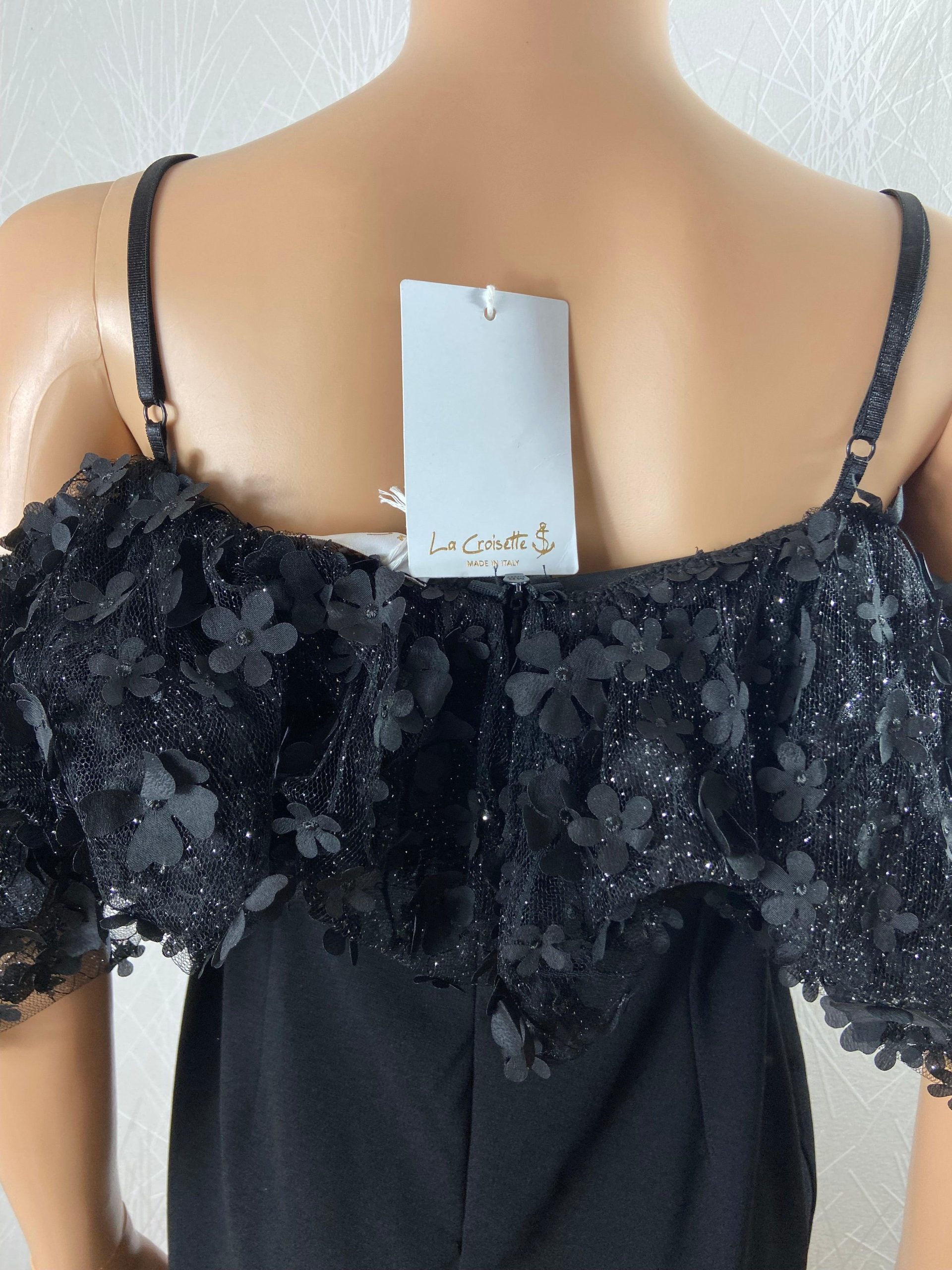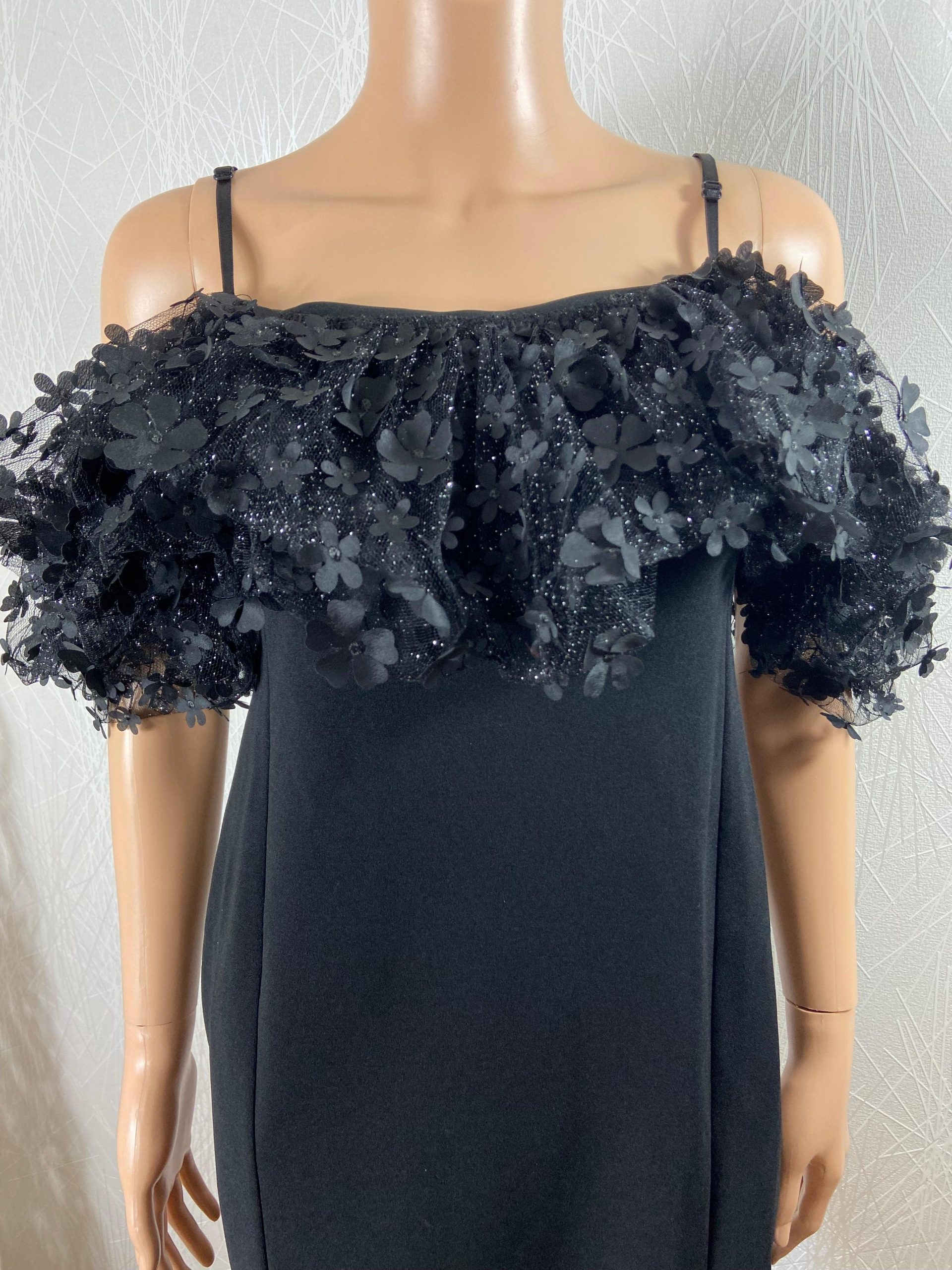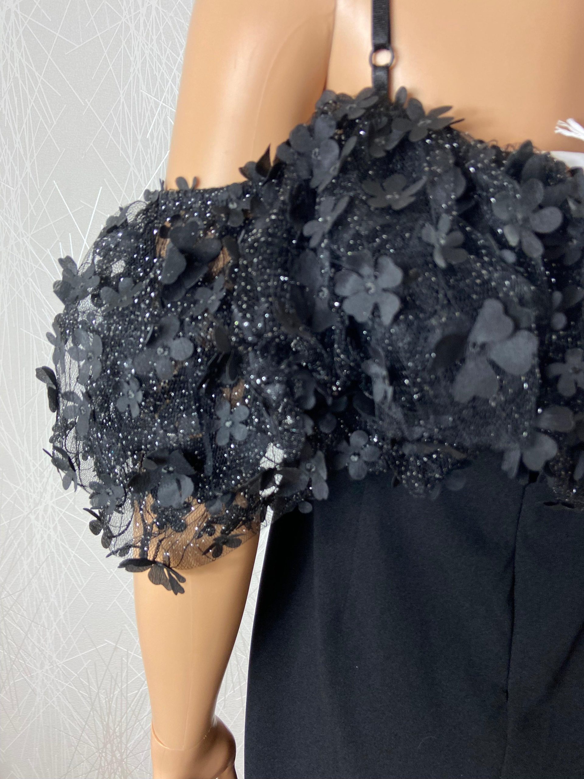 Bretelles réglables, voile noire avec fleurs et paillettes argentées et fermeture zip dans le dos.