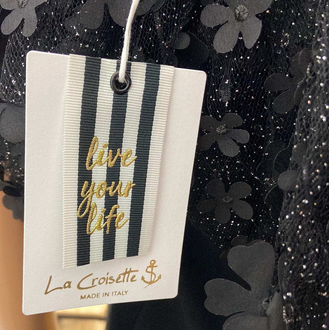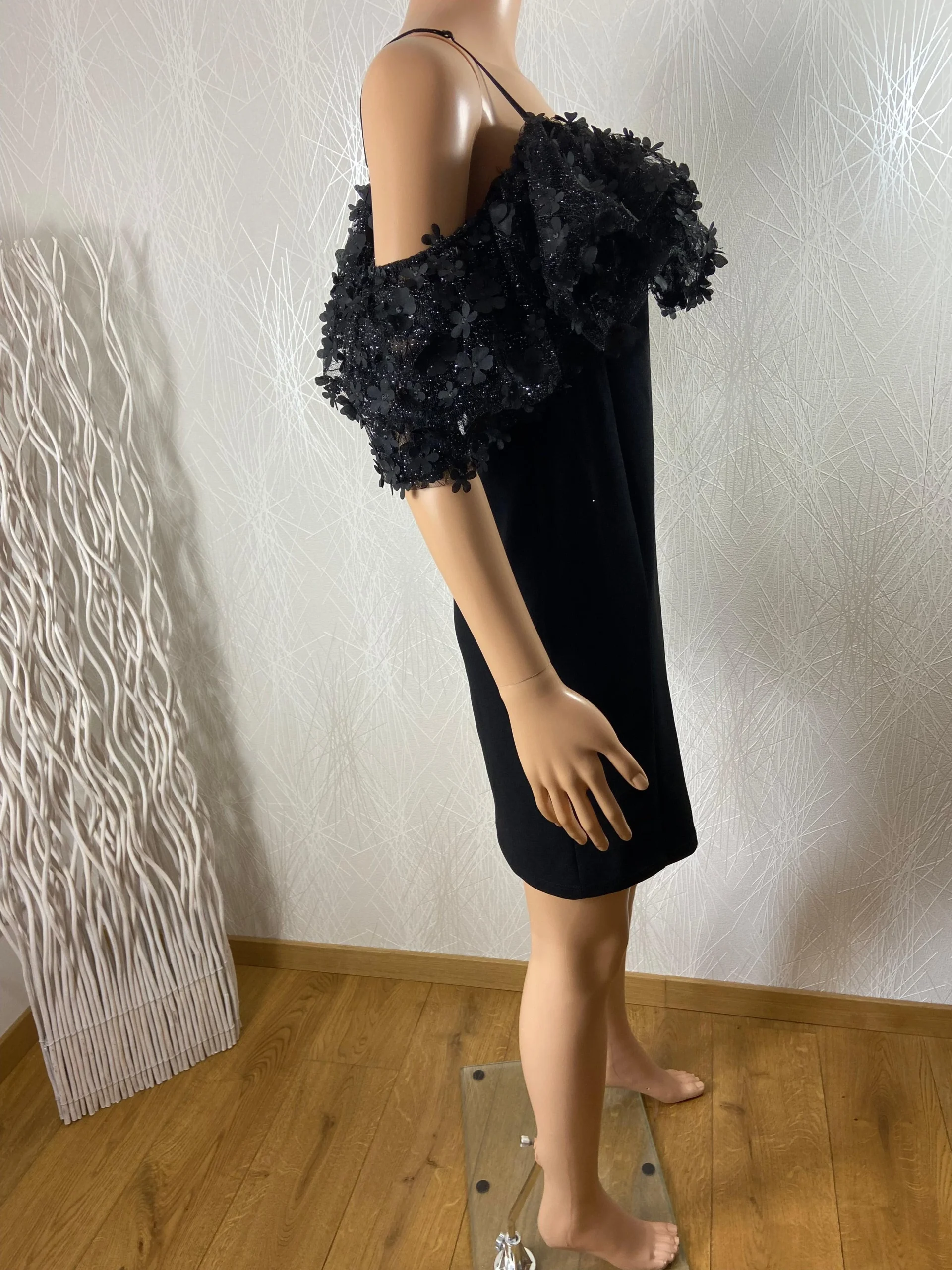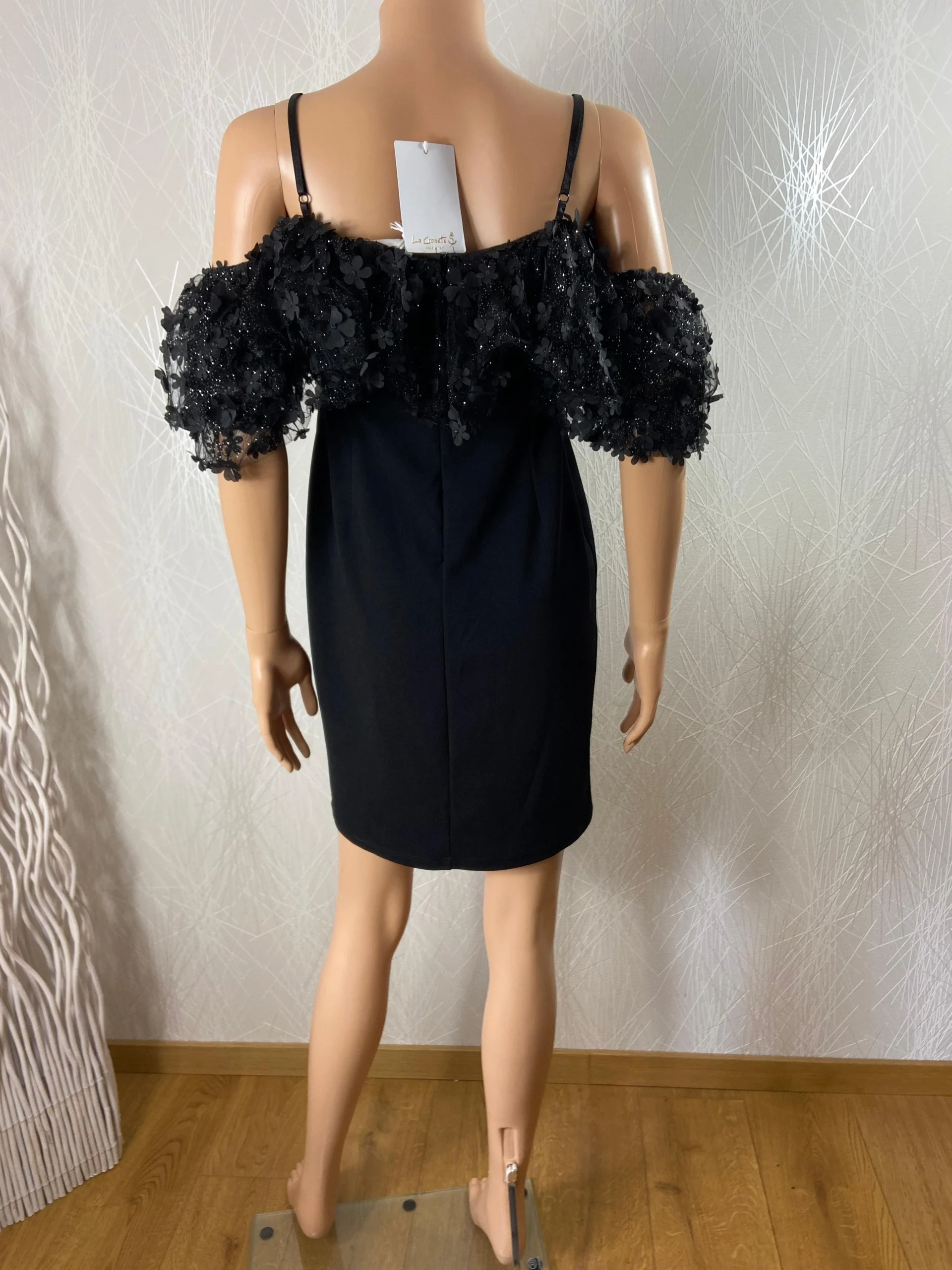 Bretelles réglables, voile noire avec fleurs et paillettes argentées et fermeture zip dans le dos.