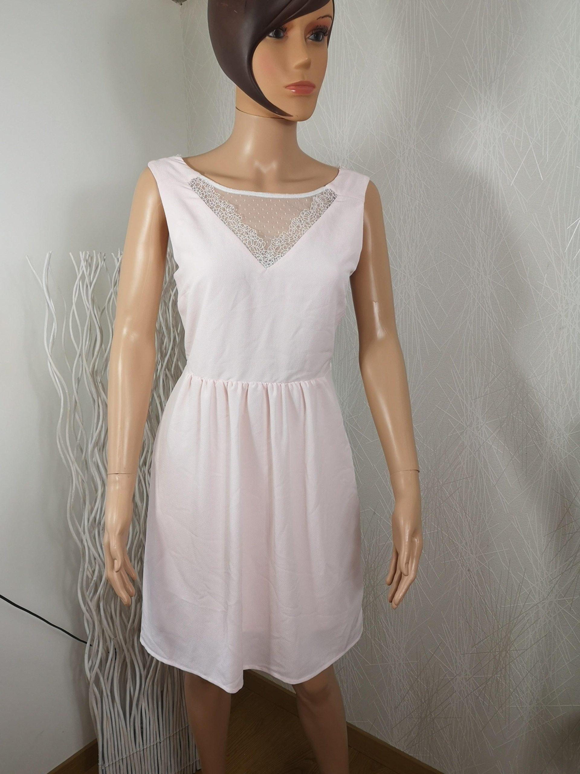 Robe doublée, encolure ronde avec broderie et dentelle, dos nu avec dentelle et lacet, fermeture à zip sur le côté et cintrée à la taille.