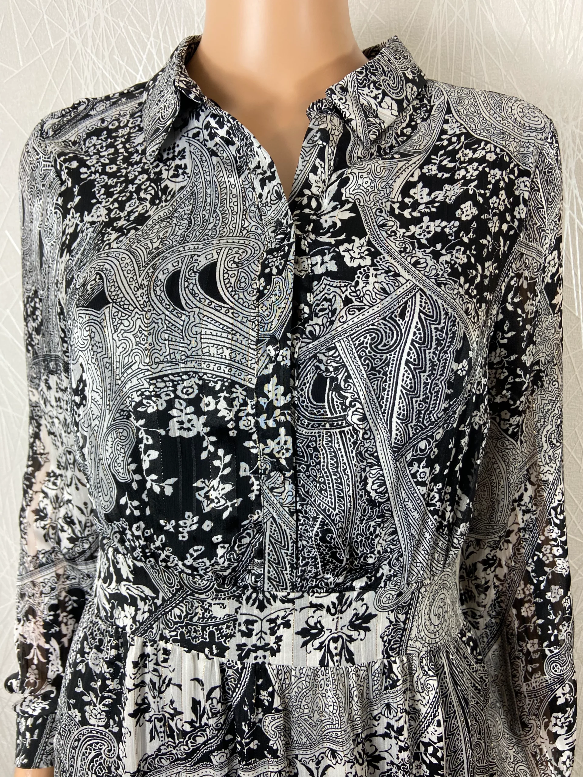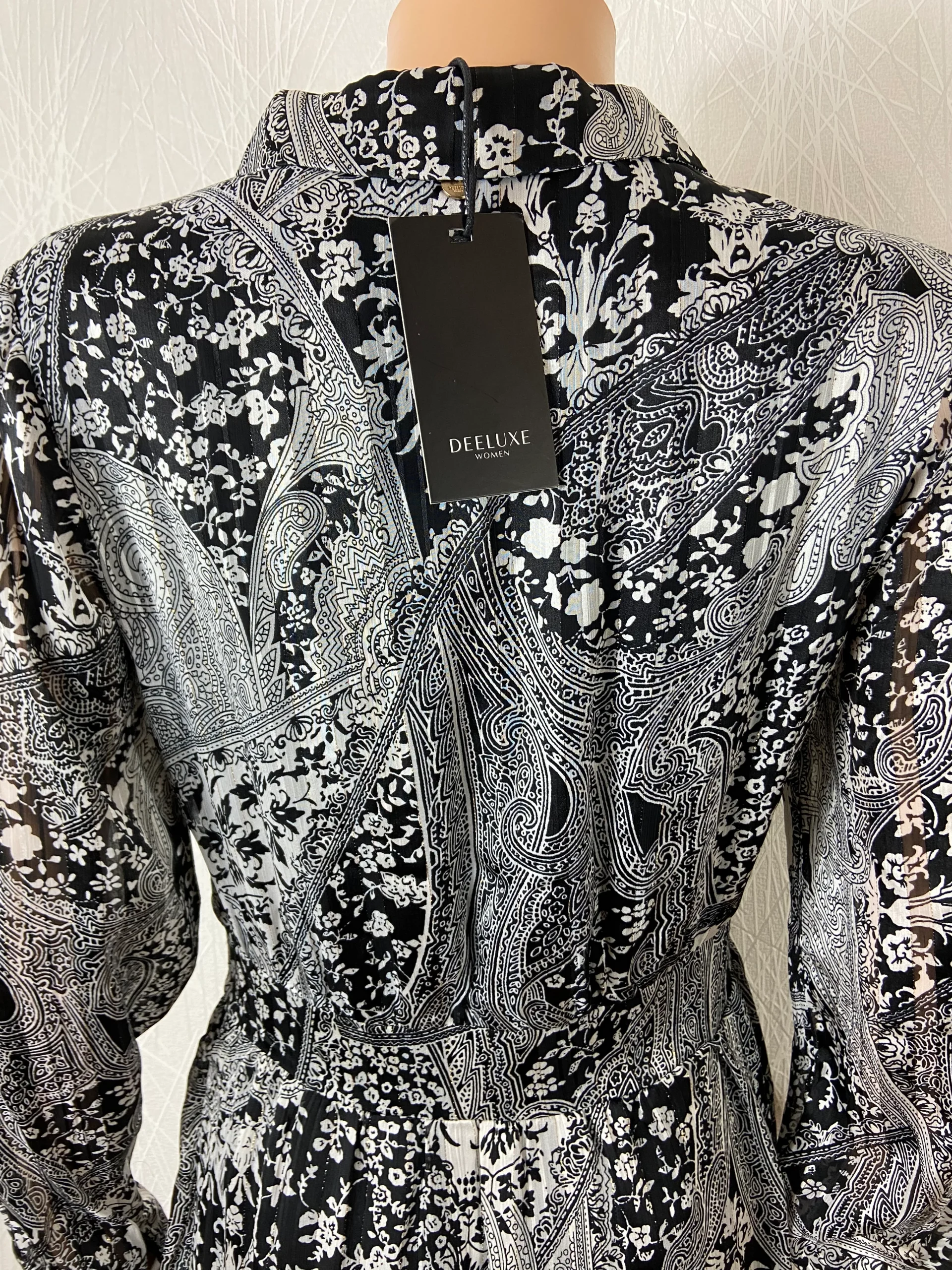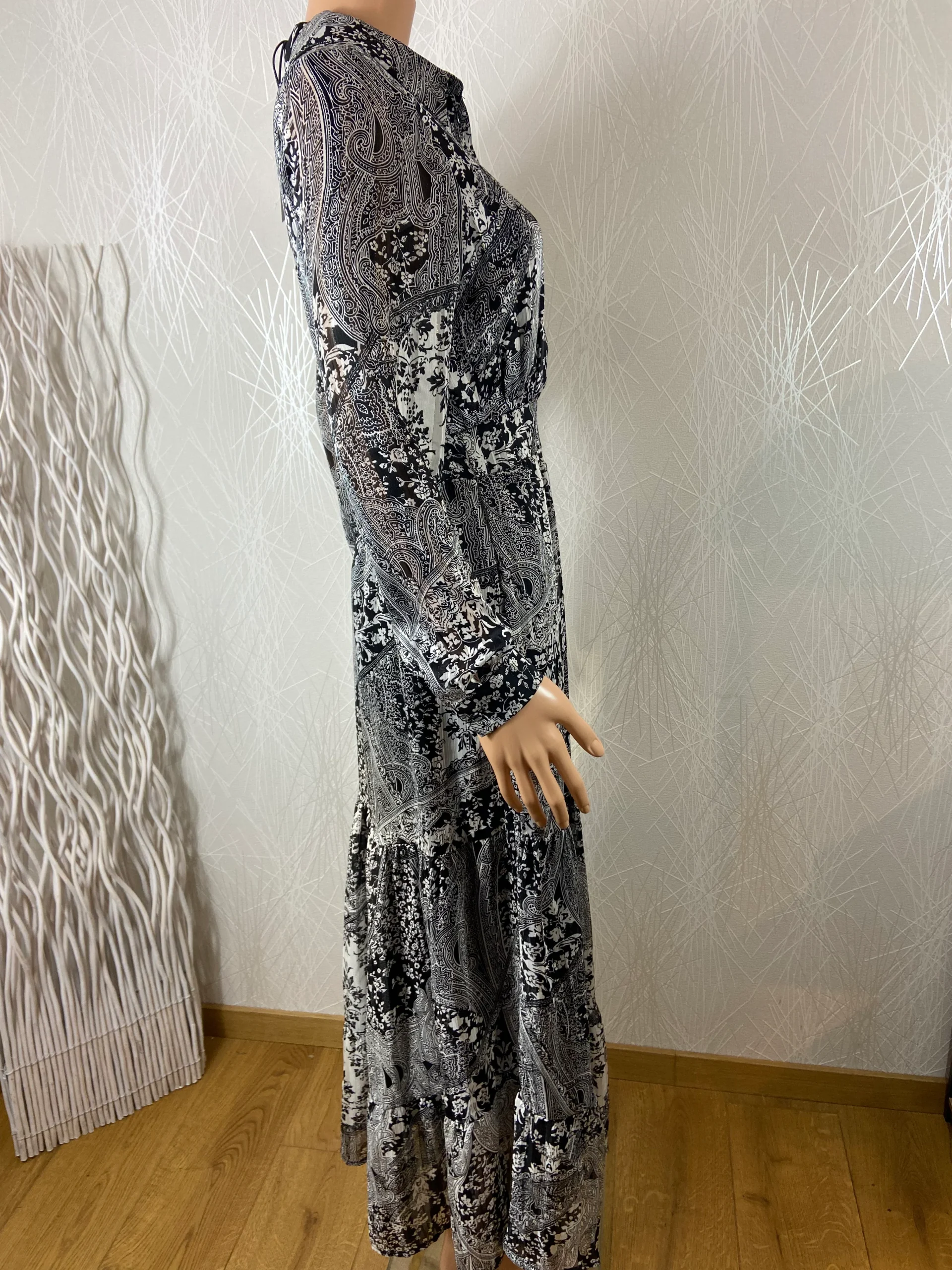Robe longue noire et blanche de la marque Deeluxe, en tissu imprimé cachemire, col chemise, cintrée à la taille et doublée.