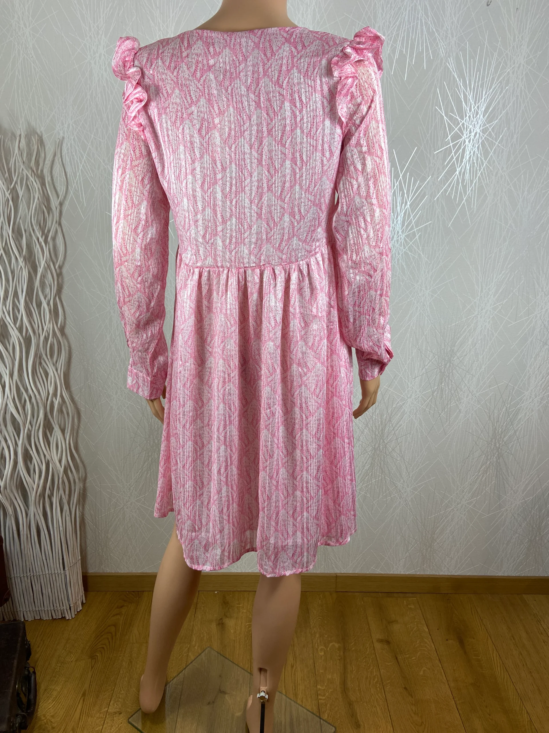 C’est une jolie robe rose, dans l’esprit Barbie, avec des fils argentés, des manches longues transparentes avec bouton aux poignets, des volants au niveau des épaules.