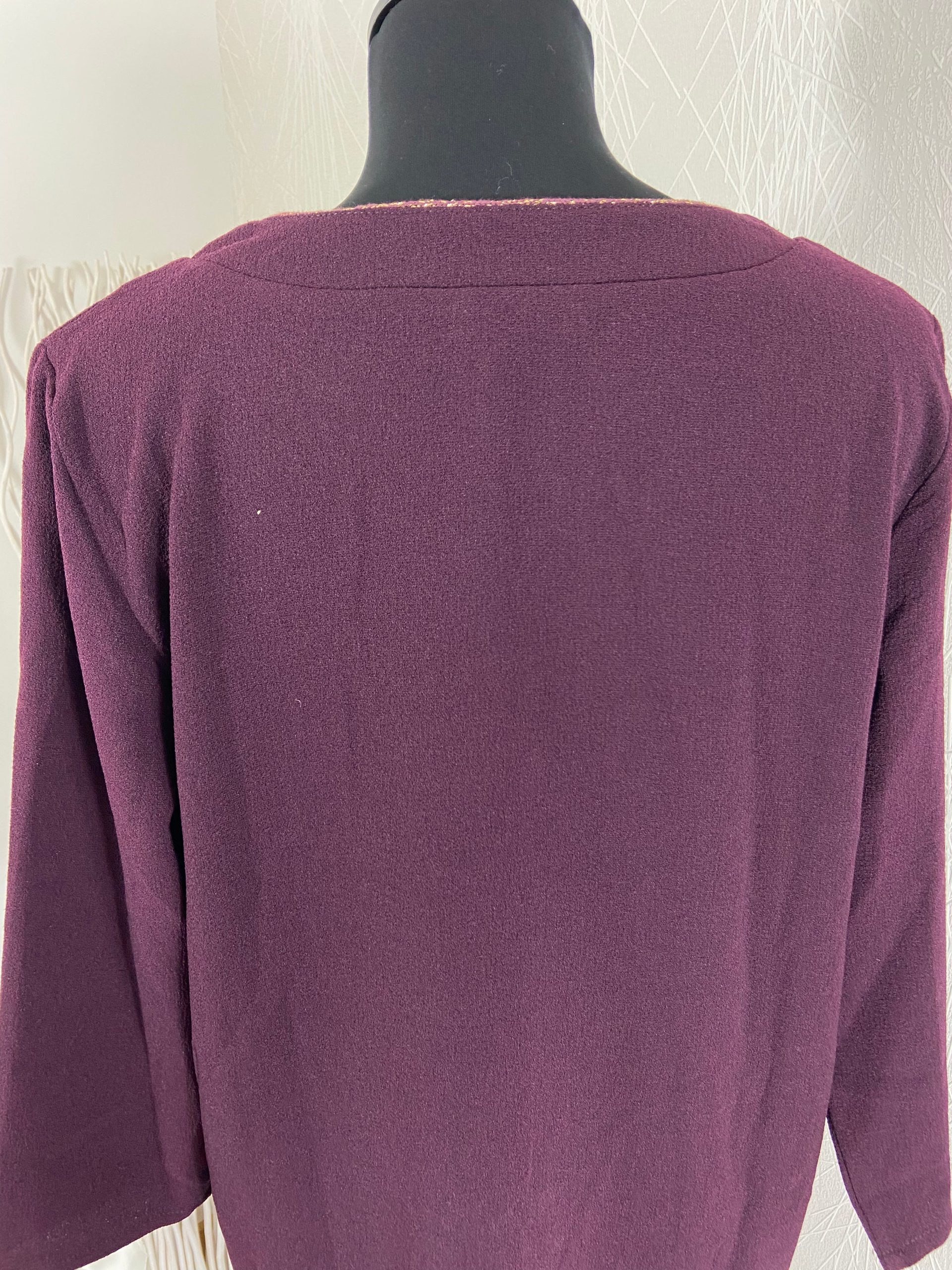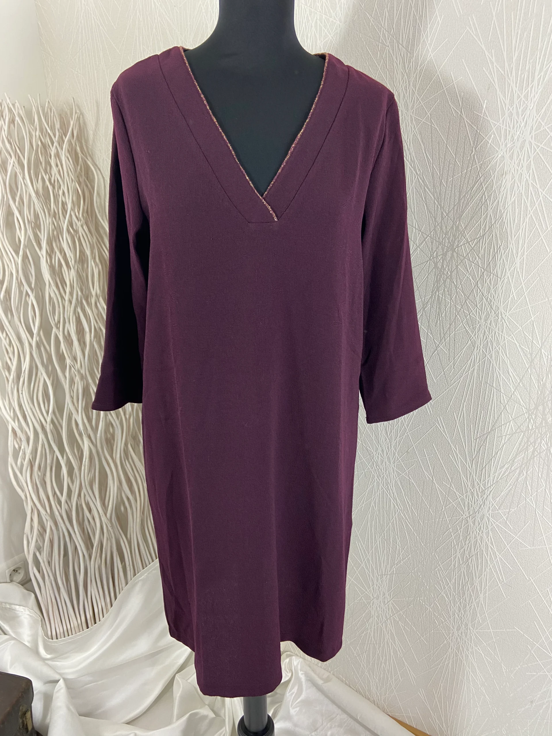 Jolie robe midi modèle Bettany de la marque Louizon. Encolure en V avec liseré or, manches 3/4 et coupe droite. Matière : 97% polyester – 3% élasthanne. Couleur : Violet aubergine. Marque : Louizon Taille : M / 38 – Réf : 38MR1820 Dimensions : Largeur épaule : 40 cm ; tour de poitrine : […]