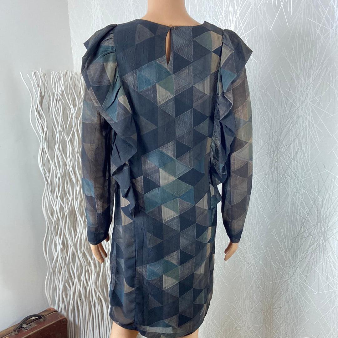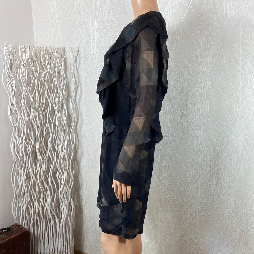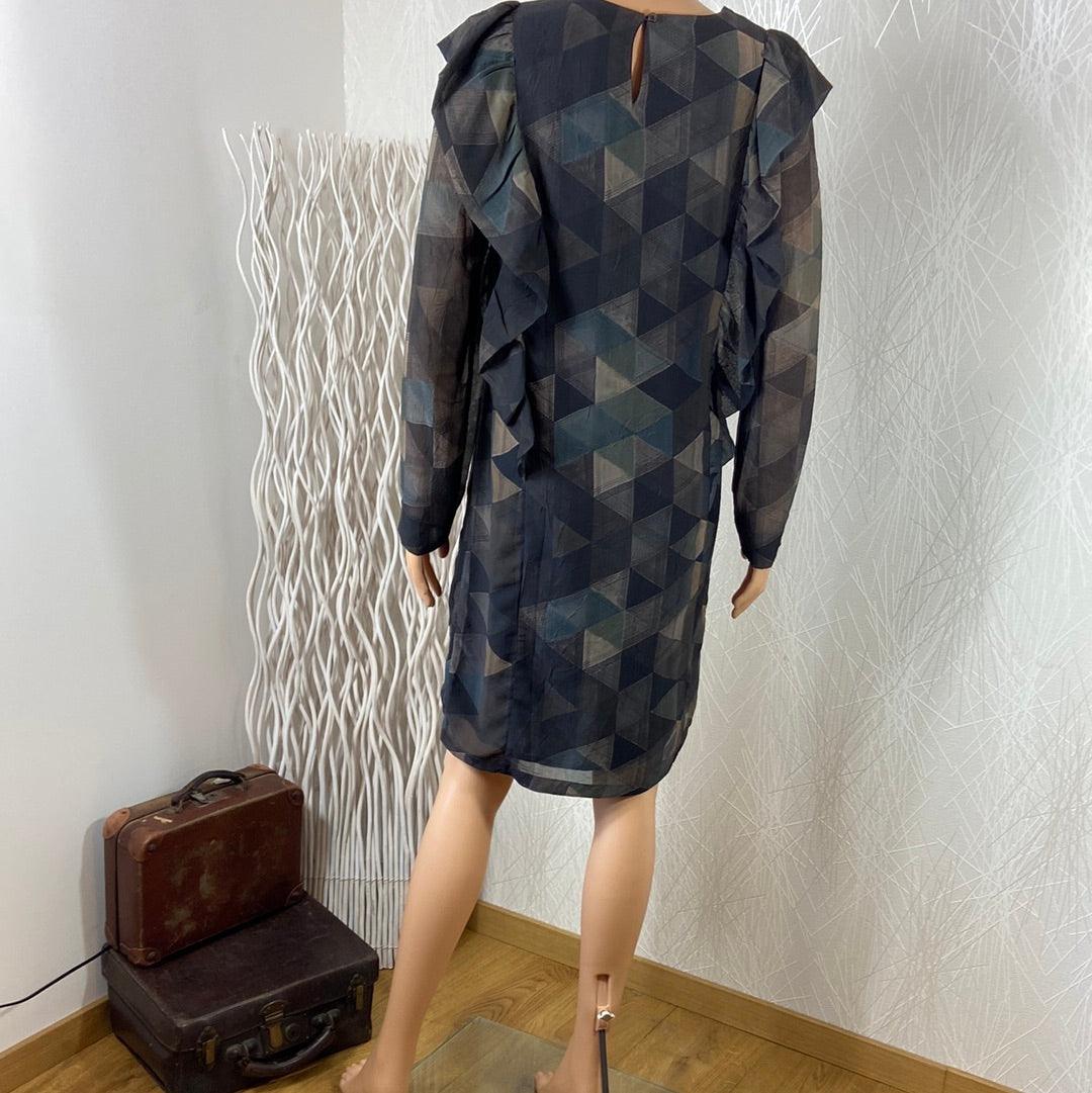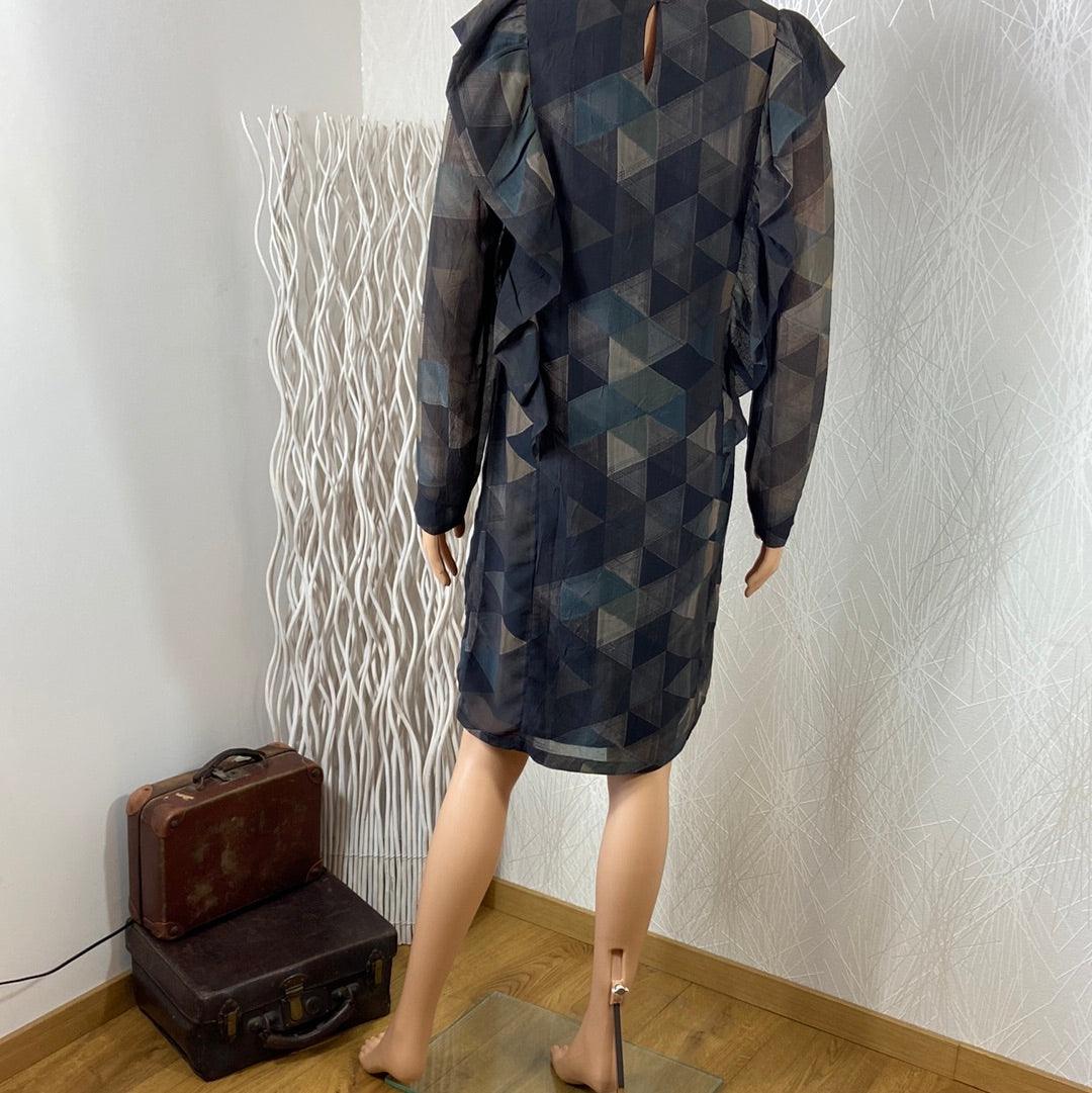 Robe doublée multicolore de la marque Anonyme. Manches longues transparentes, encolure ronde, coupe droite, tissu imprimé à motifs géométriques, fermeture goutte d’eau dans la nuque et volants sur les côtés. Matière : 100% polyester – doublure : 100% rayon Couleur : Gris Marque : Anonyme Dimensions Taille 36 : Largeur épaule : 37 cm ; […]