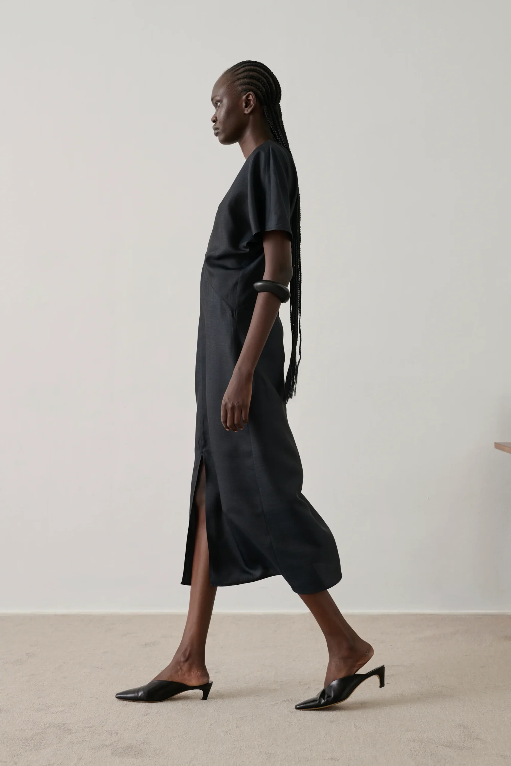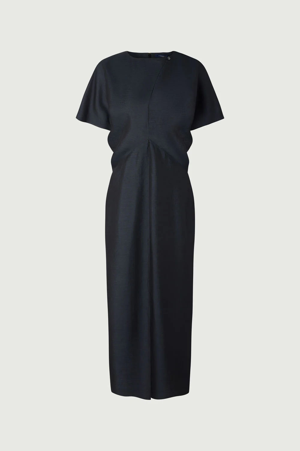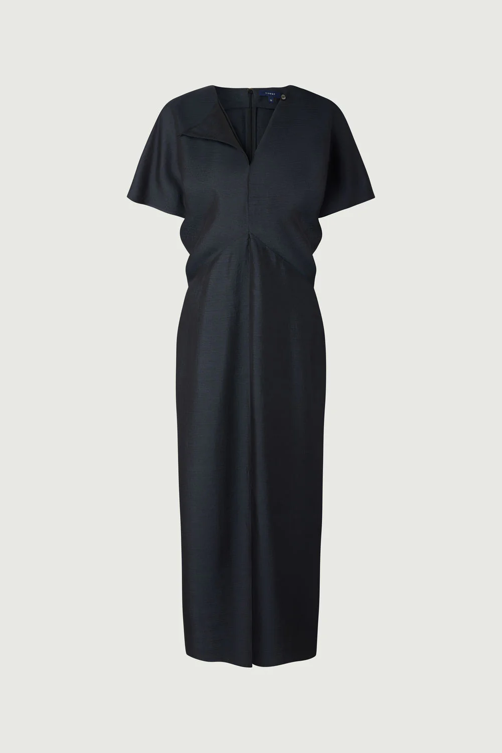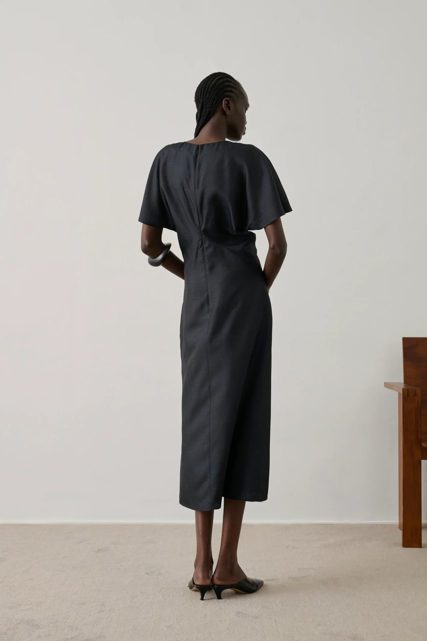 – Coupe ajustée – Longueur mi-mollet – Ouverture dos zippée invisible et petit crochet – Fente en bas devant – Détail de drapé