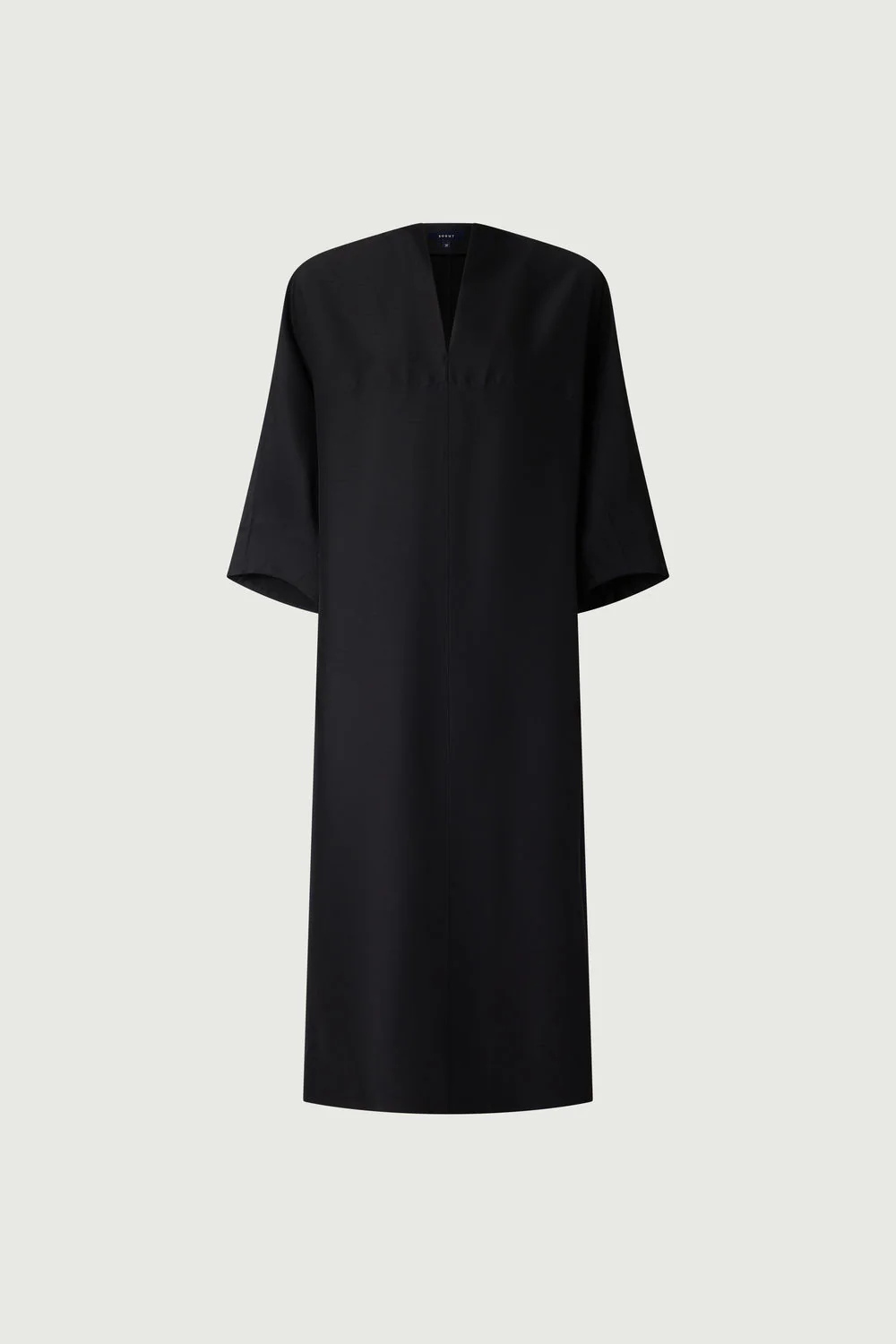 GRETA est une robe en laine et viscose noire, à la coupe arrondie et col ouvert. Ses découpes raffinées et son volume arrondi au dos, accentué par un tissu dense, garantissent une élégance sophistiquée. À porter ample ou ceinturée pour un style couture impeccable.