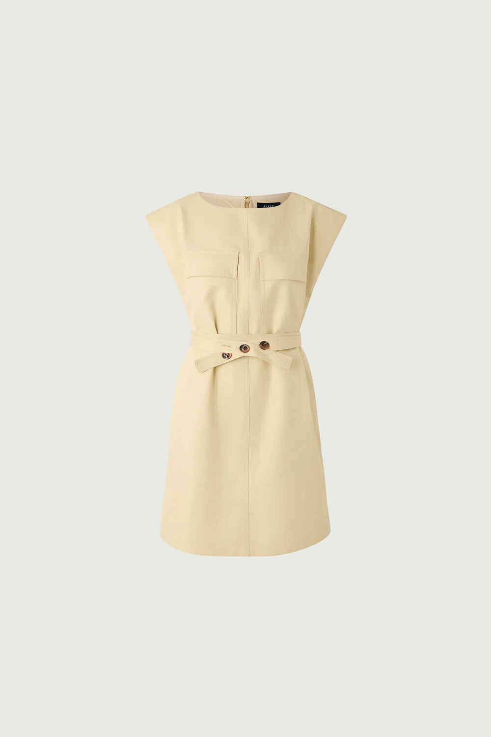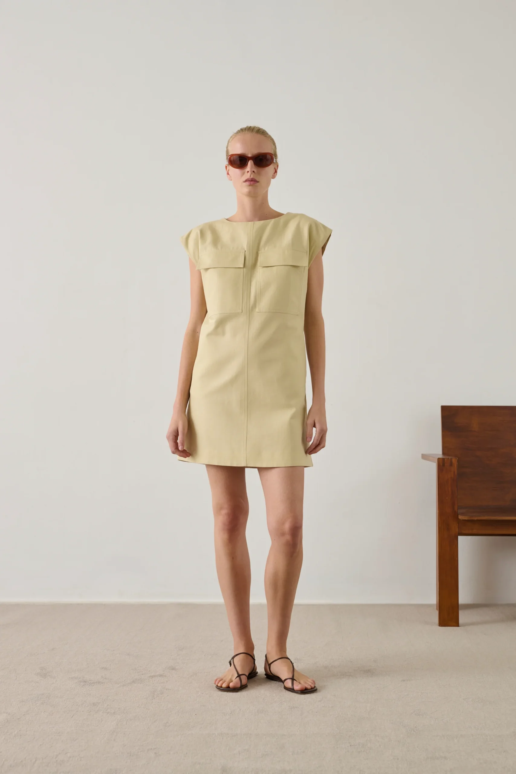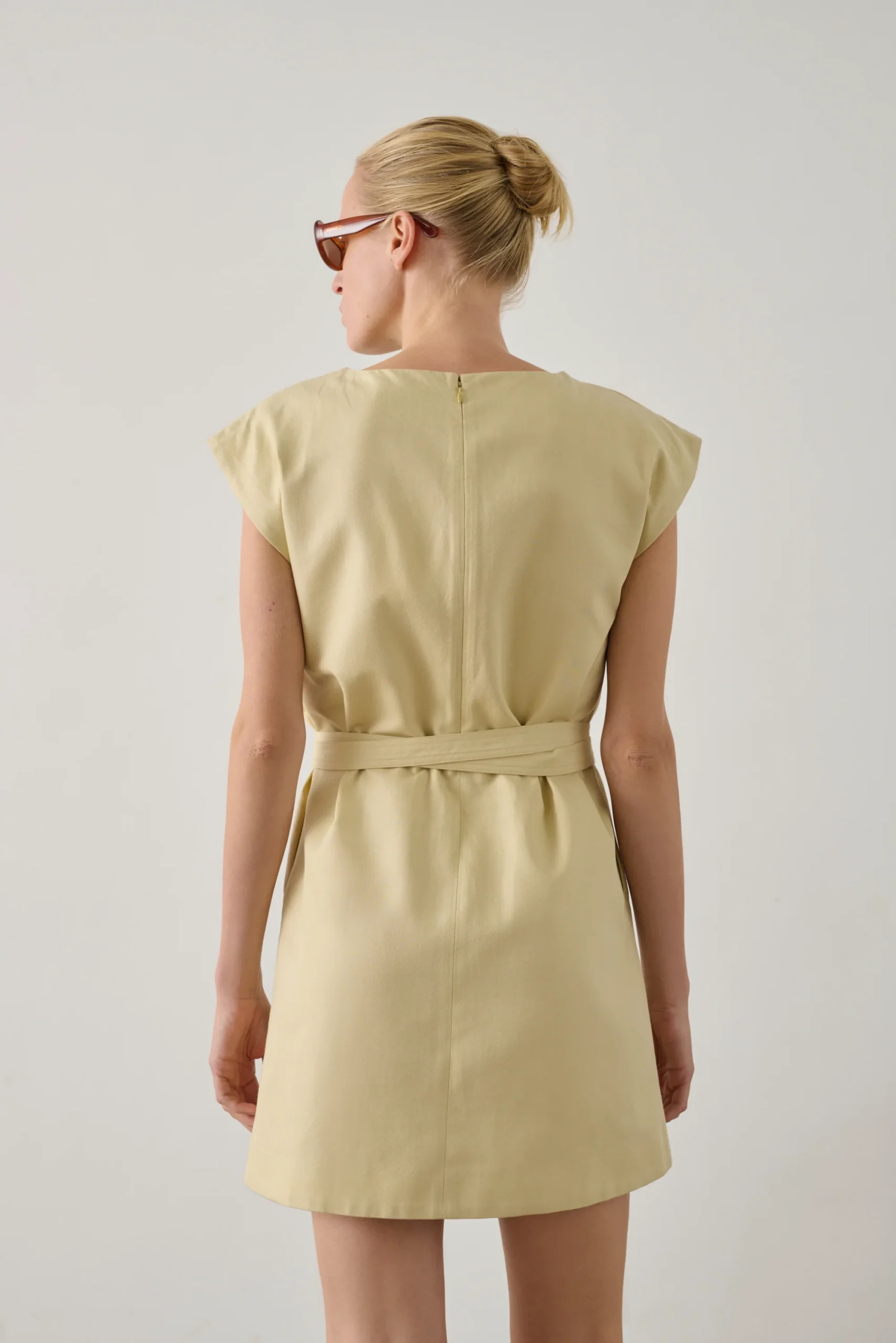 – Coupe cintrée – Longueur mi-cuisse – Col bateau – Ouverture zippée au dos, crochet et ceinture amovible – Deux poches dans les coutures côtés – Twill de coton biologique et lin