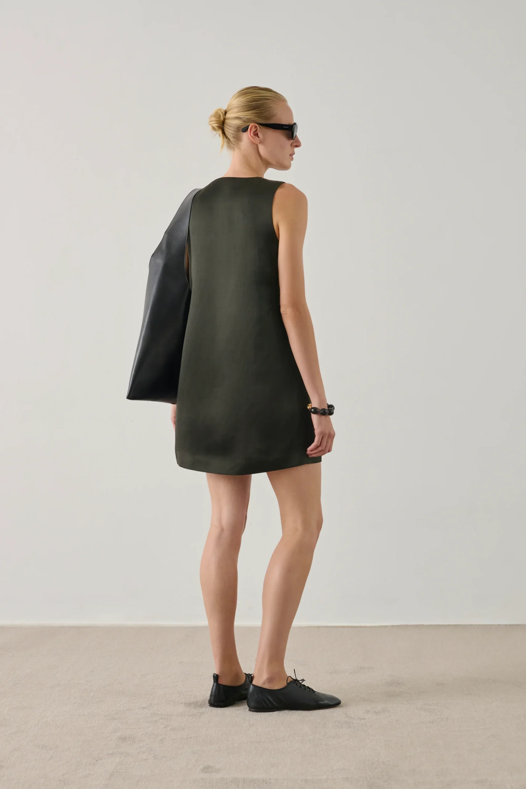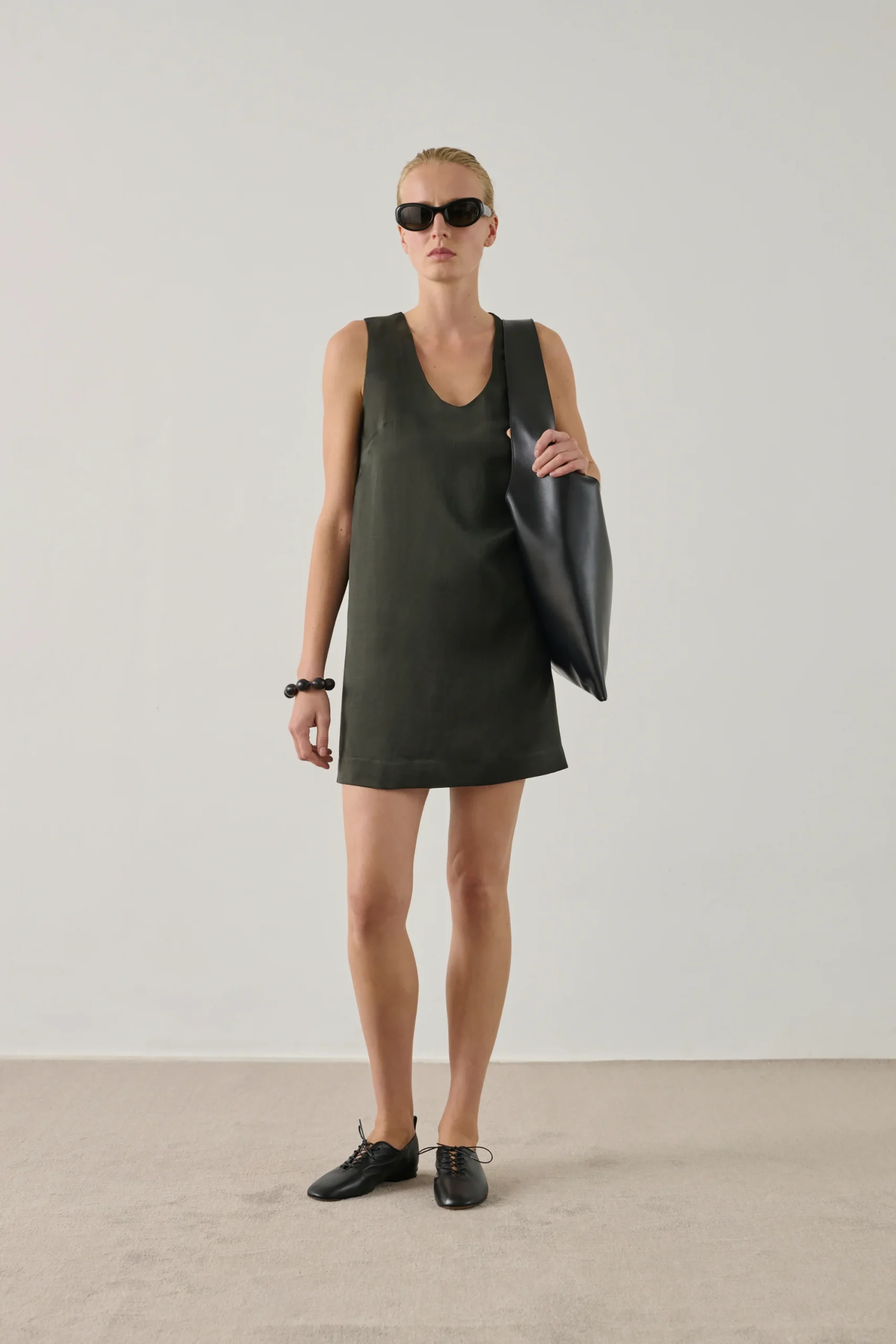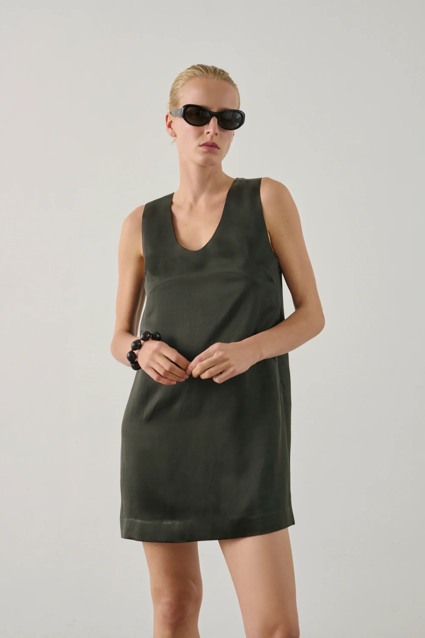 – Coupe droite – Longueur mi-cuisse – Décolleté – Détails de pinces poitrine– Satin de lin et viscose