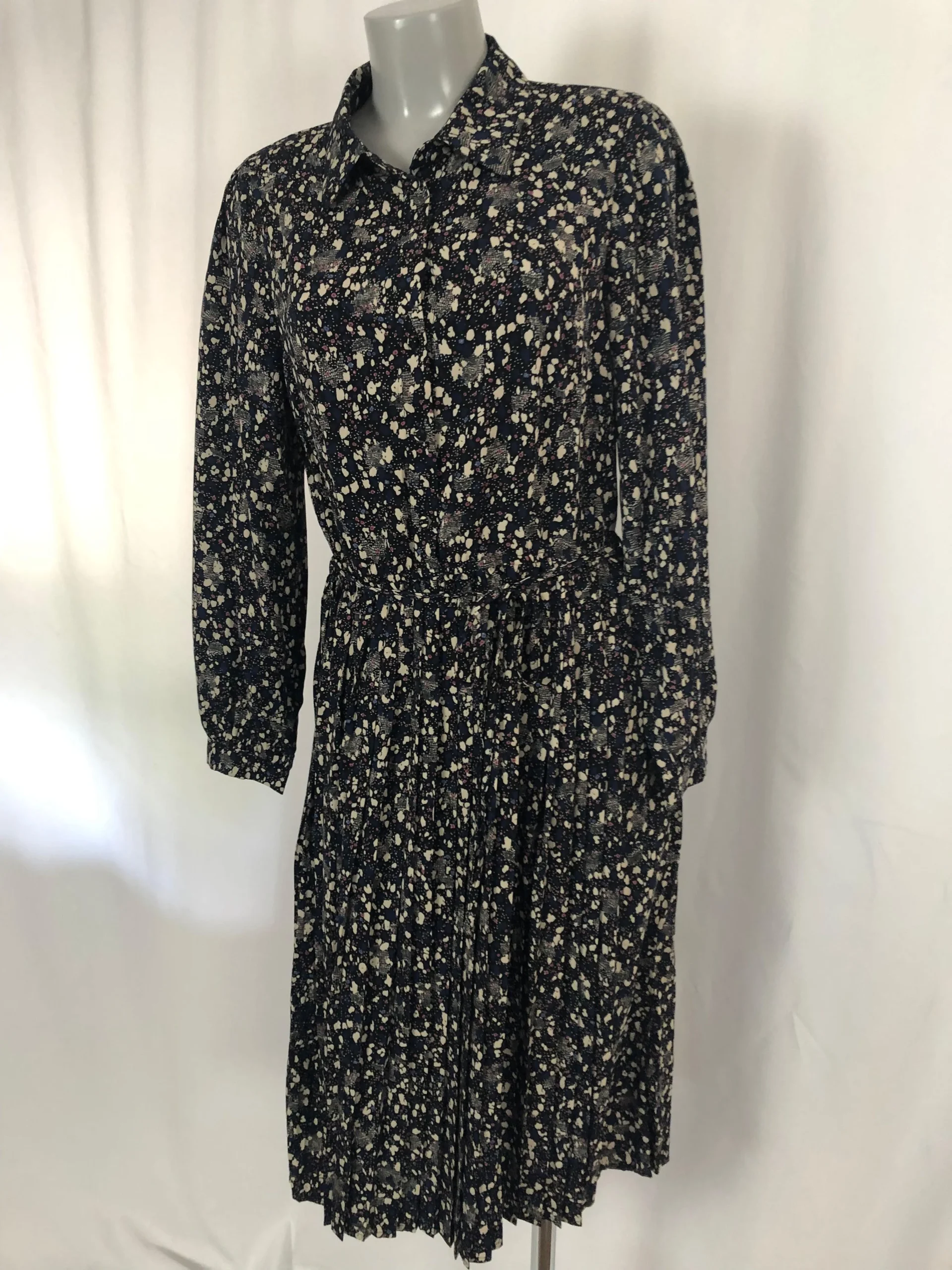 Robe mi-longue à motifs, fluide et légère, avec des manches longues et un col chemise.