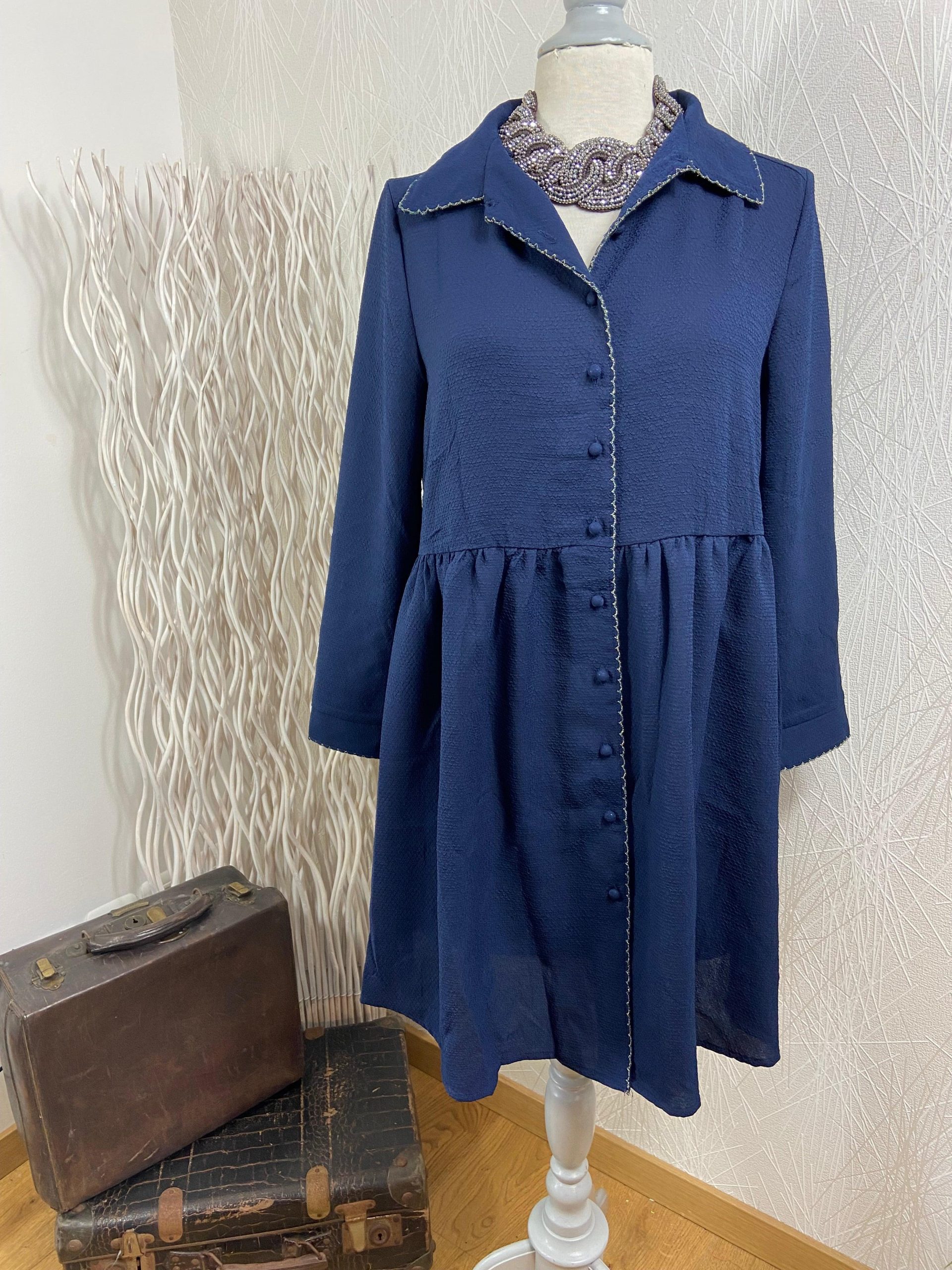 Robe bleu marine mi-longue légèrement transparente à manches 3/4 de la marque It Hippie. Entièrement boutonnée, avec coupe large, cette robe conviendra à toute les morphologies. Tissu fluide, légèrement crêpe avec un liseré doré au niveau du col, des poignets et du boutonnage. Asymétrique, elle est plus longue à l’arrière qu’à l’avant. Les pinces au […]
