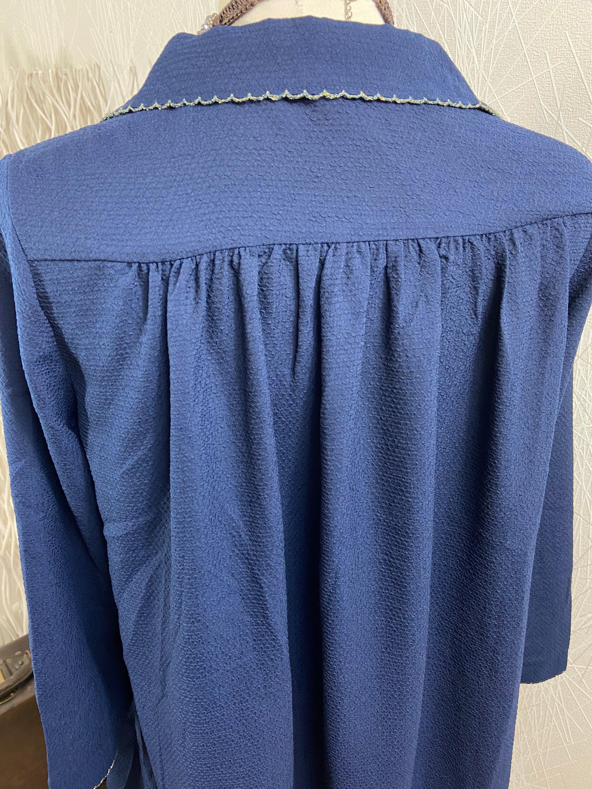 Tissu fluide, légèrement crêpe avec un liseré doré au niveau du col, des poignets et du boutonnage.
