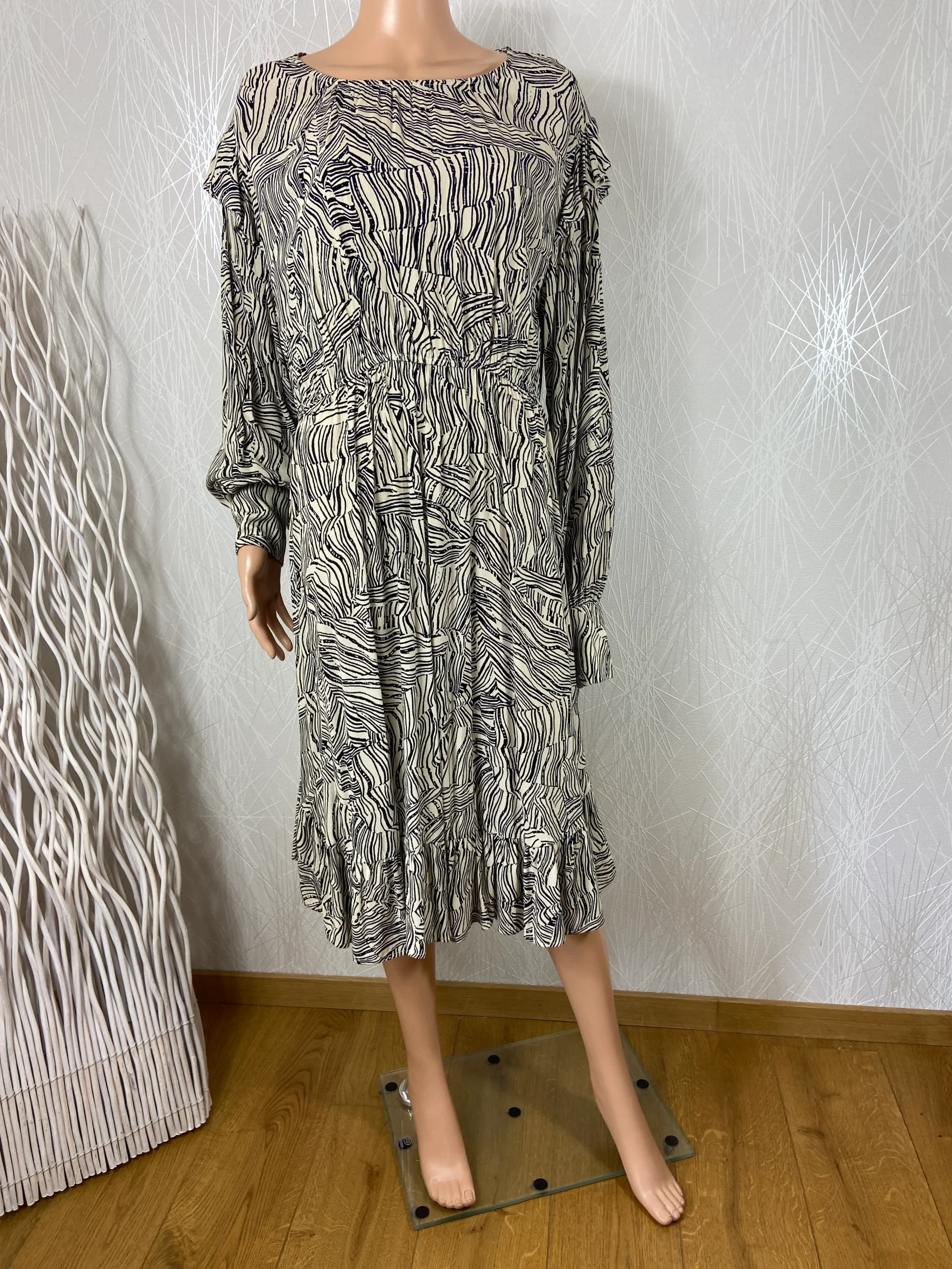 Cette belle robe midi de belle marque a une taille froncée par élastique, des volants sur les épaules et fermeture par zip aux poignets.