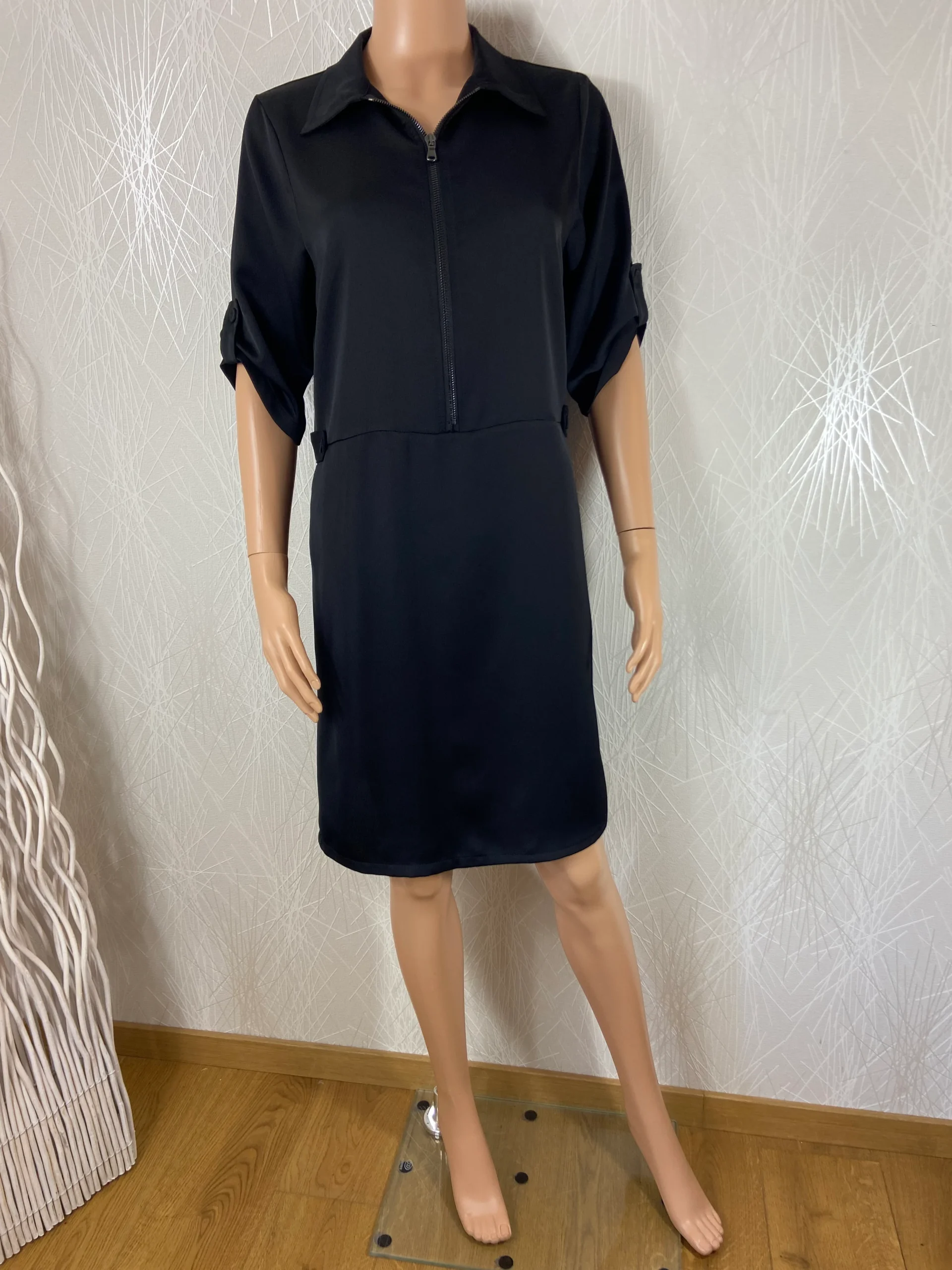 Robe midi satinée noire de la marque Pako Litto. Col chemise avec fermeture zip, manches courtes, 2 poches sur les côtés, élastique dans le dos au niveau de la taille. Une très belle confection de la marque Pako Litto Matière : 100% Polyester Couleur : Noir Valeur en boutique : 105 € Taille : XS […]
