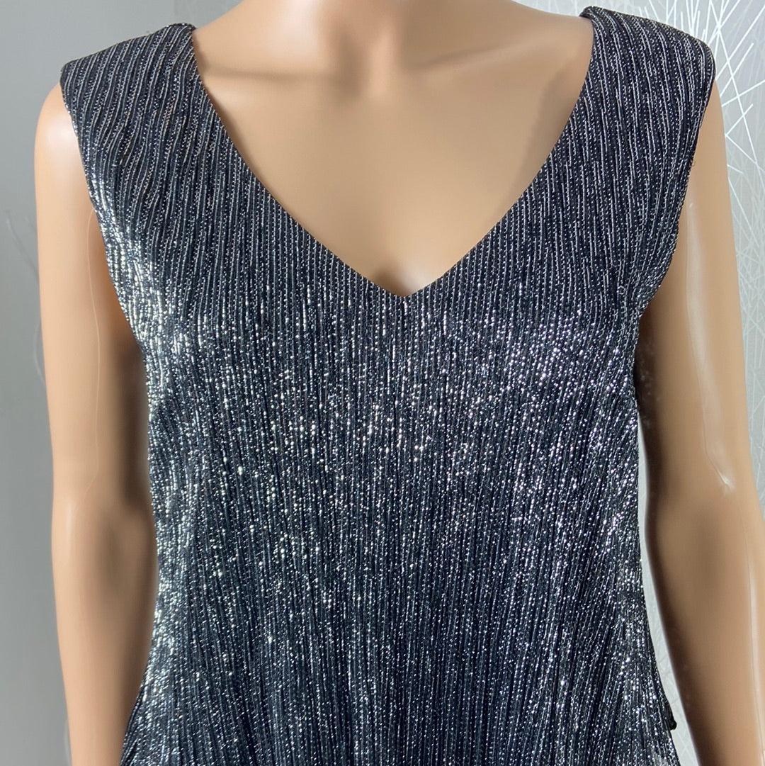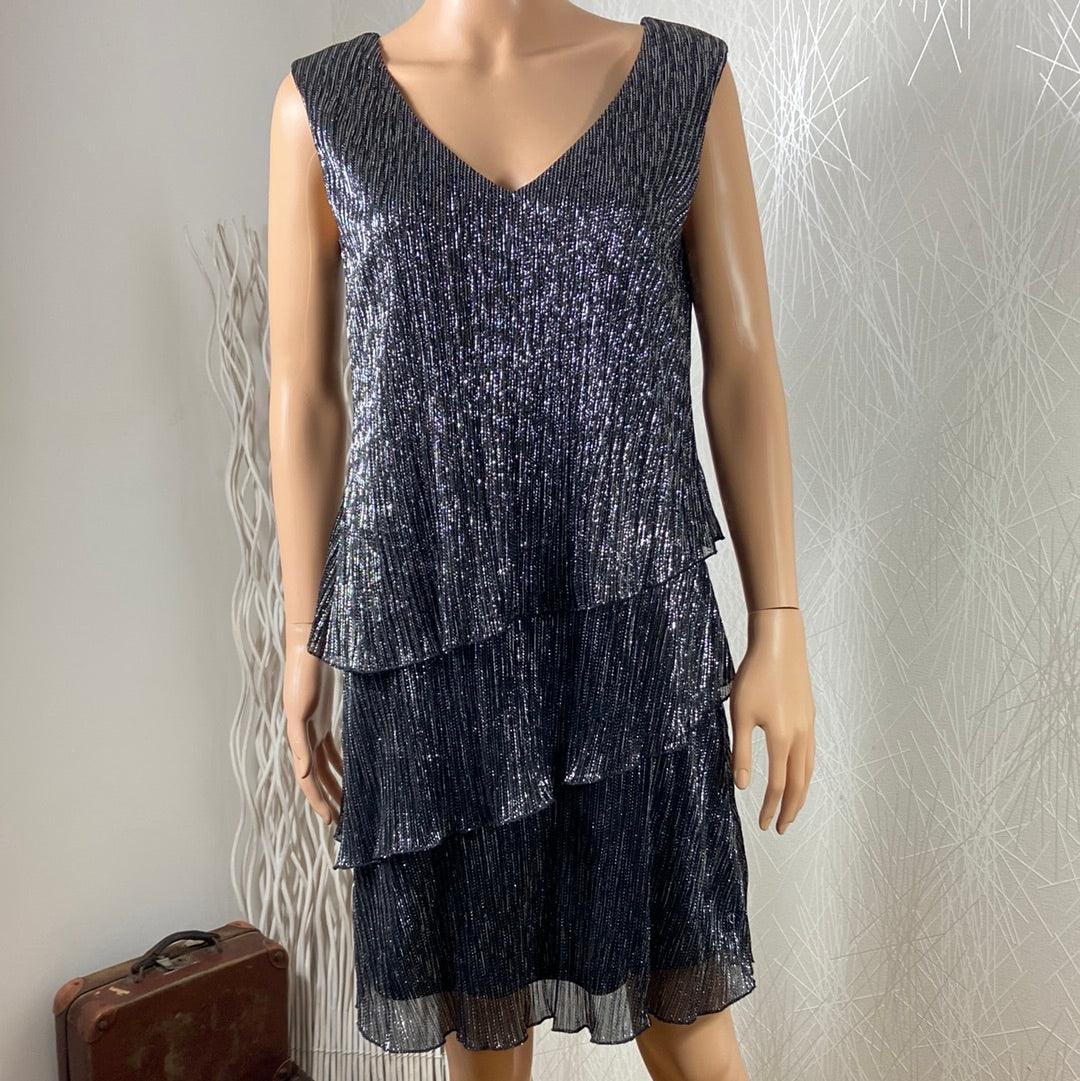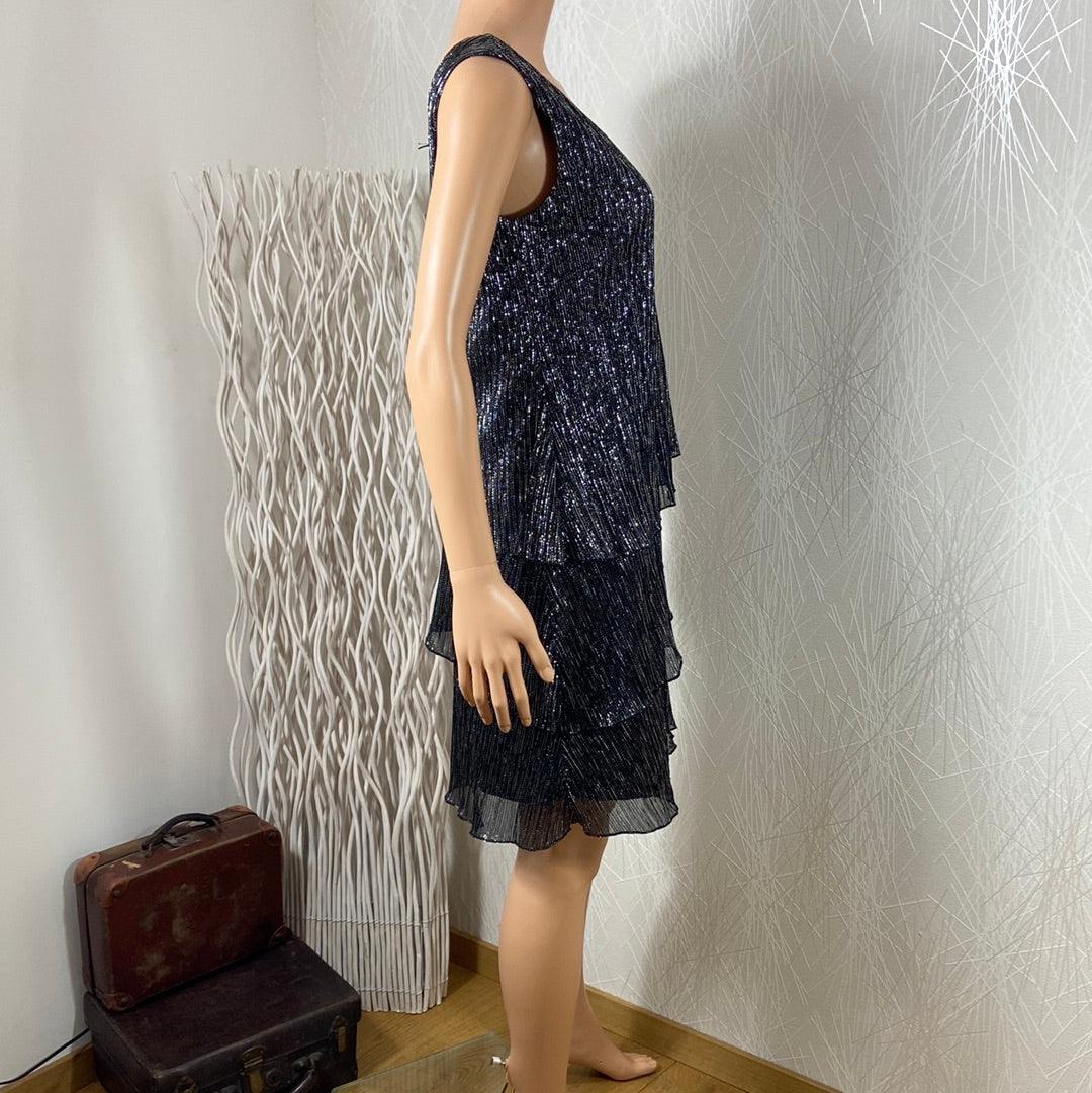 Robe doublée noire argentée de fêtes de la marque Bréal. Sans manches, à volants, encolure en V et dos échancré. Une jolie robe de sortie pour les fêtes. Matière : 75% polyester – 25% fils métallisés – doublure : 100% polyester Couleur : noir argenté Marque : Bréal Taille M / 38 – Réf : […]