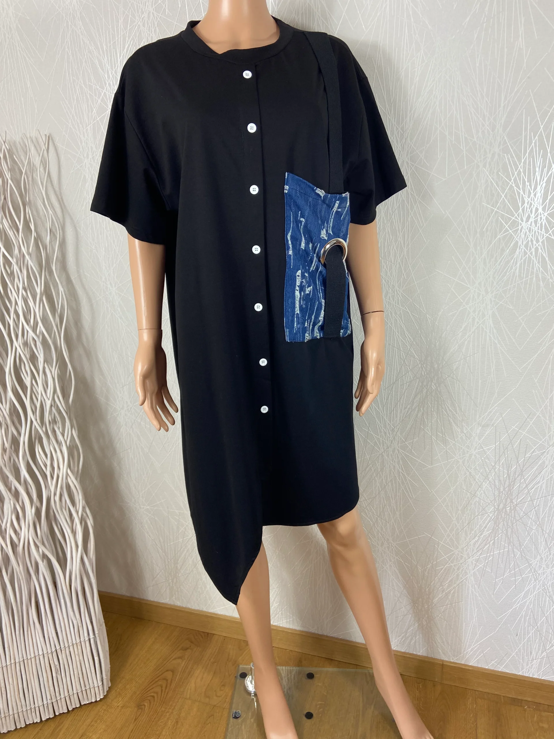 Robe asymétrique avec une encolure ronde, une grande poche devant et boutons en décoration.