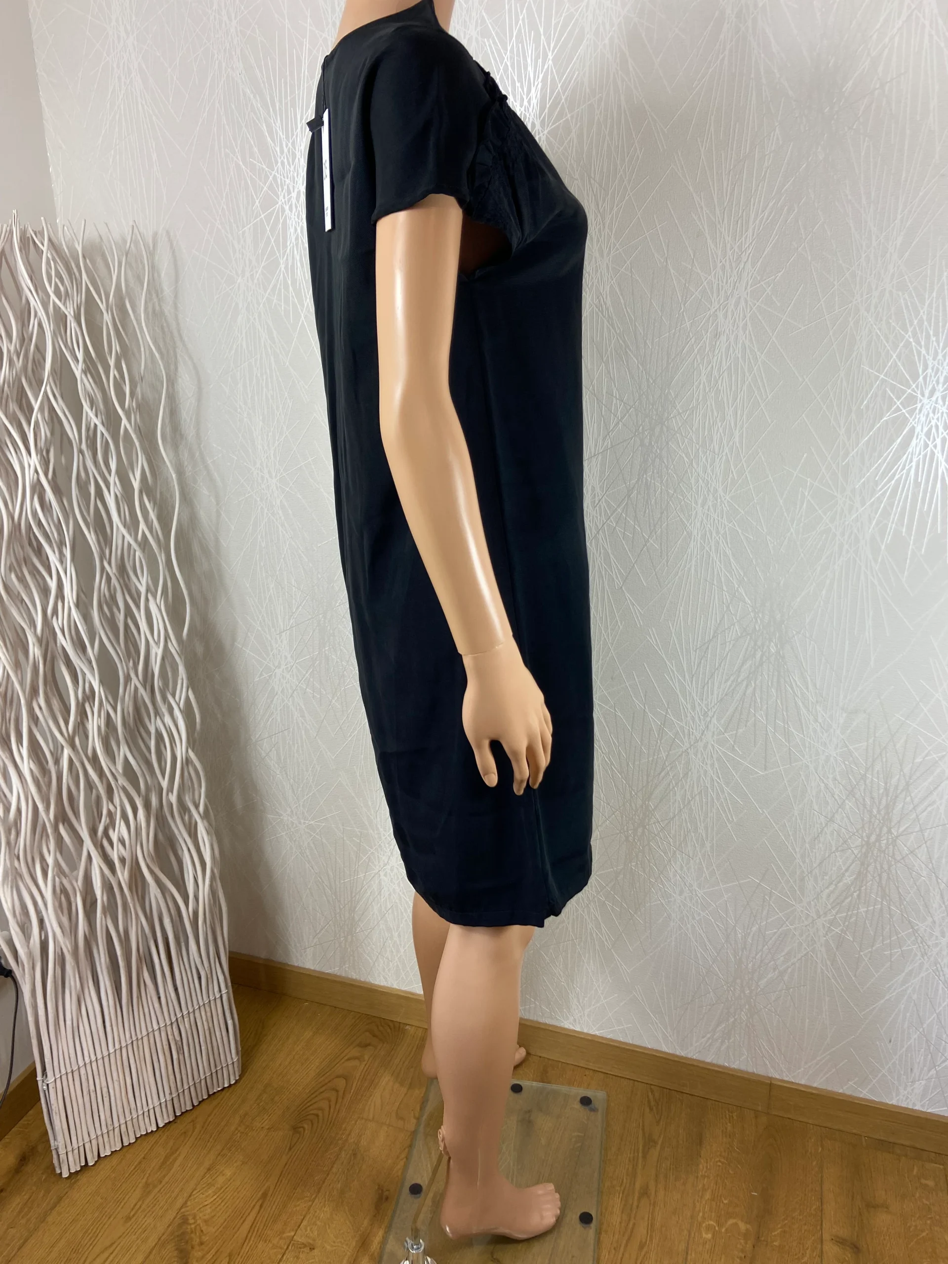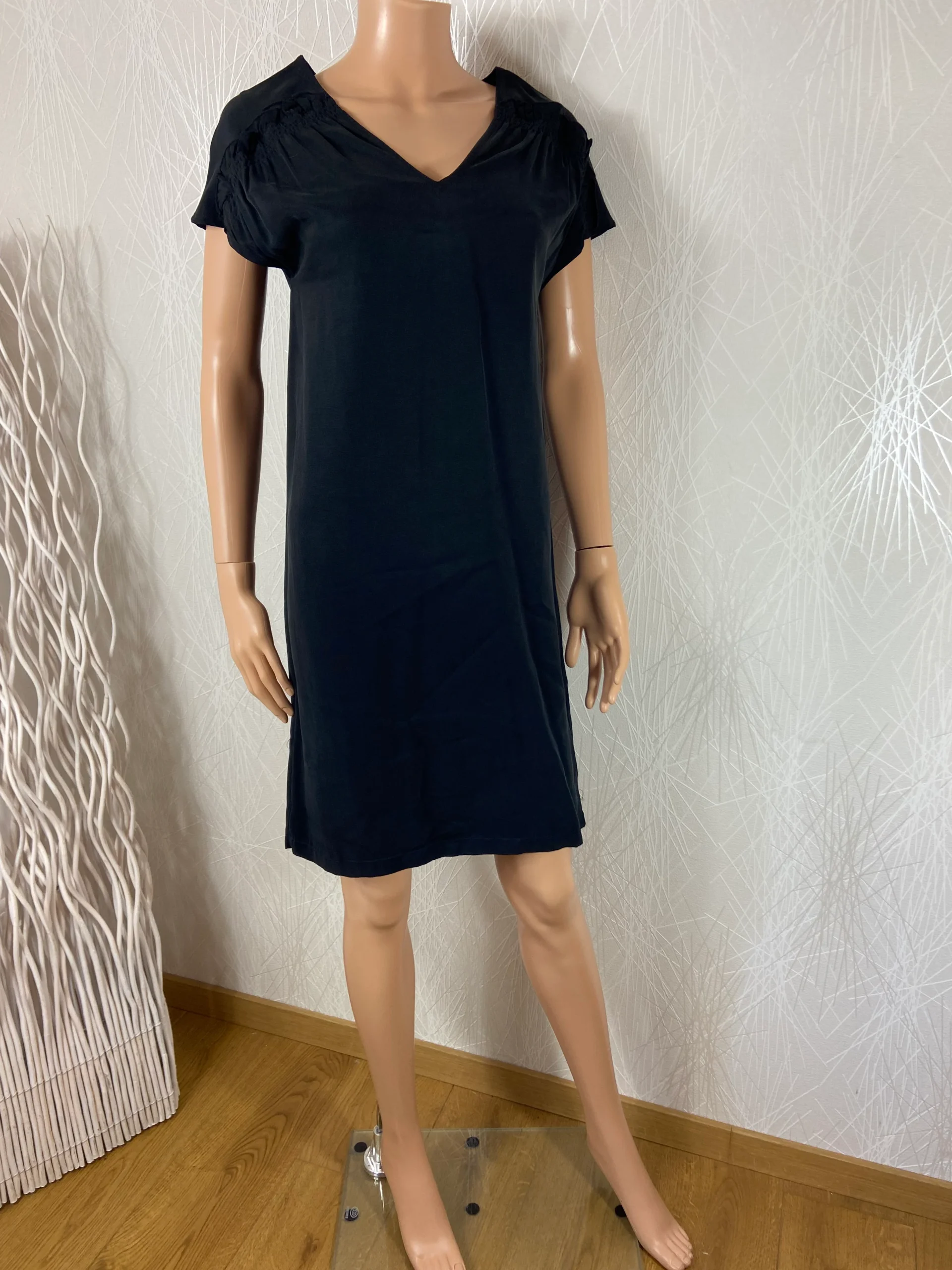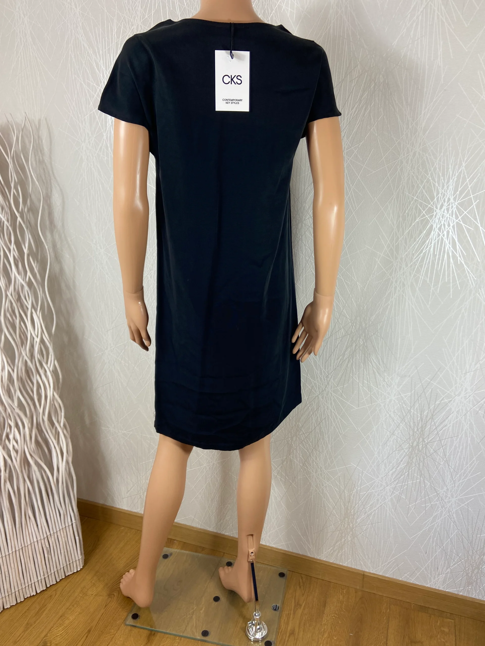 Robe courte noire de la marque CKS, à manches courtes, coupe droite, encolure en V et tissage popeline. Dimension : longueur 90 cm Composition : Cupro rayonne Couleur : noir Marque : CKS Taille : XS / 34 – Réf : XSBR741 Valeur en boutique 79 €
