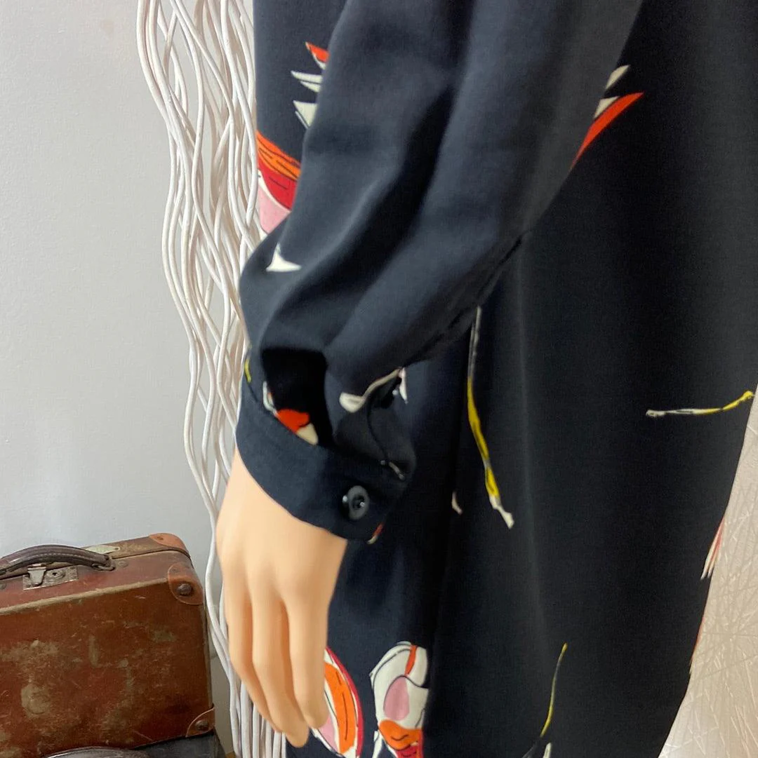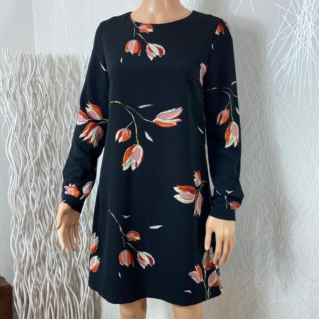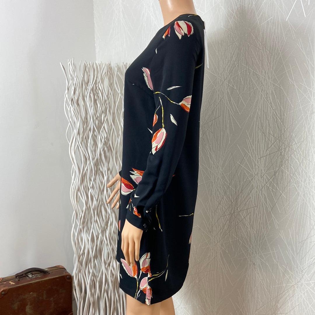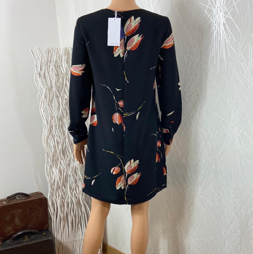 Belle robe noire doublée à motifs de fleurs de la marque Anonyme. Manches longues avec bouton aux poignets, coupe droite, encolure ronde et fermeture zip dans le dos. Matière : 100% polyester Couleur : Noir Marque : Anonyme Taille S / 36 – Réf : 36PR3182 Dimensions : Largeur épaule : 38 cm ; tour […]