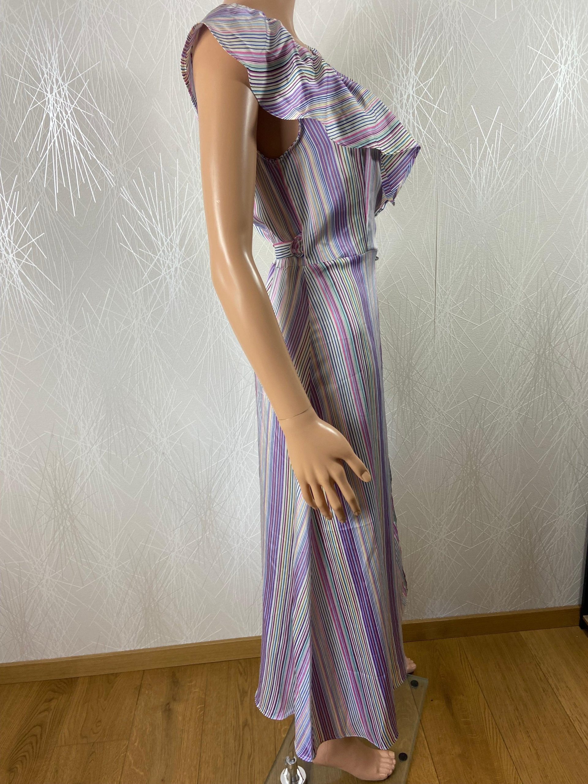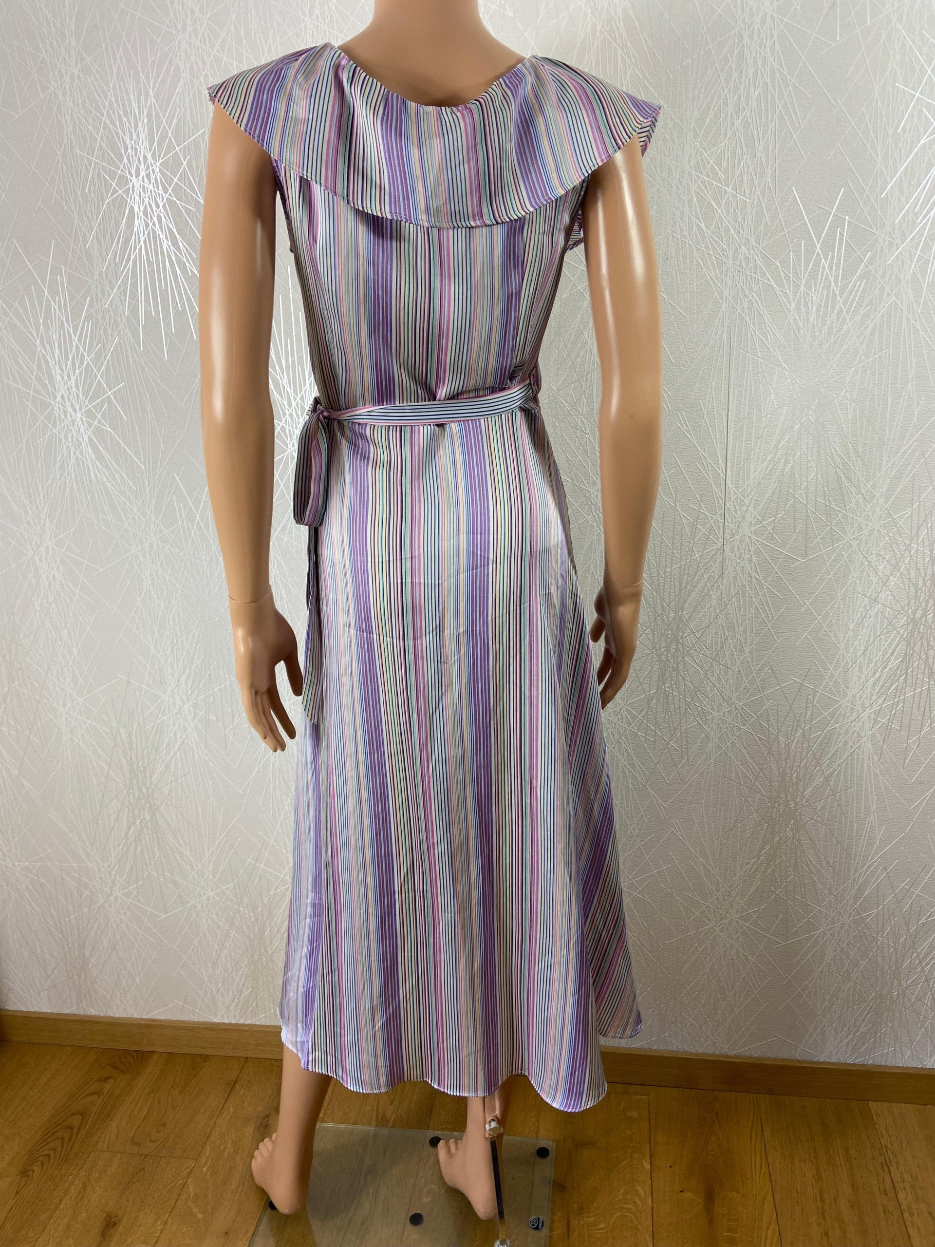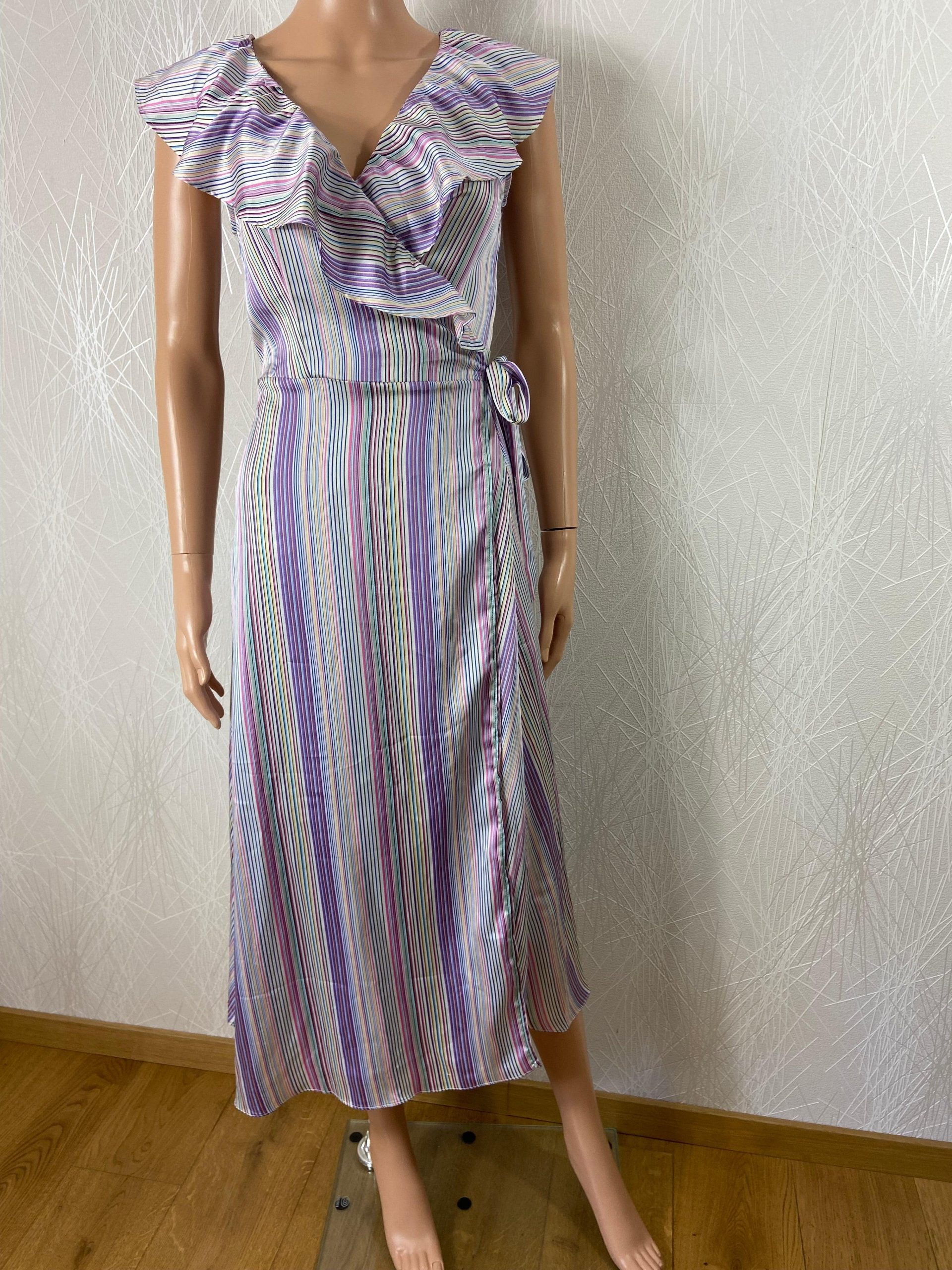 Robe portefeuille de la marque In April 1986. Sans manches, encolure en V avec volants, tissu à motif rayé multicolore et coupe droite. Matière : 100% polyester Couleur : Multicolore Marque : In April 1986 Taille M-L / 38-40 – Réf : 38NR5242 Dimensions : Largeur épaule : 41 cm ; tour de poitrine : […]