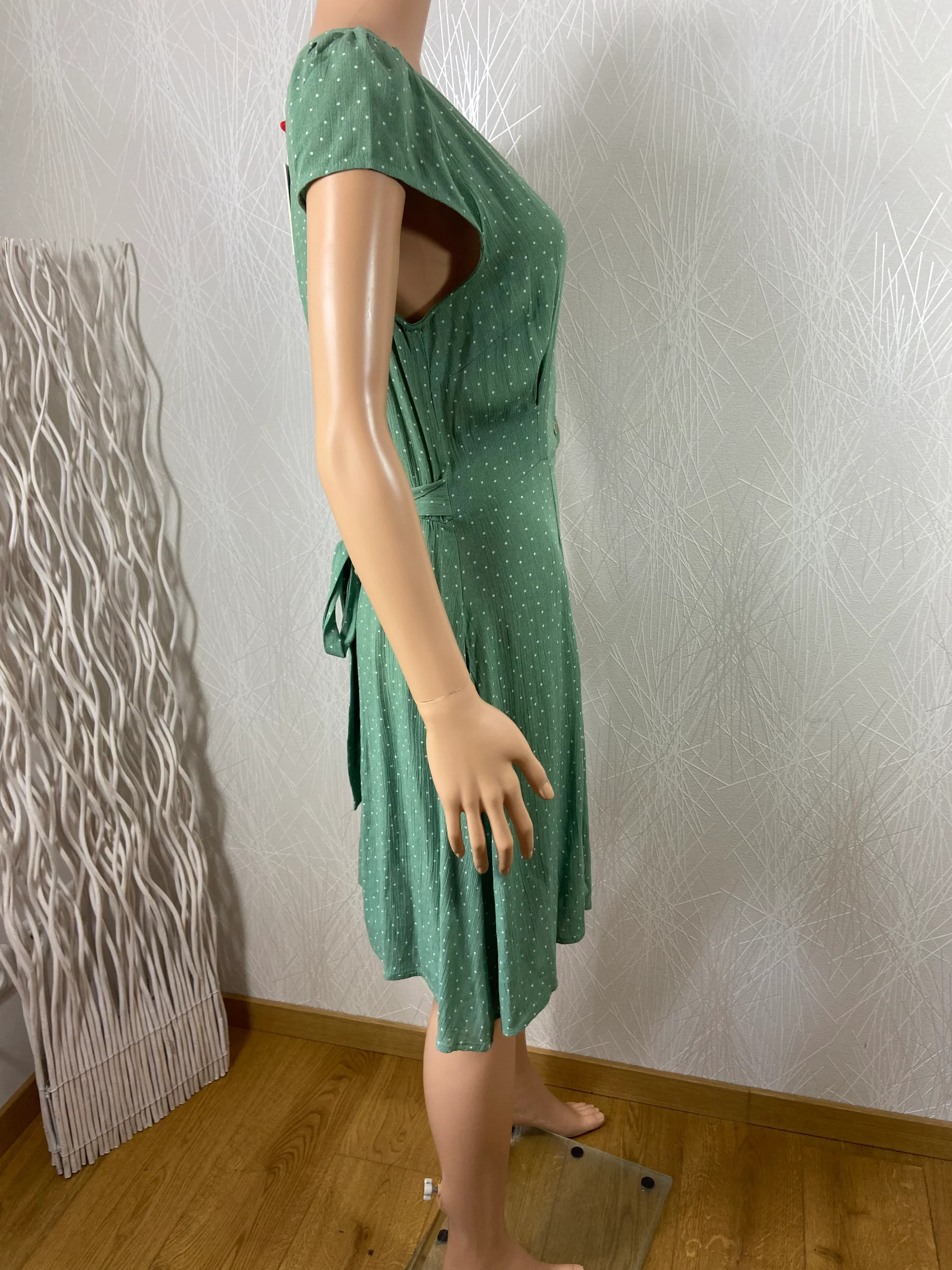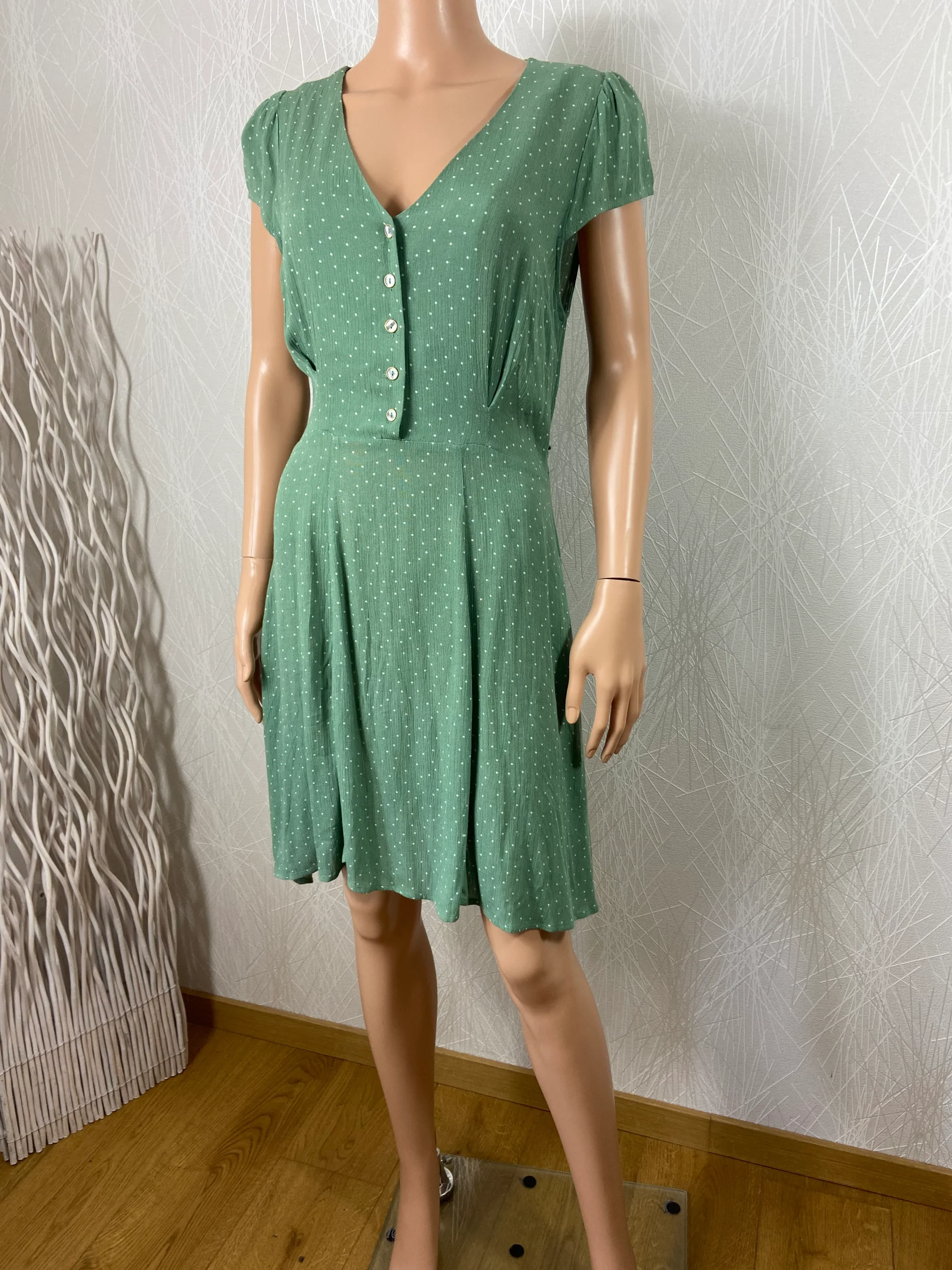 Manches courtes, encolure en V avec boutons dorés et nacrés, tissu à motifs petits pois blanc, cintrée à la taille, flot derrière, 2 poches latérales et fermeture zip sur le côté.