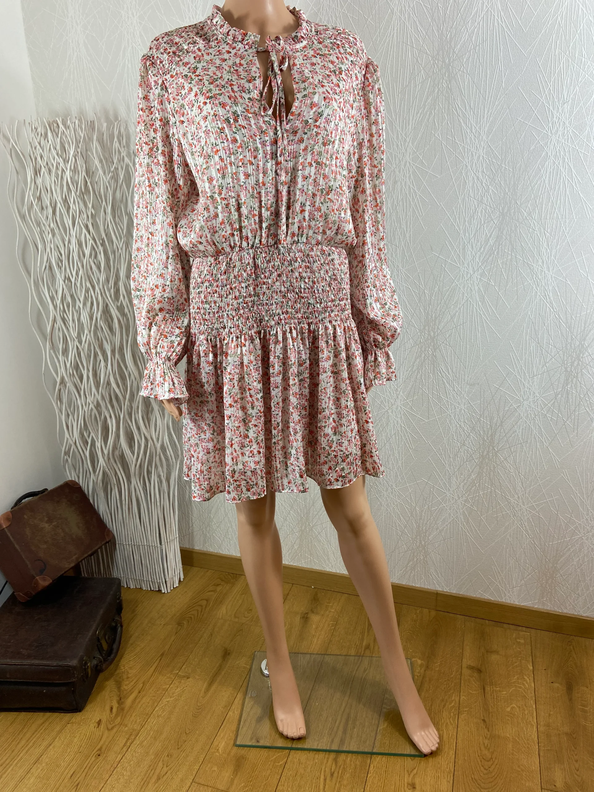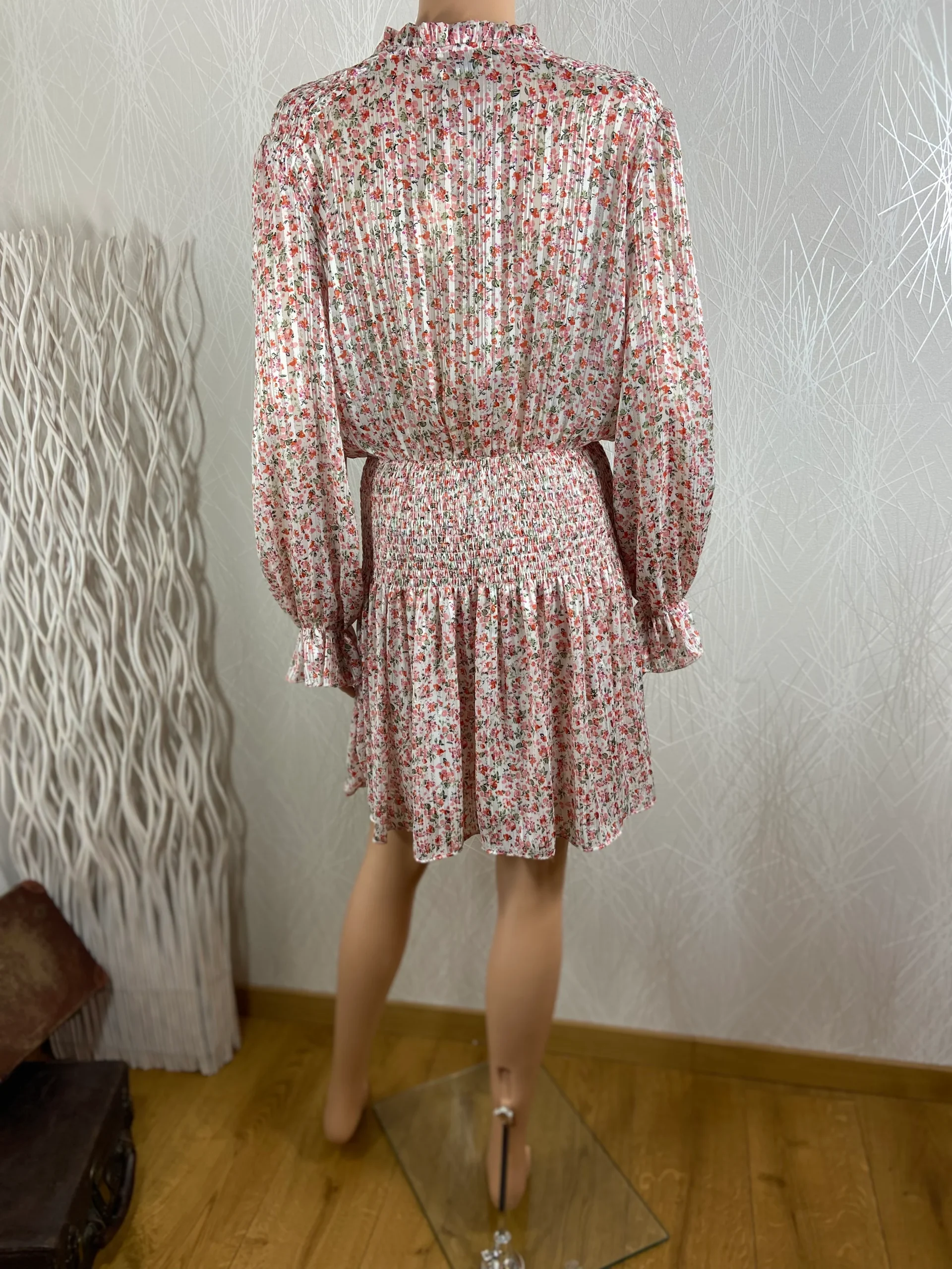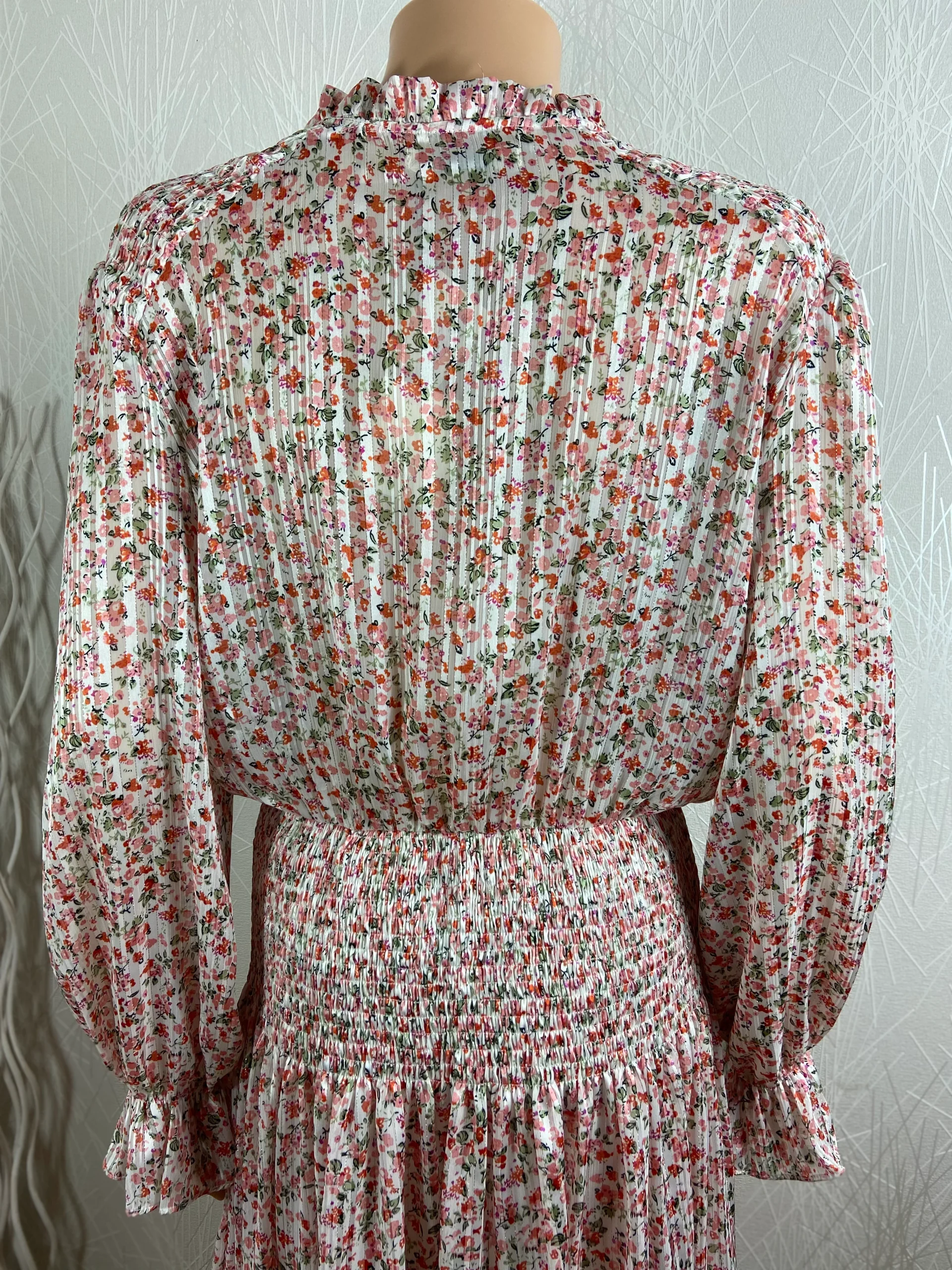 Robe rose midi doublée tissu fleurs manches longues smoks IVIVI