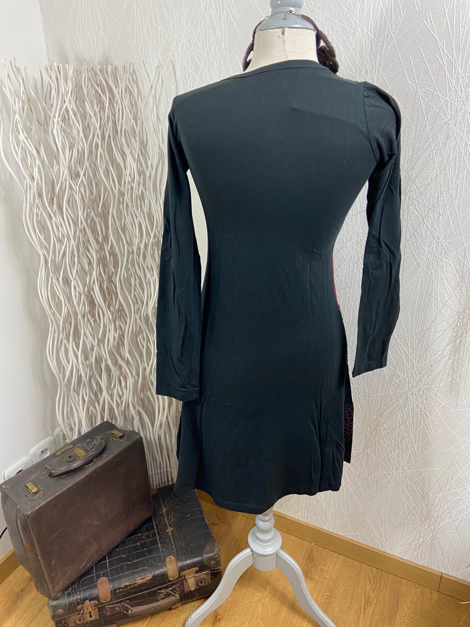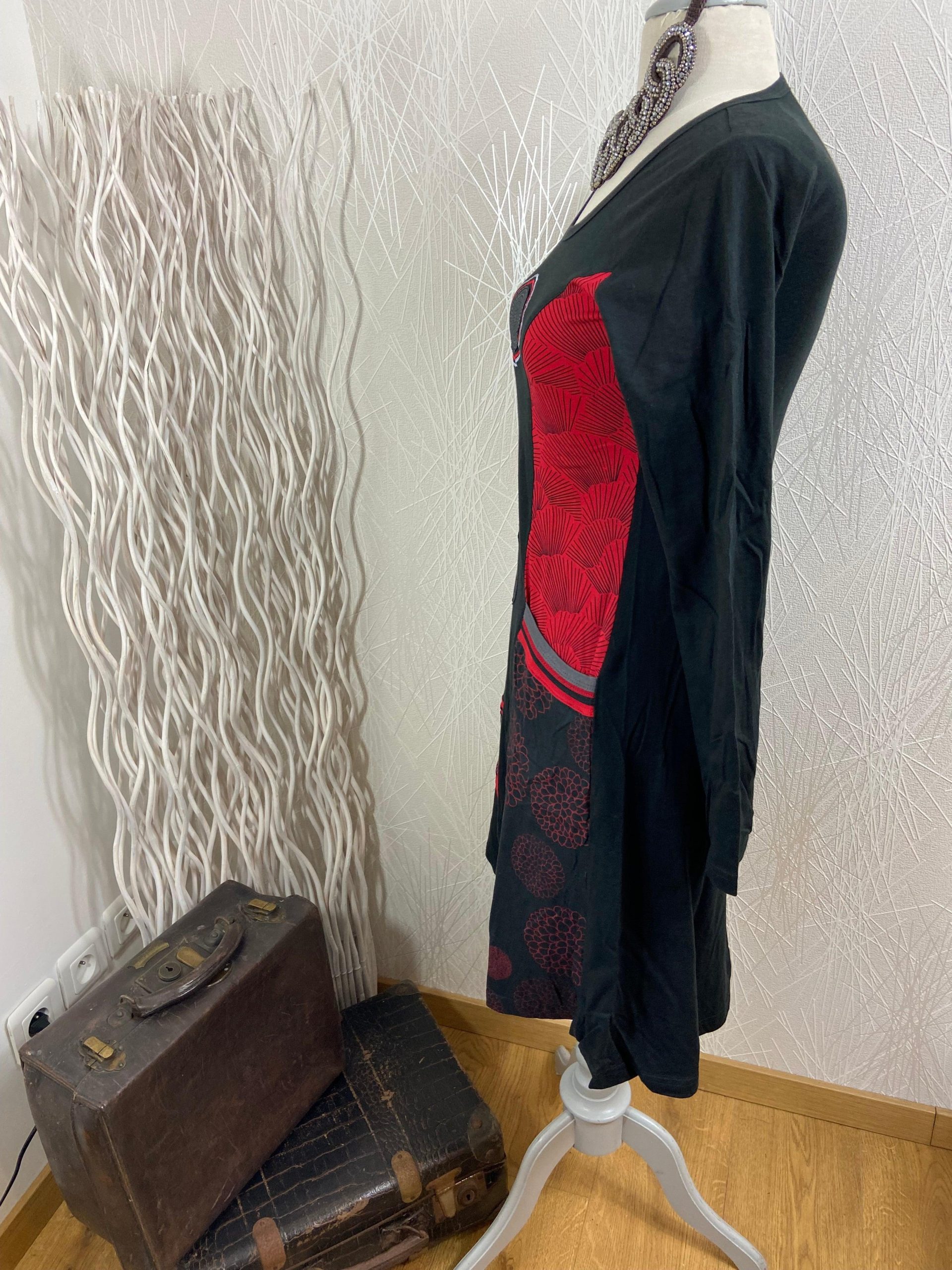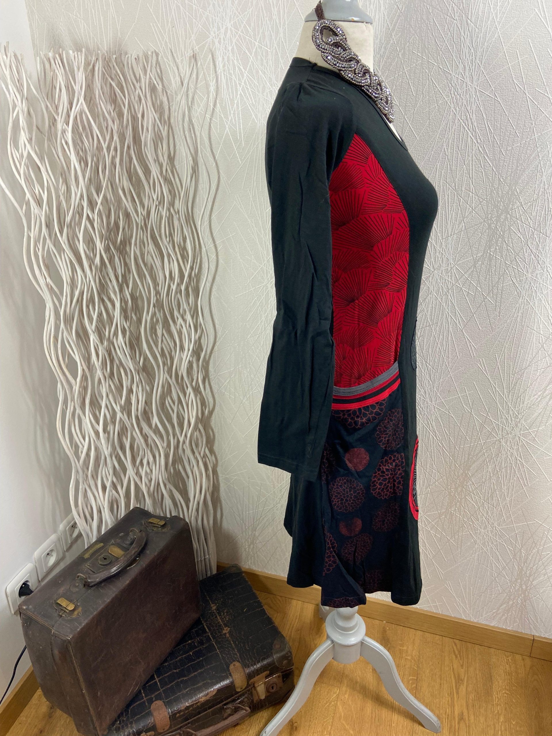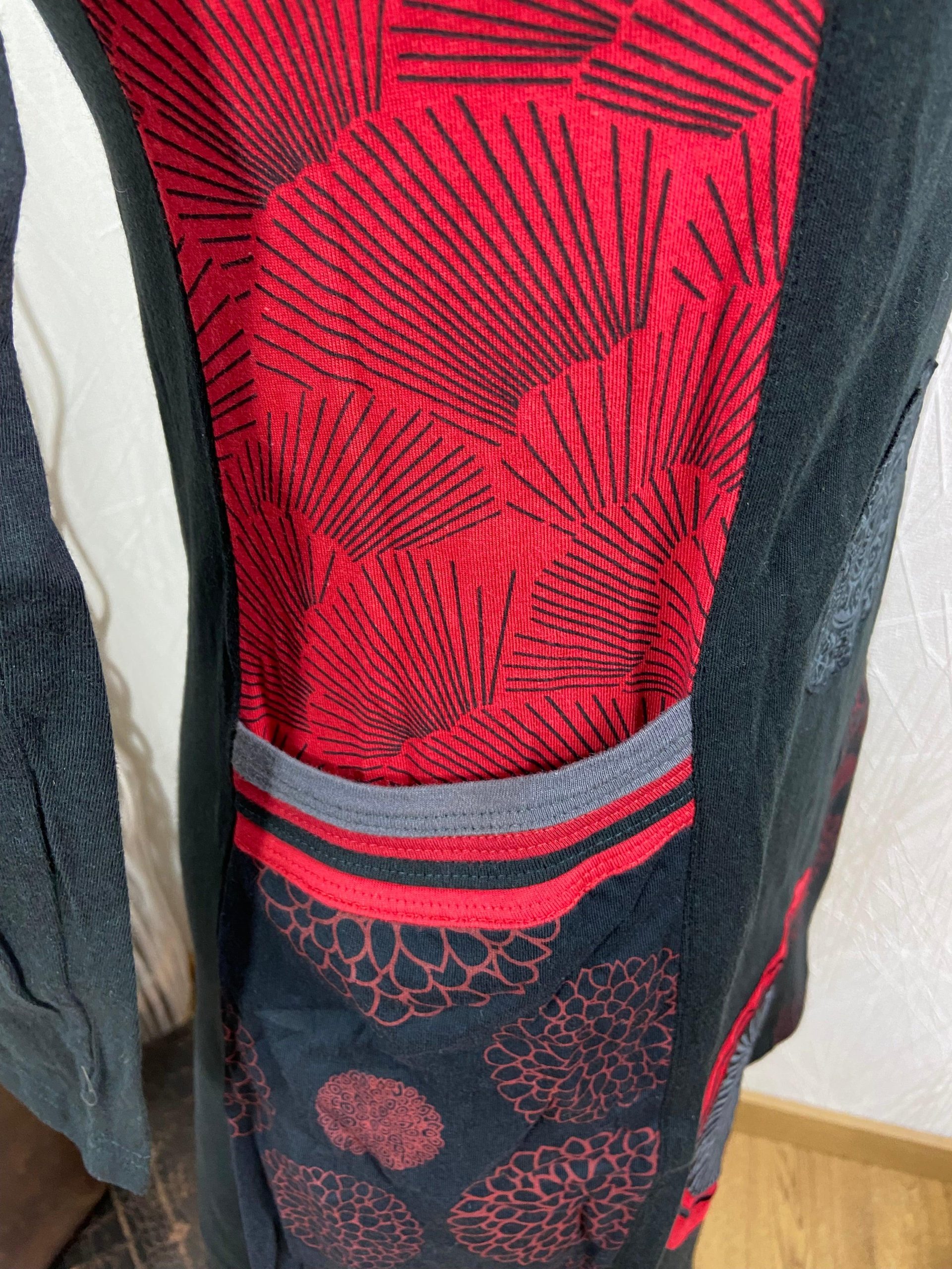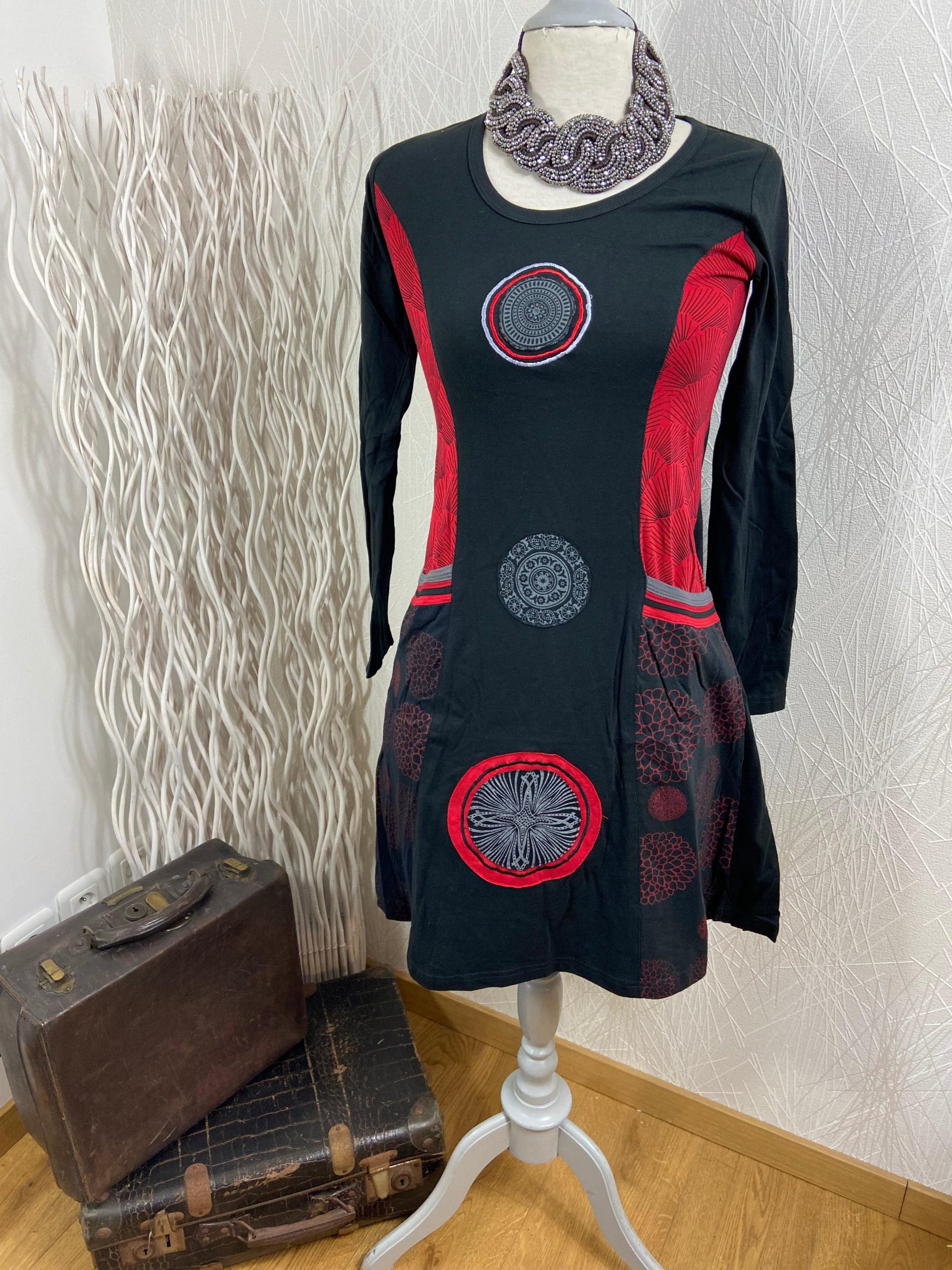 Robe rouge et noire à manches longues avec 2 poches sur les côtés de style hippie chic, fabriquée de manière artisanale.