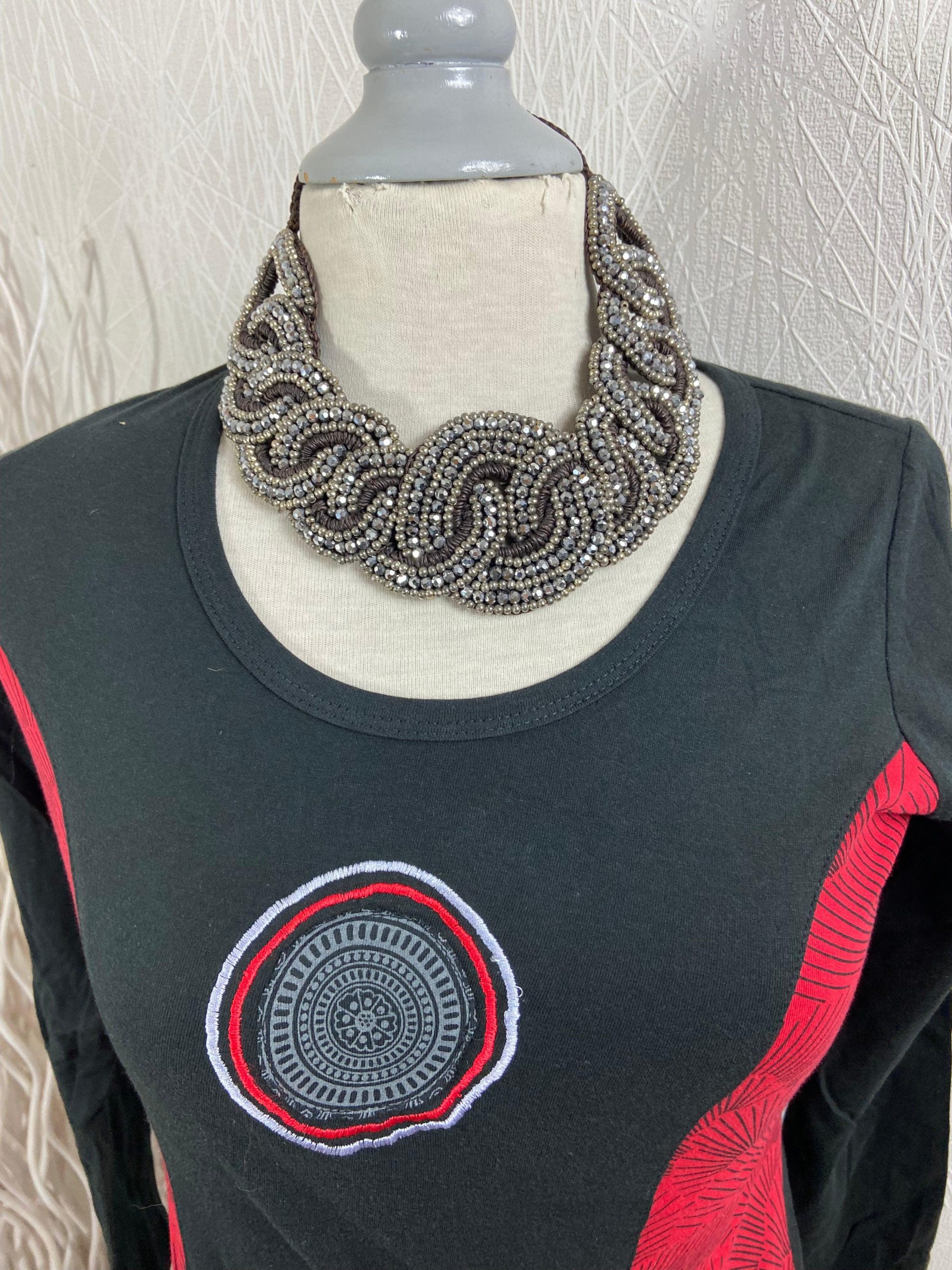 Robe rouge et noire à manches longues avec 2 poches sur les côtés de style hippie chic, fabriquée de manière artisanale.C’est une robe très douce au toucher avec encolure ronde, 2 poches, et des motifs circulaires brodés. Matière : 100 % cotonCouleur : noir, rouge, gris et blanc Marque Aller SimplementDimensions : Largeur épaule : […]