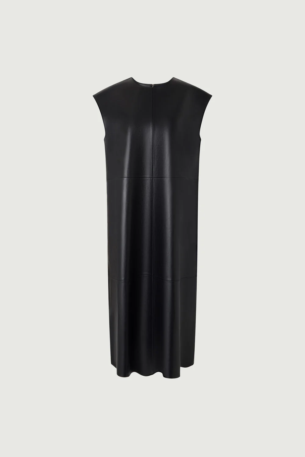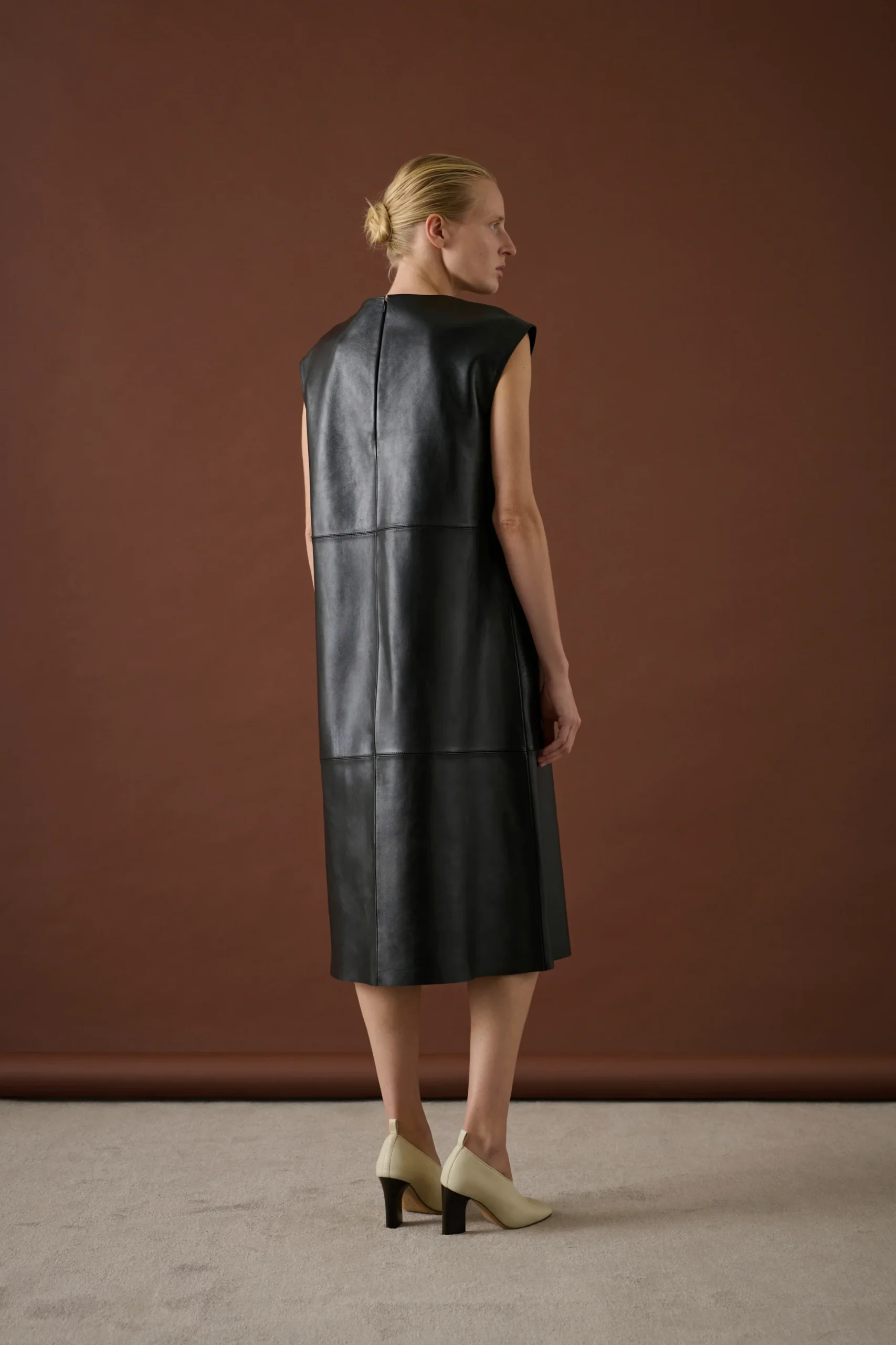 SOFIA est une robe sans manches en cuir d’agneau noir, à la coupe droite et épurée. Inspirée d’une construction minimale, ses découpes horizontales régulières, presque graphiques, lui apportent une modernité discrète.