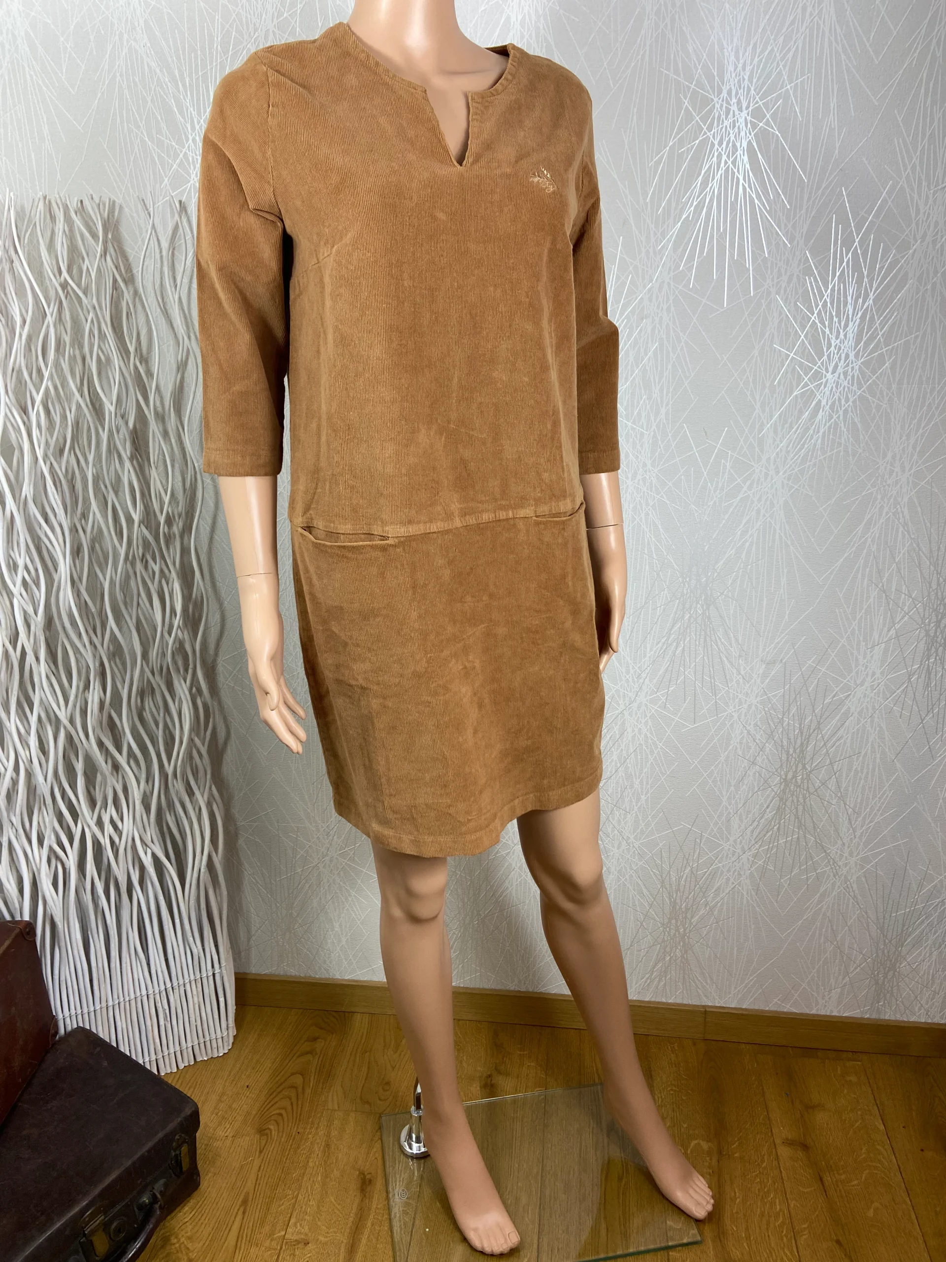 Robe en tissu velours de coton brun camel modèle Esther de la marque Who’s That Girl. Manches 3/4, encolure en V, coupe droite et 2 poches à l’avant. Matière : 97% coton – 3% élasthanne. Couleur : Brun camel Marque : Who’s That Girl Dimensions Taille 34 : Largeur épaule : 35 cm ; tour […]