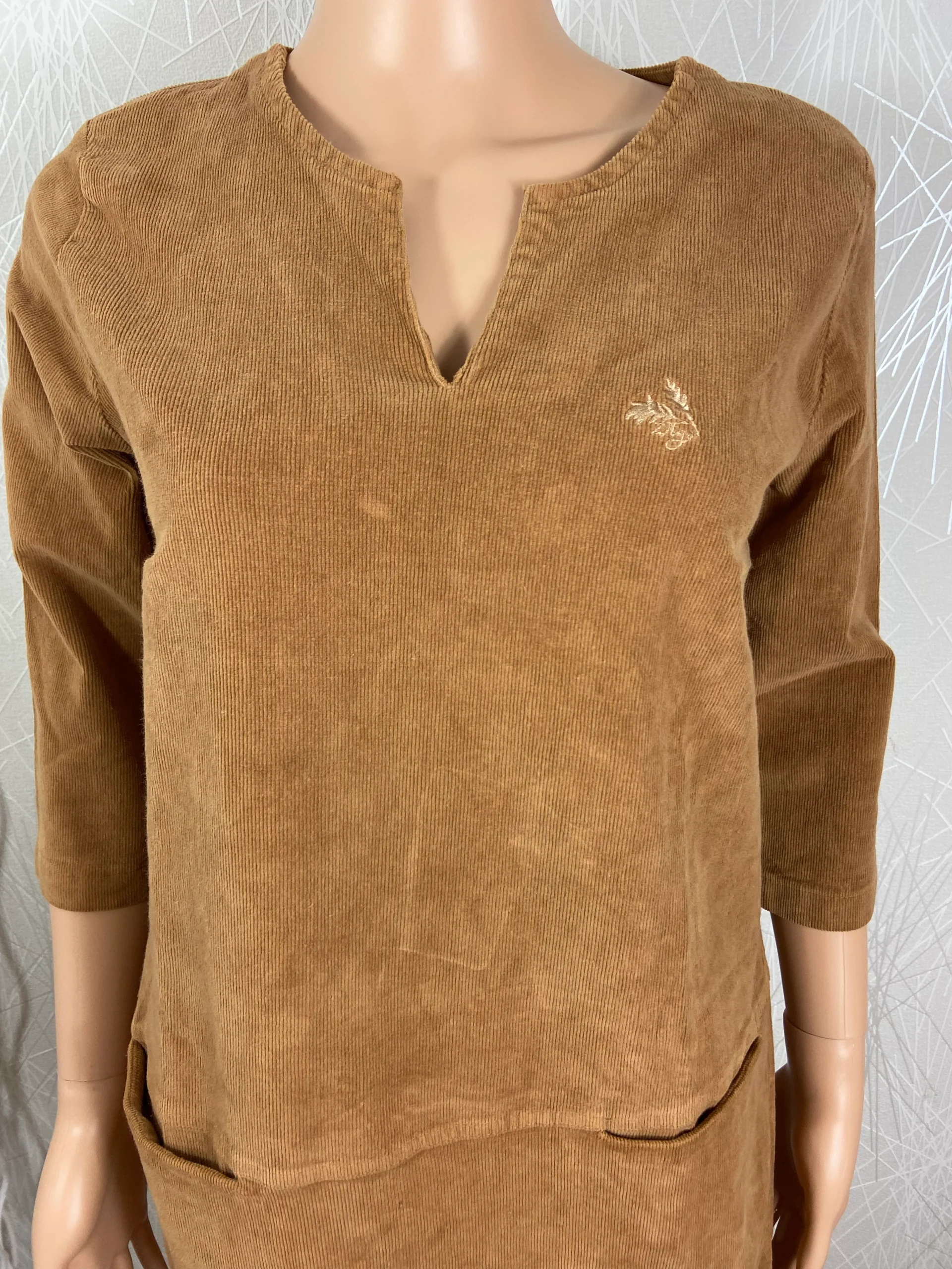 Manches 3/4, encolure en V, coupe droite et 2 poches à l’avant.