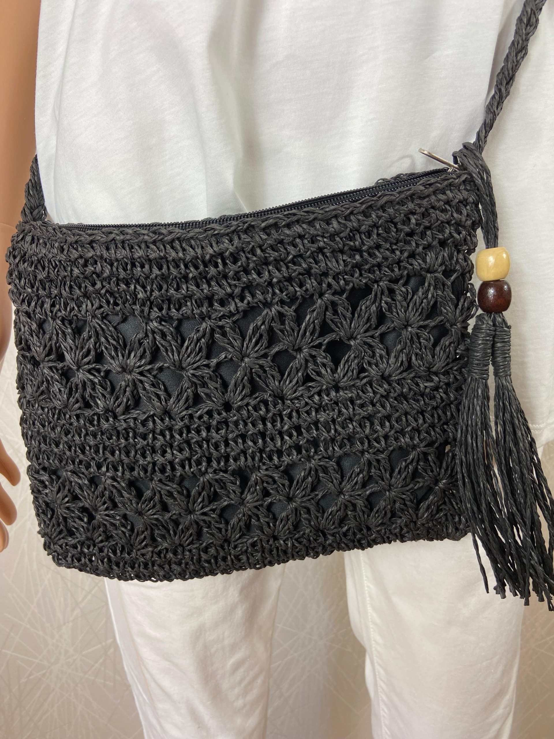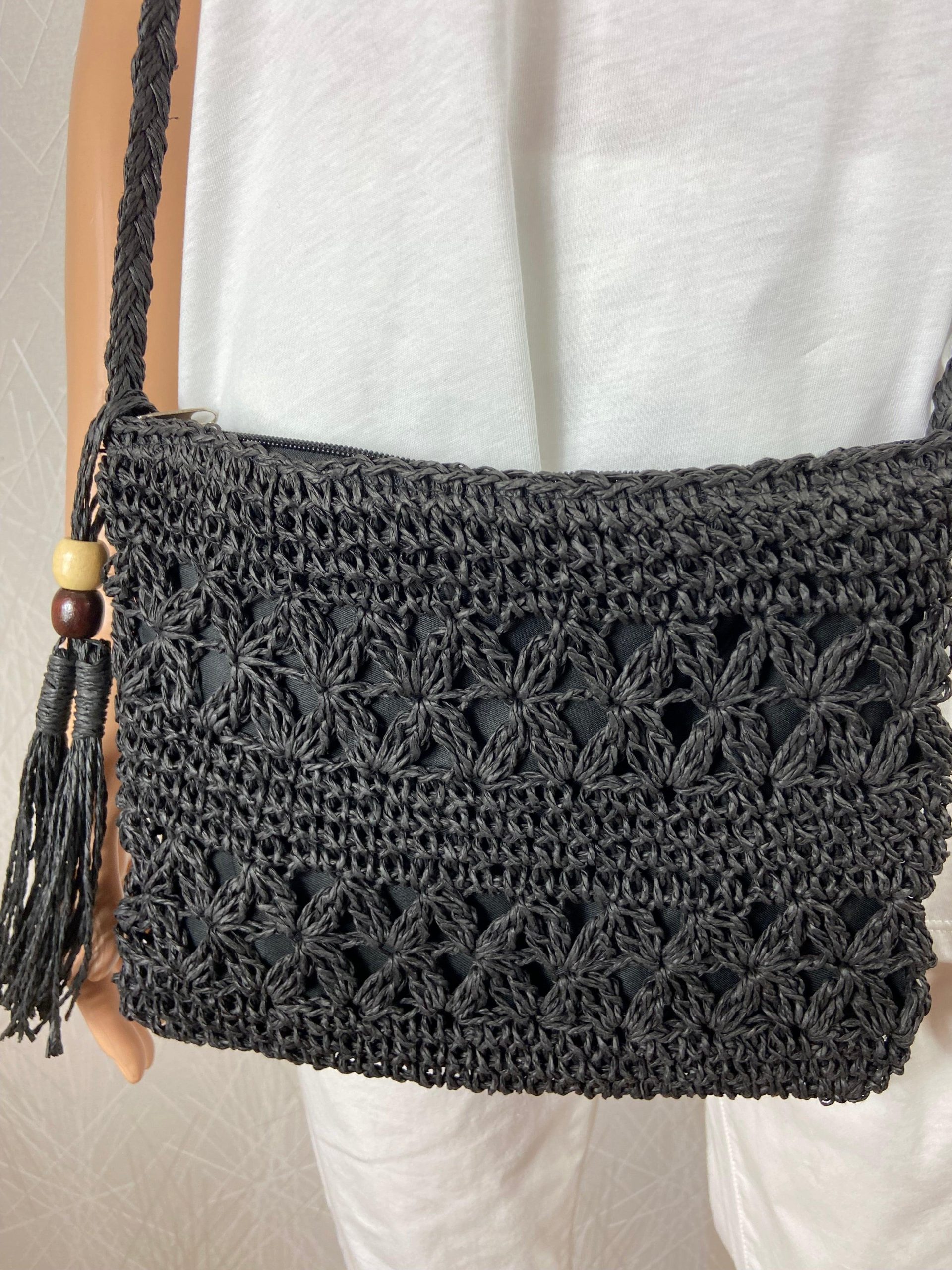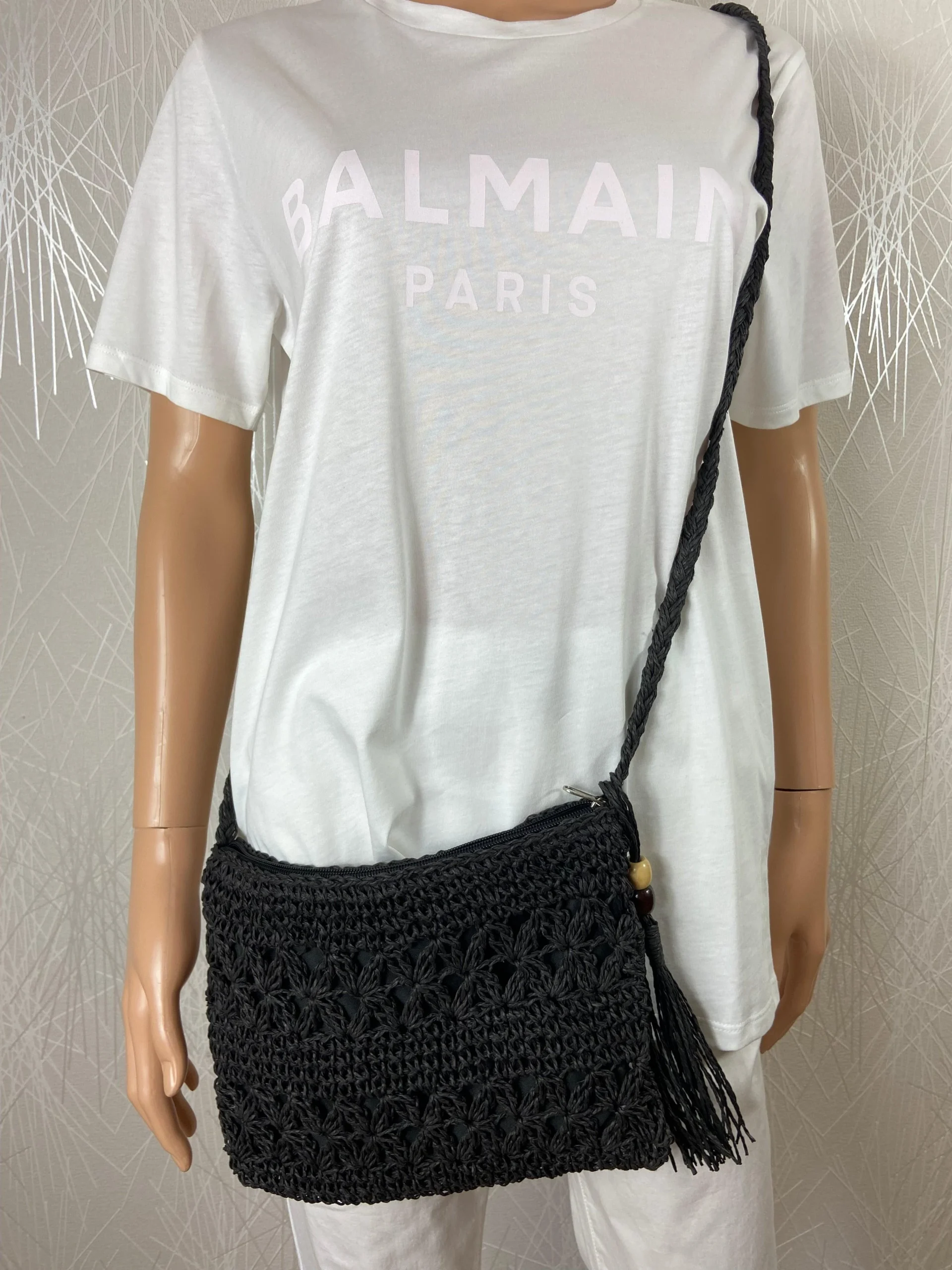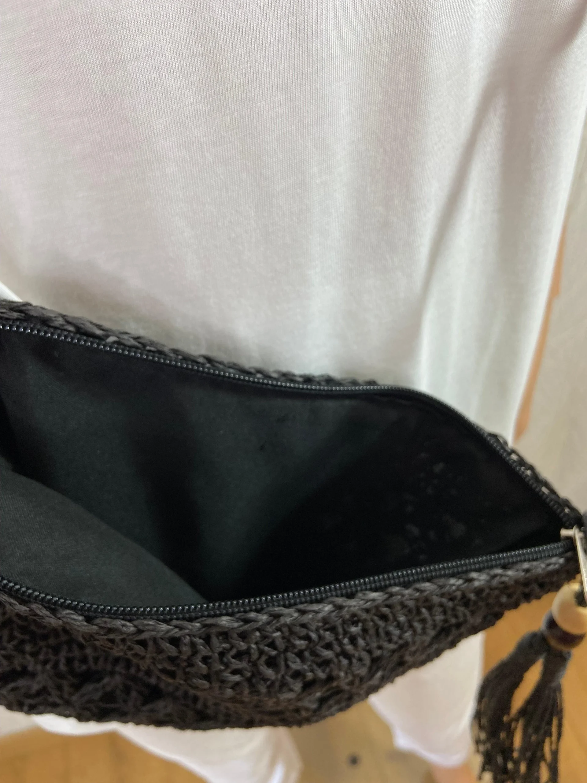 Sac à bandoulière pour femme en raphia noir, doublé tissu et fermeture du sac avec zip.