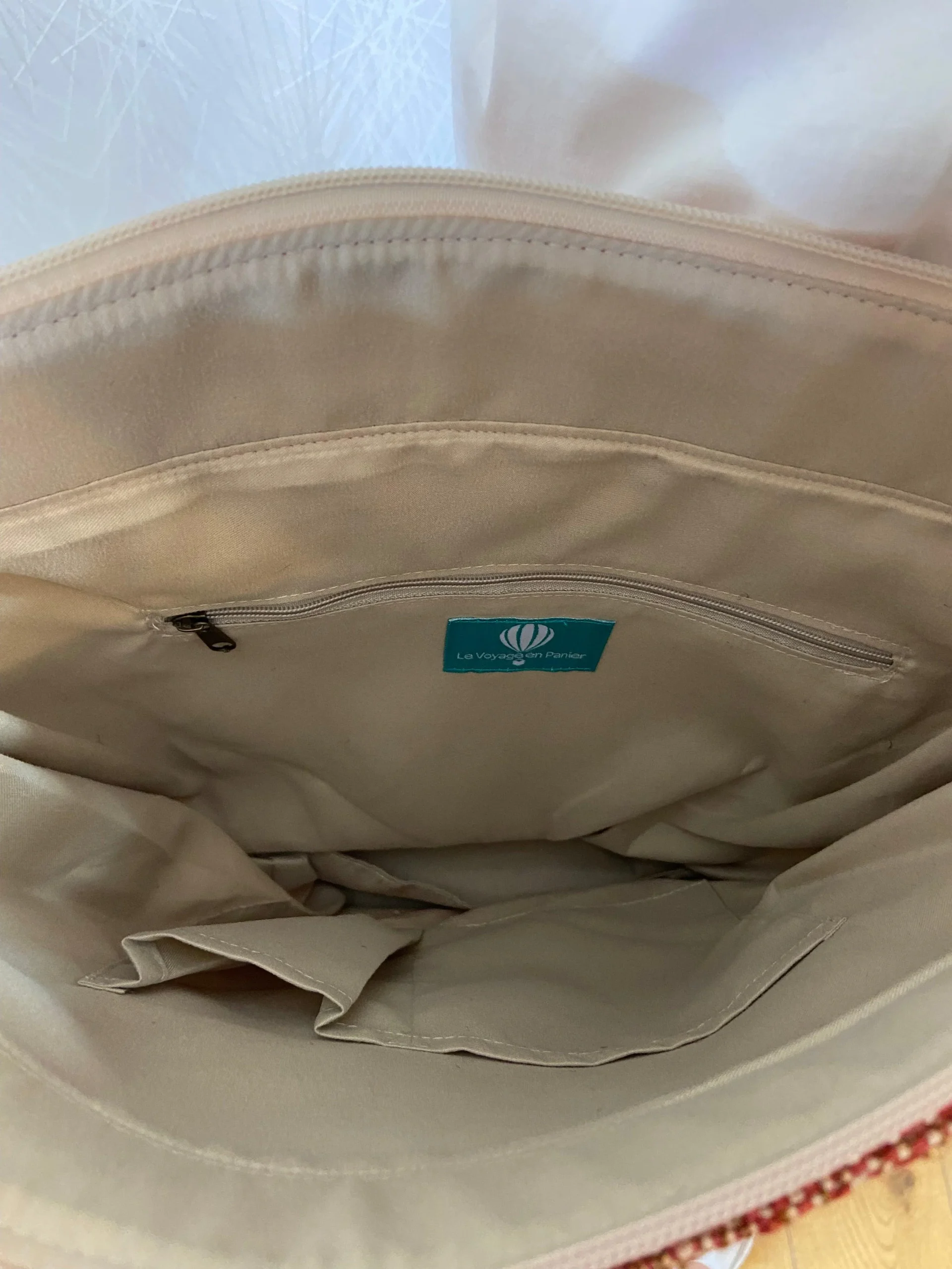 Bandoulière réglable, tissu doublé, 3 poches intérieures dont une avec zip, poche extérieure avec zip.