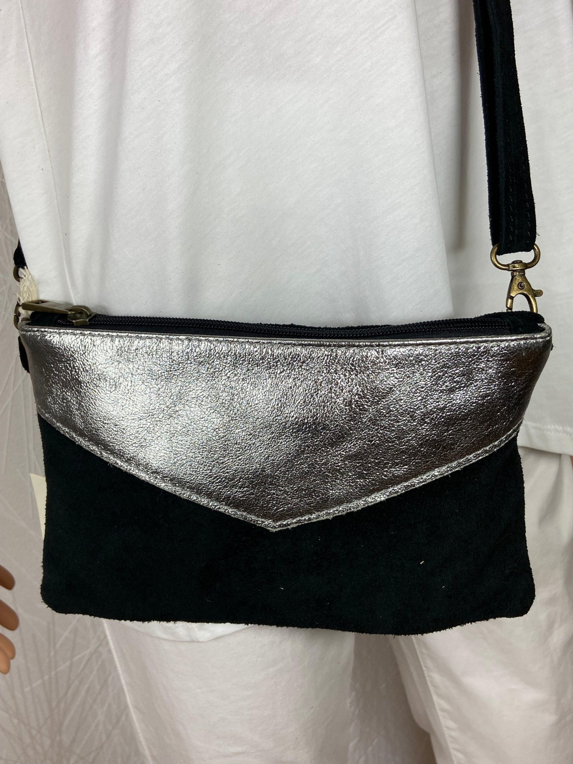 Sac à bandoulière réglable en cuir de vachette noir et argent Cherry Paris