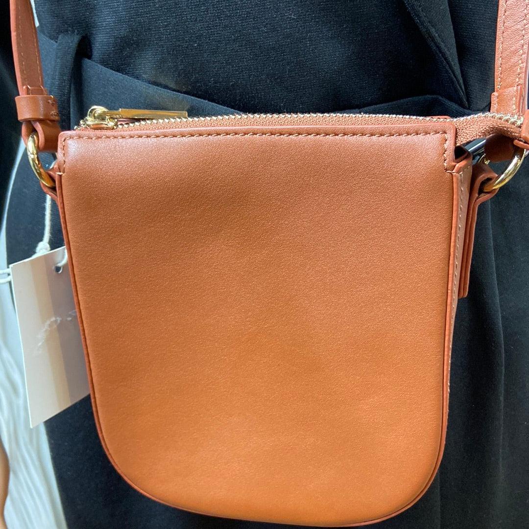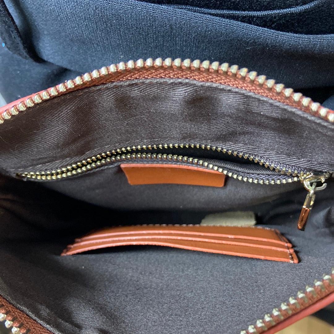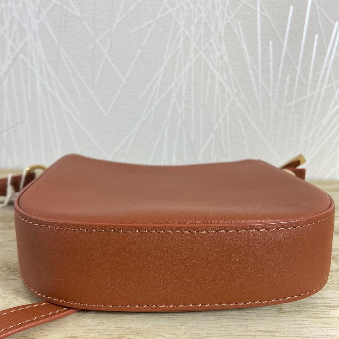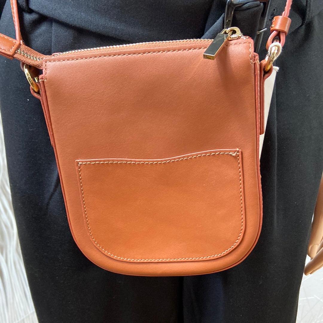 Sac à bandoulière marron en cuir synthétique pour femme, bandoulière réglable, 4 poches intérieures dont une avec zip et une poche extérieure.