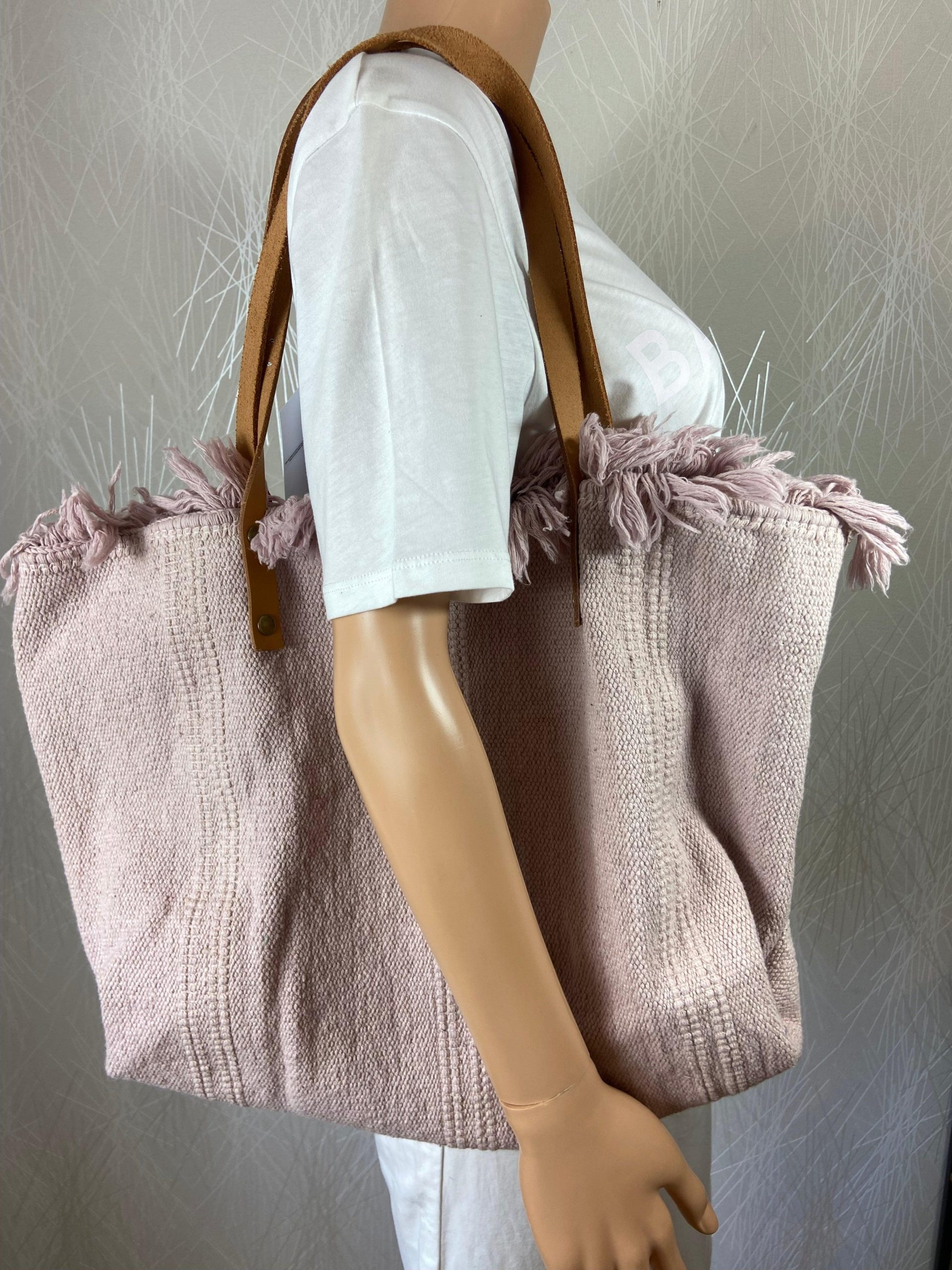 Sac à main rose pâle en coton de la marque Folle Tête de tigre sur l’avant, franges, anses et fermeture avec bouton aimanté. Couleur : Rose Marque : Folle Taille Unique – Réf : TUNS5305 Dimensions : Largeur : 50 cm ; hauteur : 32 cm ; hauteur anses : 20 cm