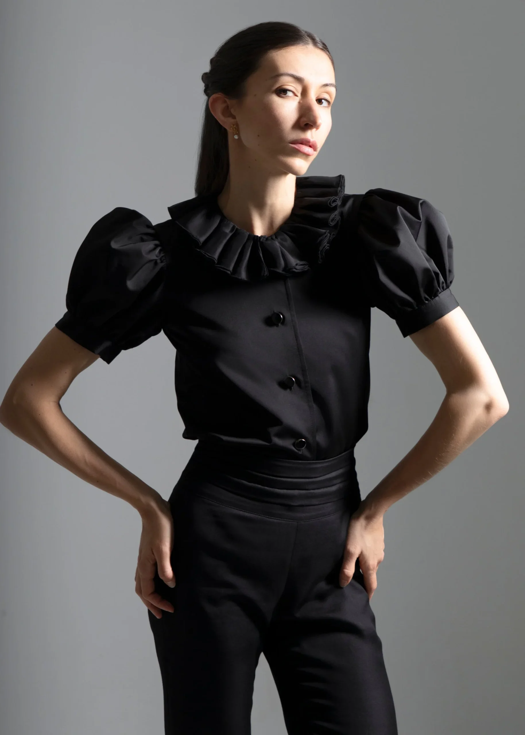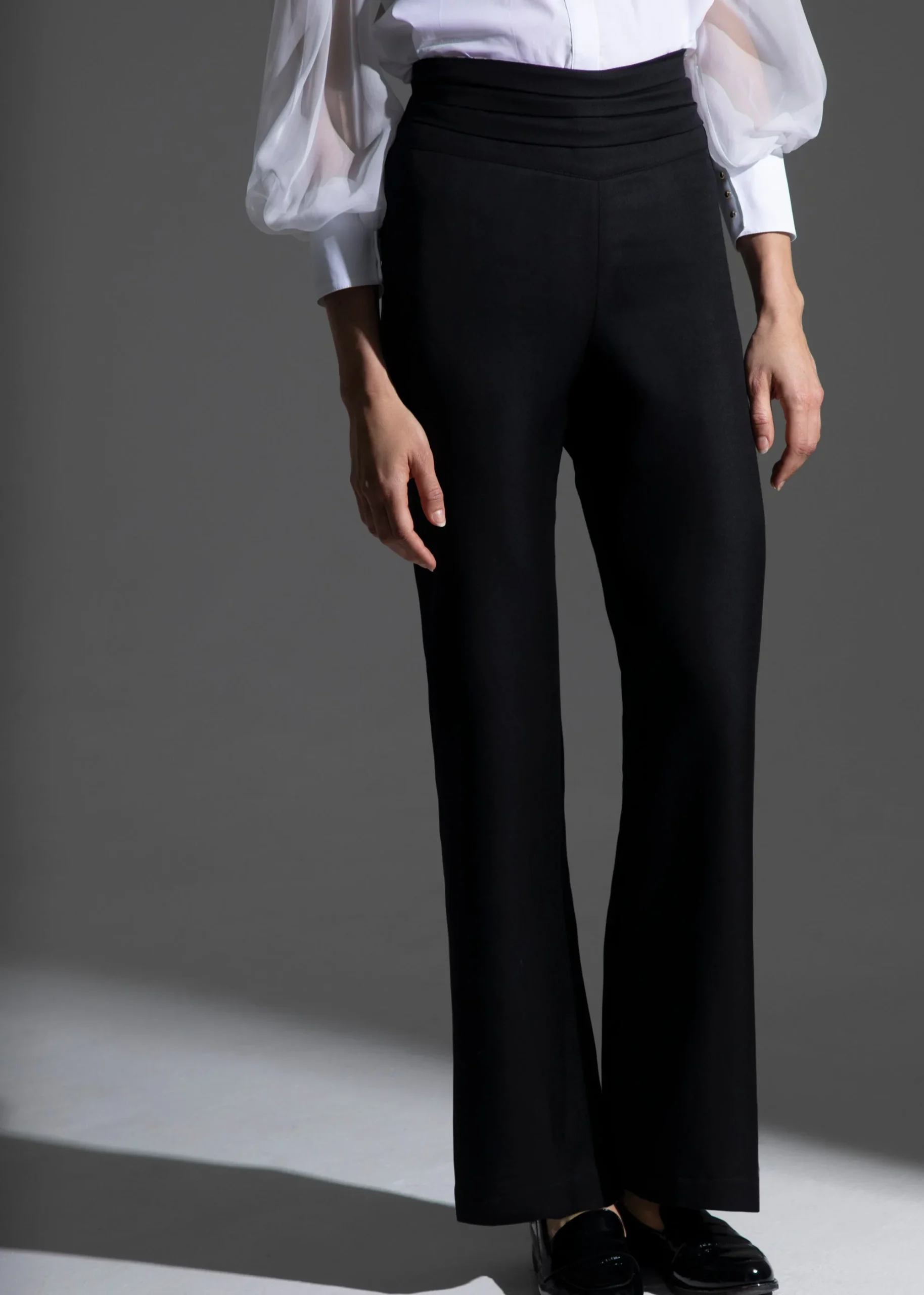 Sa taille est soulignée par une ceinture plissée horizontale, inspirée du smoking masculin, qui apporte une touche d’audace et de sophistication discrète. Le jeu subtil entre ombre et lumière sur ses matières nobles souligne le tombé impeccable et la profondeur du noir.