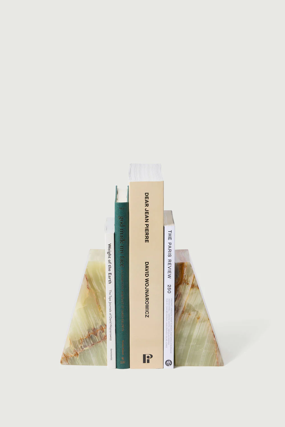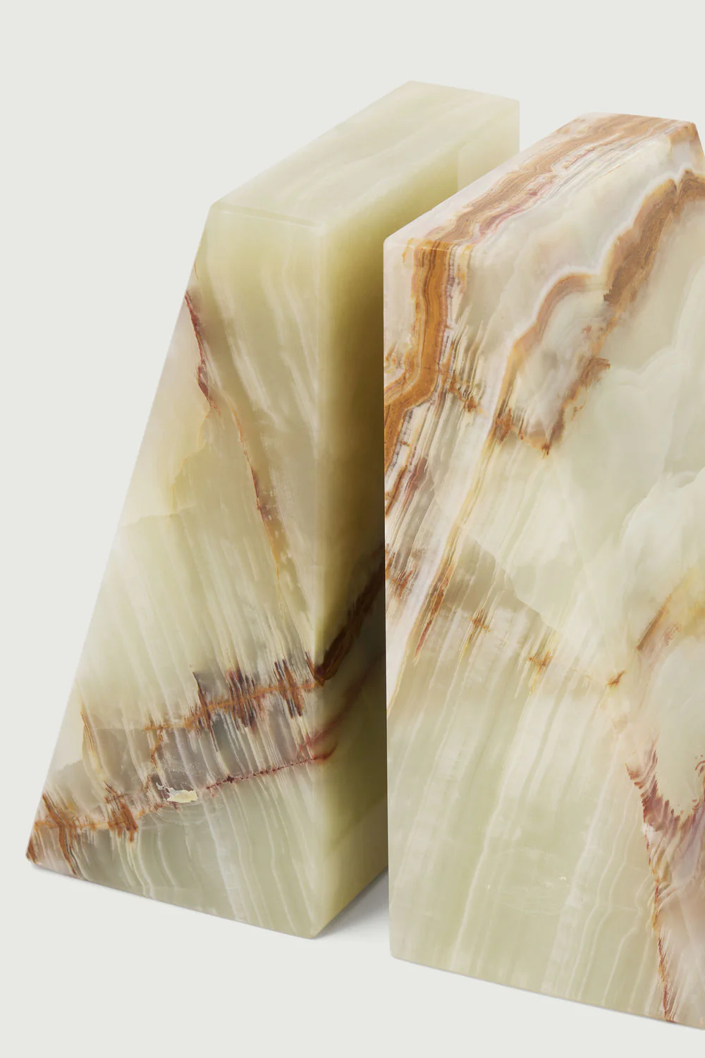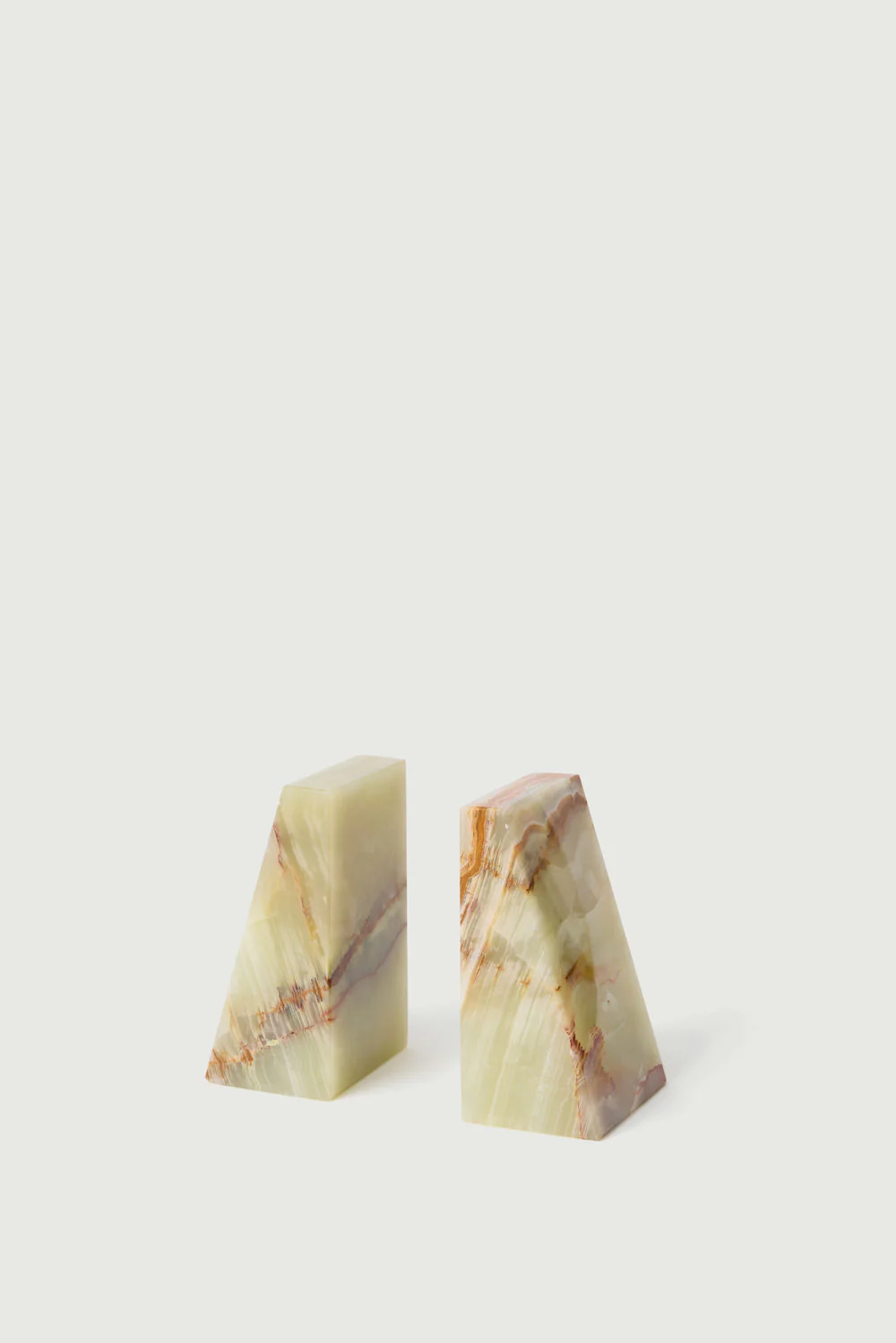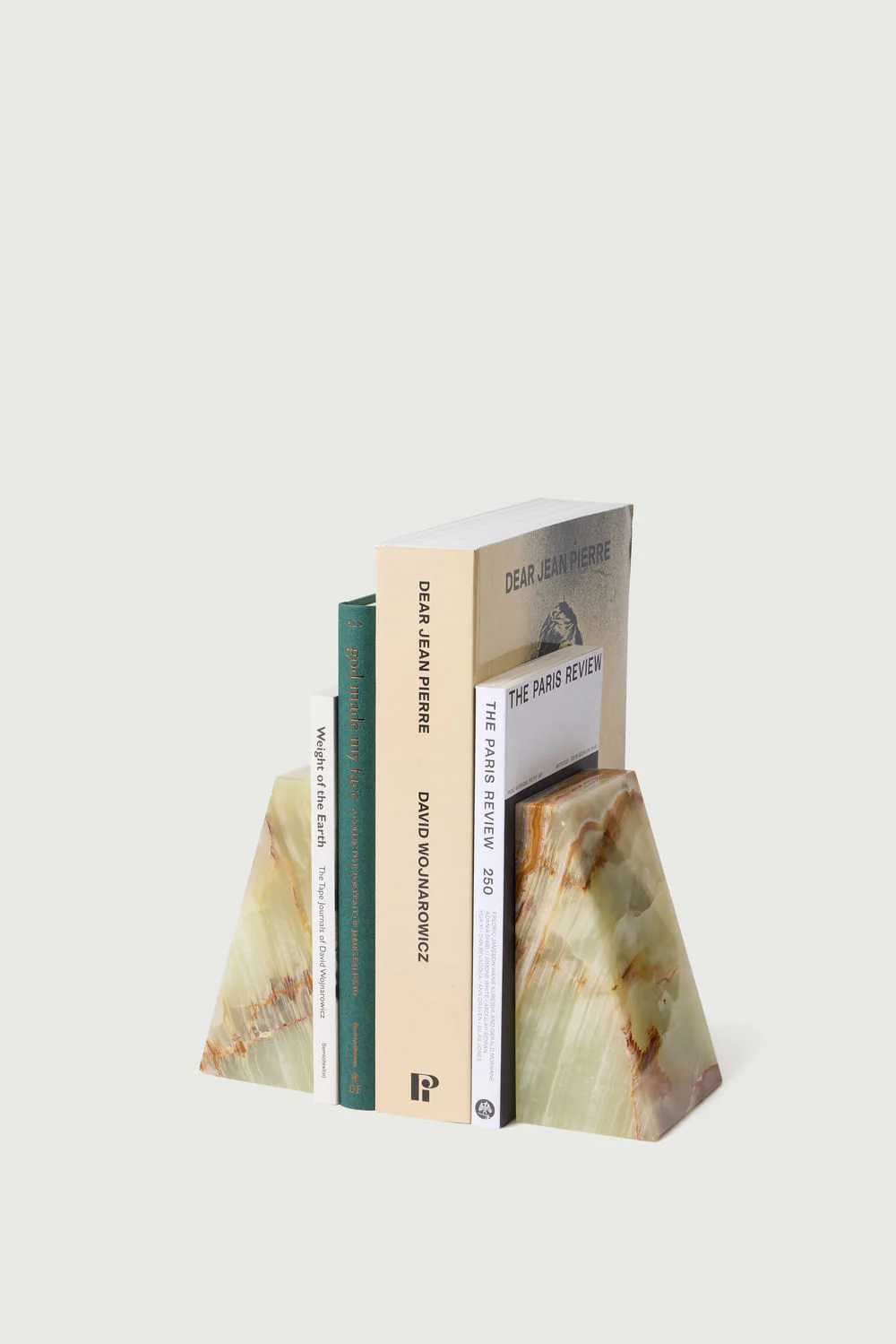 – Serre-livres en marbre d’onyx (paire)– Période : milieu 20e siècle – Bon état – Dimensions : longueur 15 cm ; profondeur 7,5 cm ; hauteur 10 cm– Poids : 4,1 kg (paire)