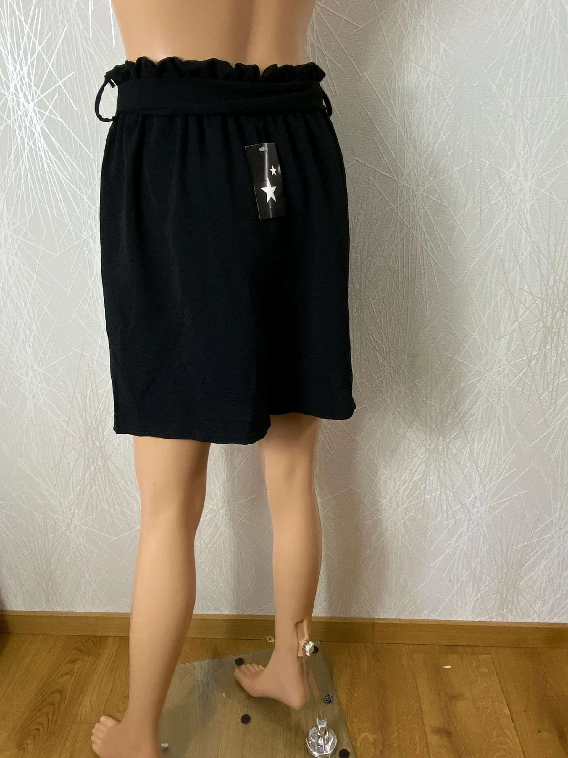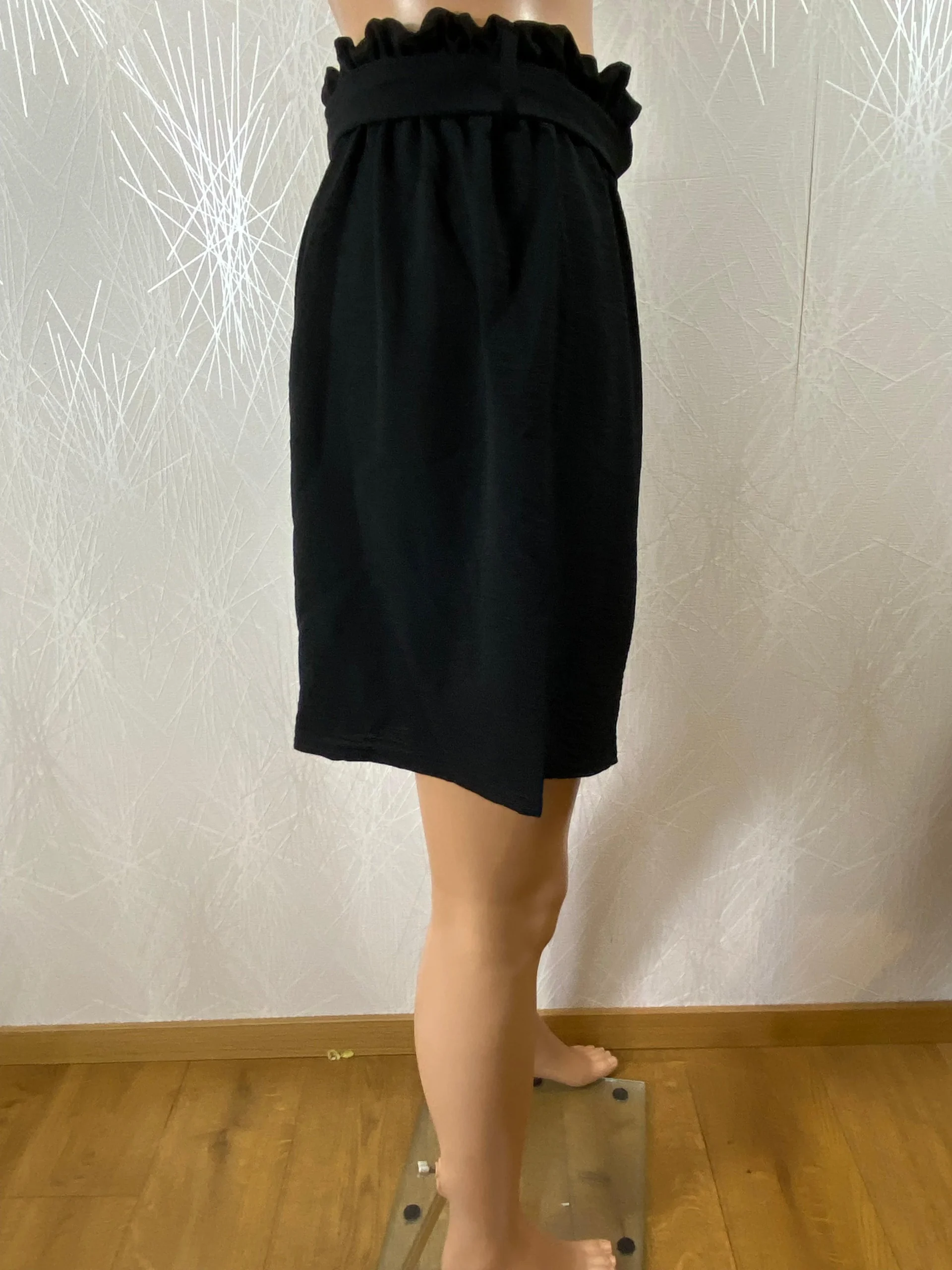 Short noir pour femme, taille élastique, ceinture en tissu à nouer et coupe fluide. Bonne fabrication Française. Matière : 100% polyester Couleur : Noir Taille Unique – Réf : TUNS5132 Dimensions : Tour de taille : de 72 cm à 90 cm ; longueur entrejambe : 10 cm ; longueur : 44 cm.