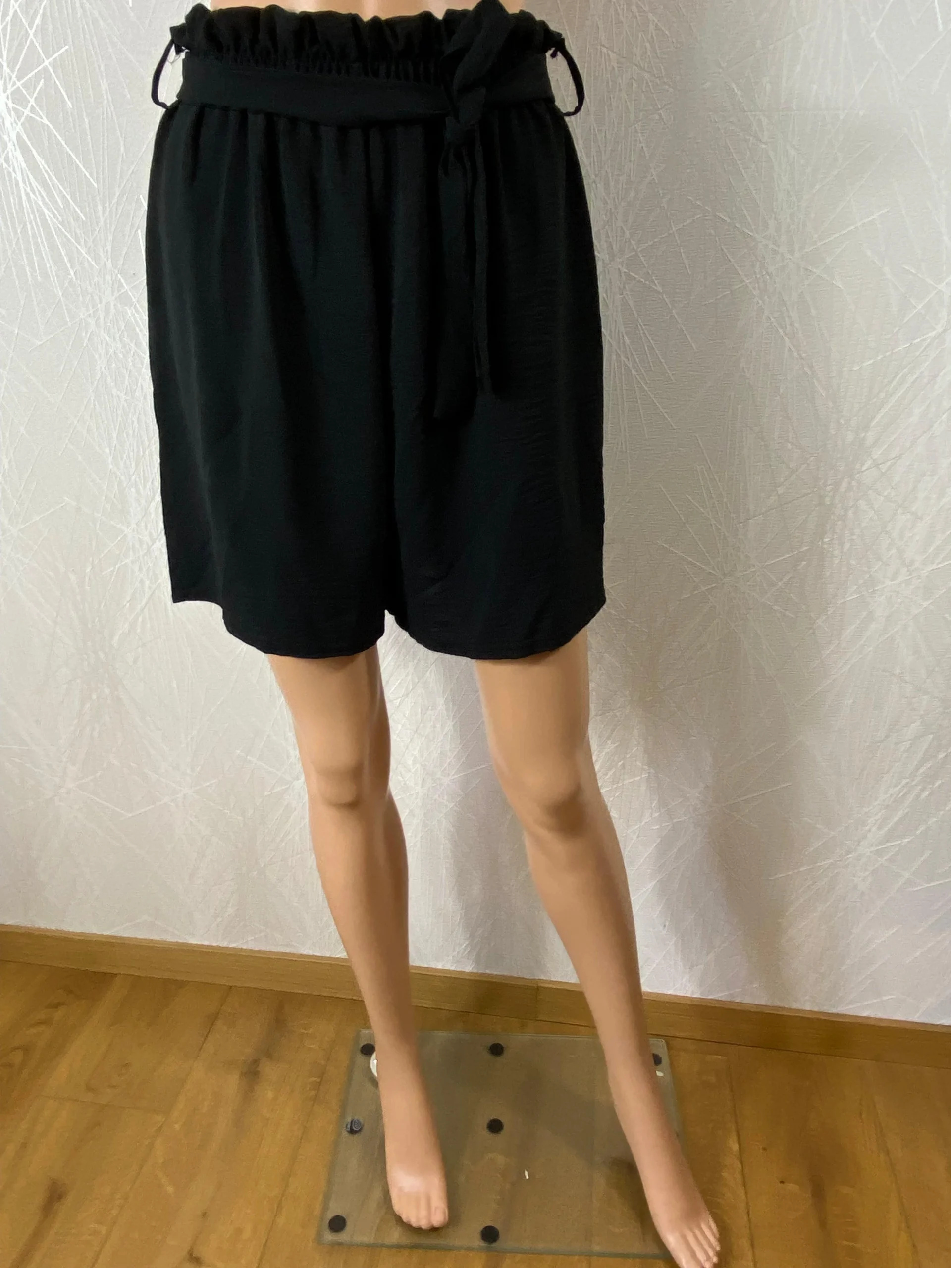 Short noir pour femme, taille élastique, ceinture en tissu à nouer et coupe fluide.