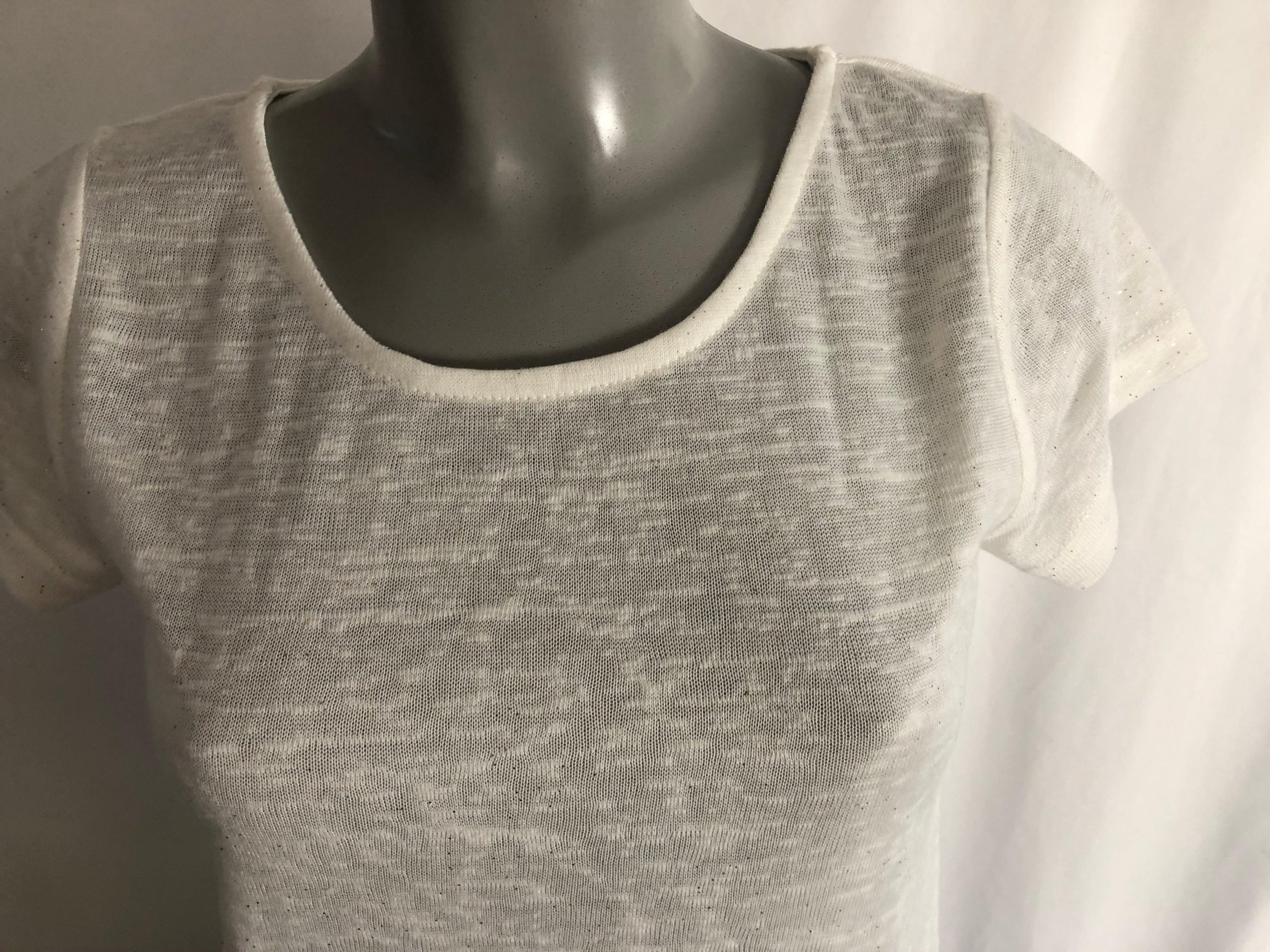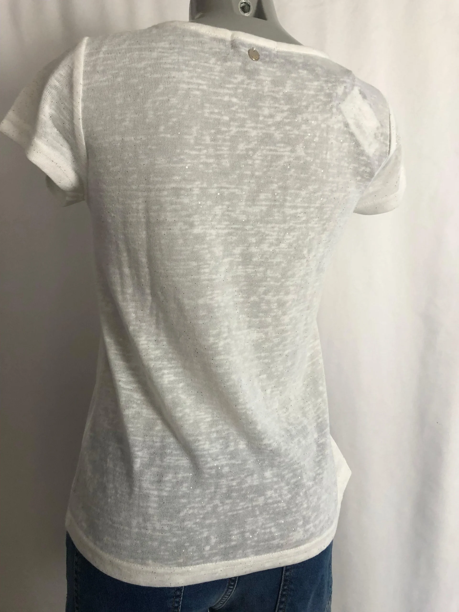Ce joli T-shirt blanc et or à mailles à effet pailleté à des manches courtes, une coupe droite et un col rond.
