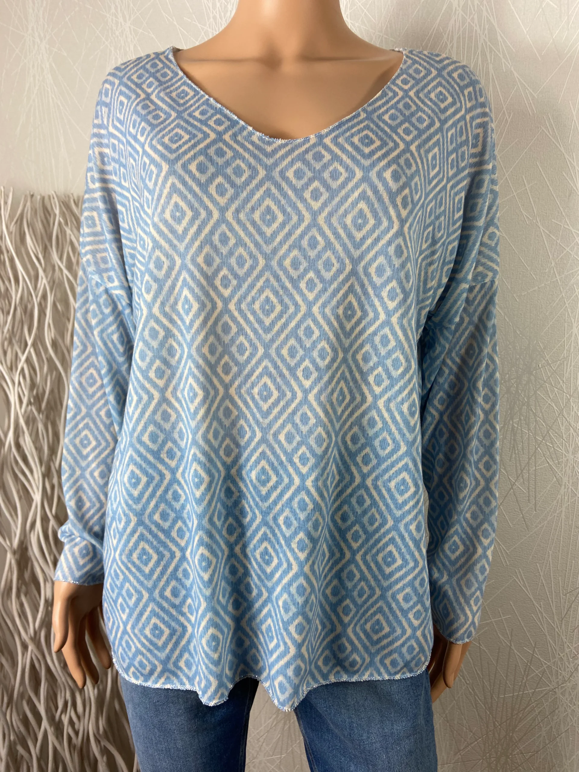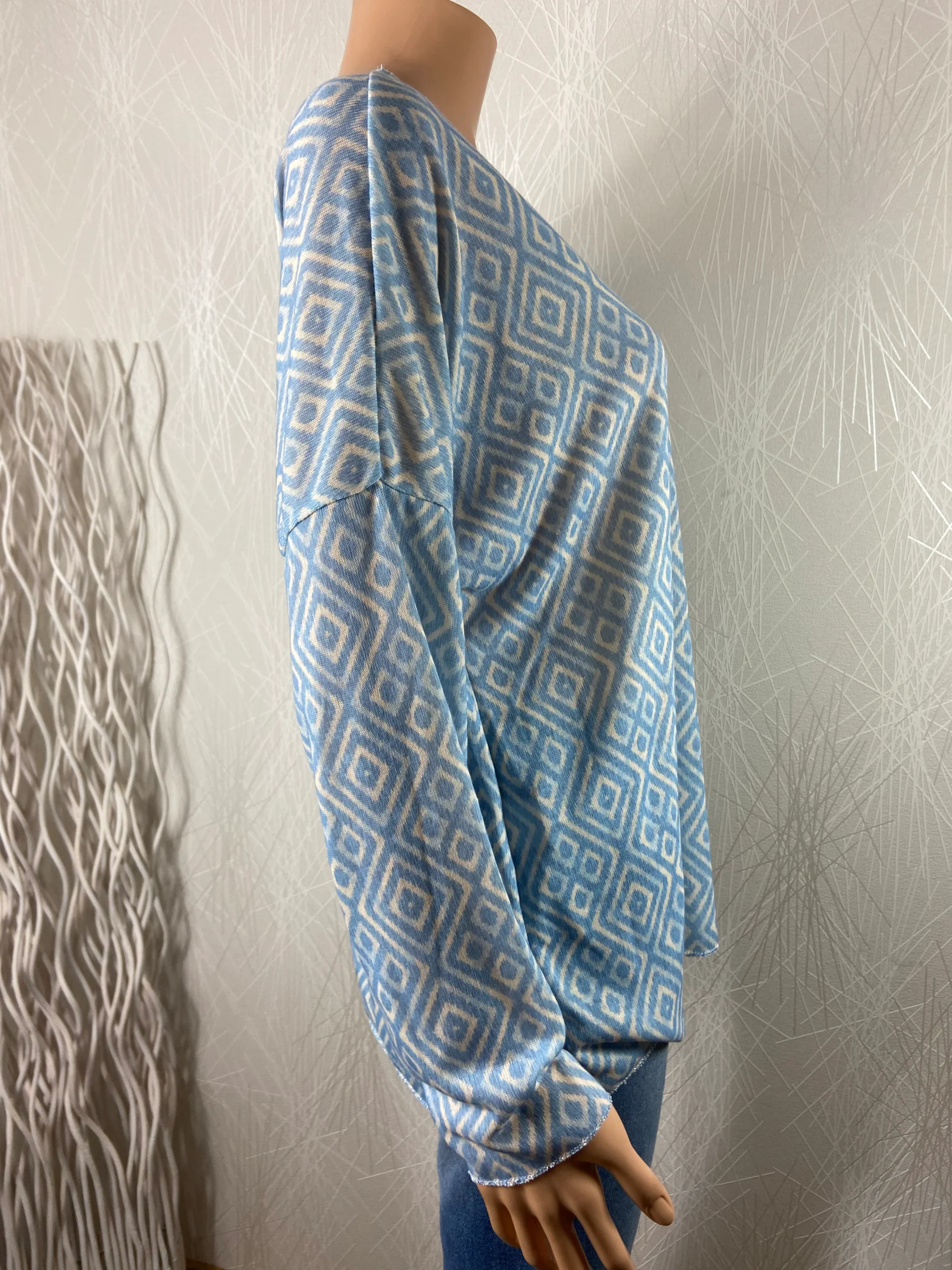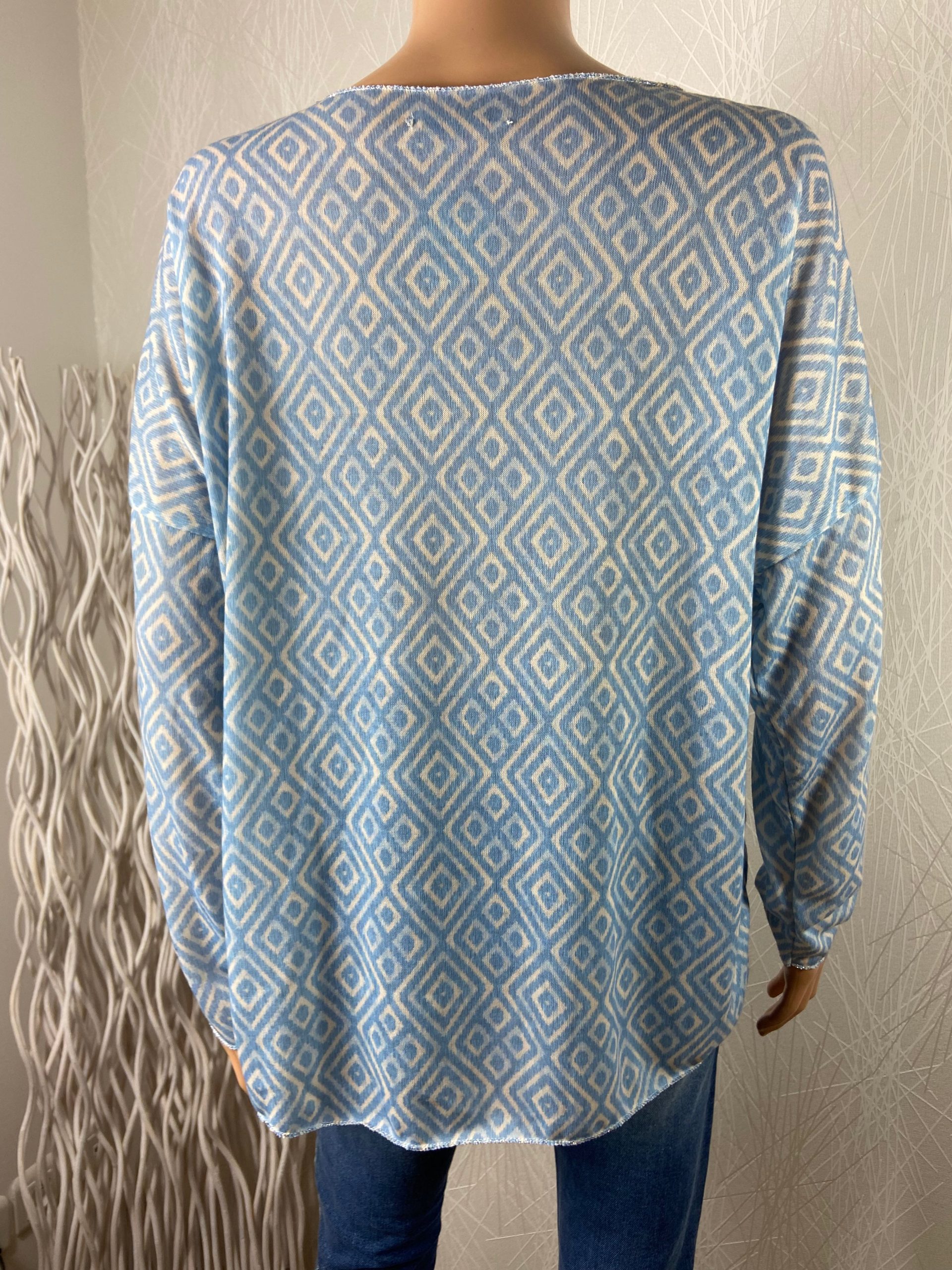 T-shirt à manches longues et encolure V de la marque New Collection. Col, bas de manches et bas de vêtement surfilées en fil argenté. Coupe droite et tissu jersey. Composition : 50% coton / 50% viscose Couleur : bleu et blanc Taille Unique – Réf : TUDT1124 Dimensions : tour de poitrine : 110 cm […]