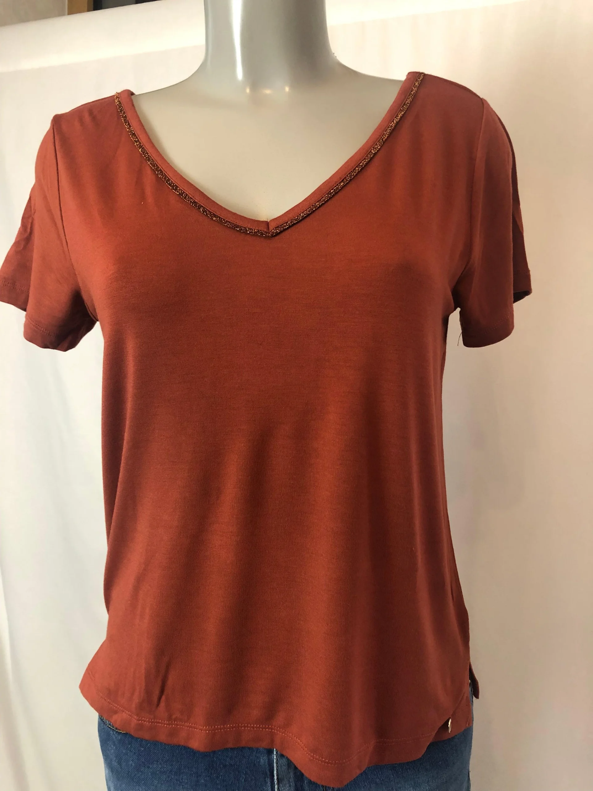 Ce joli T-shirt a une coupe fluide et droite, une encolure pailletée en V et des manches courtes.